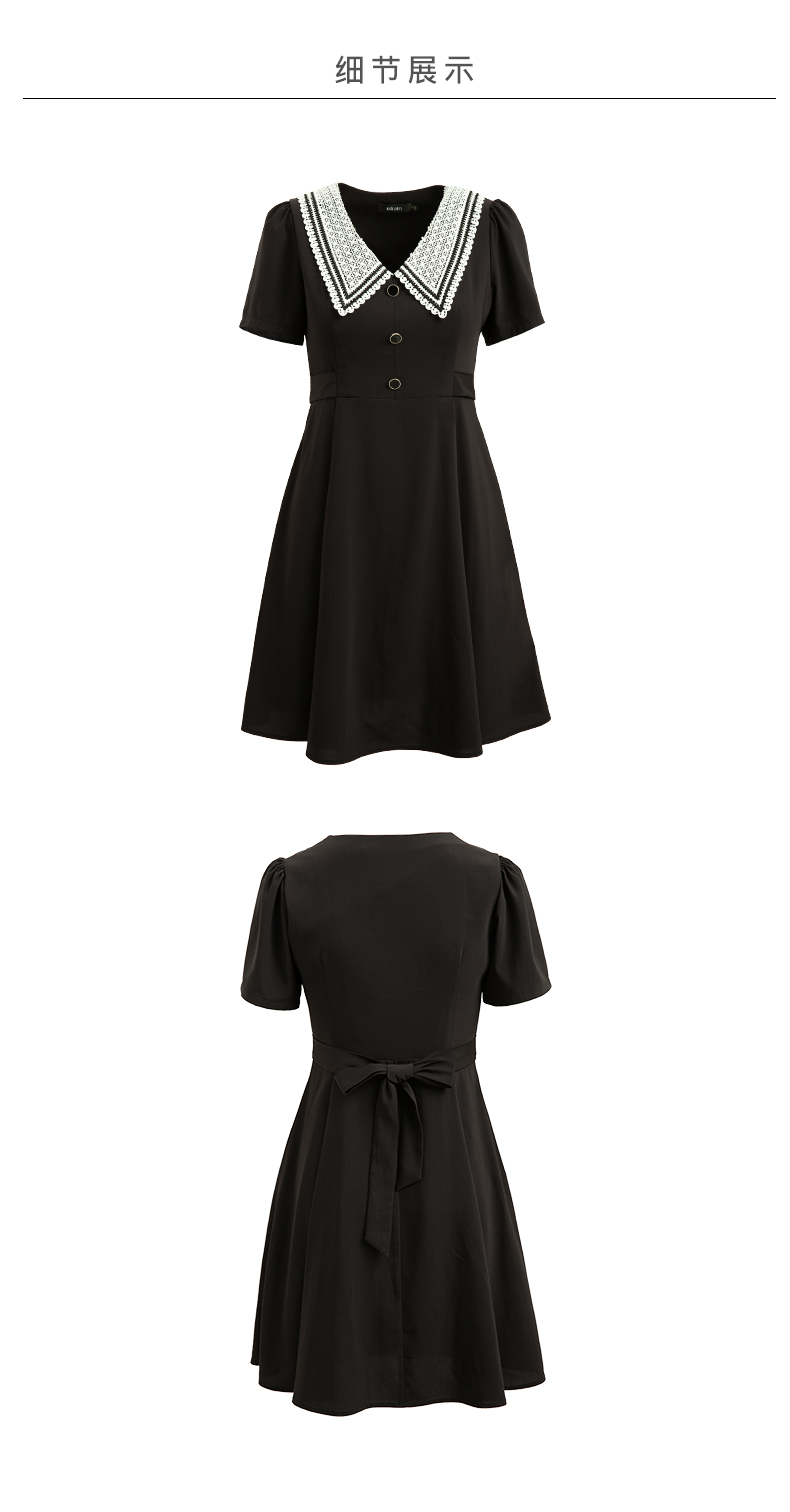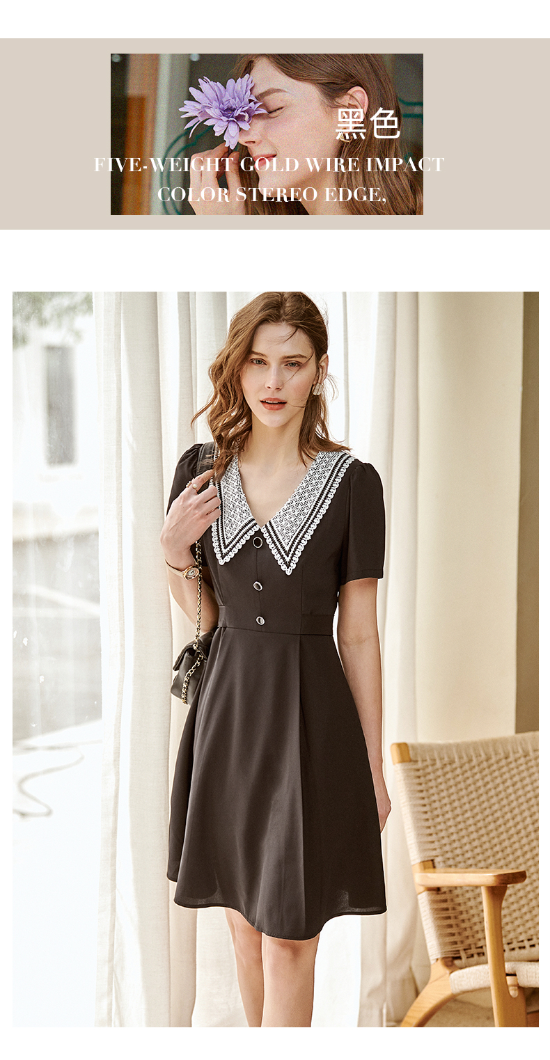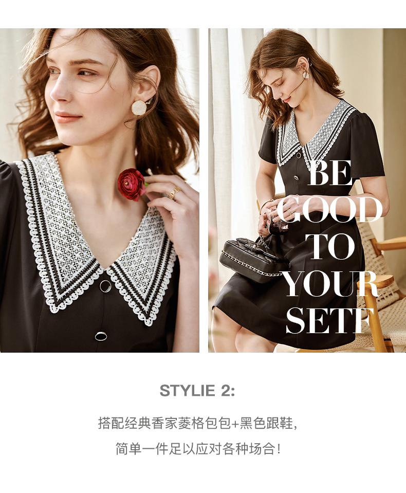 欧芮儿赫本风法式连衣裙2021春夏新款蕾丝方领复古收腰雪纺小黑裙