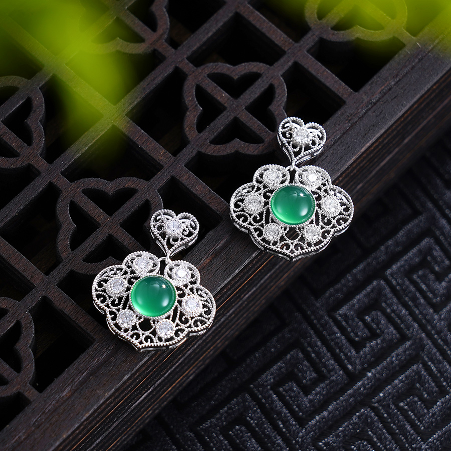 【寓意】:耳饰如意形态,采用镂空设计,连绵相绕,寓意着如意美好,生生不息。锆石与玉髓密嵌,明丽细腻,银光闪耀。