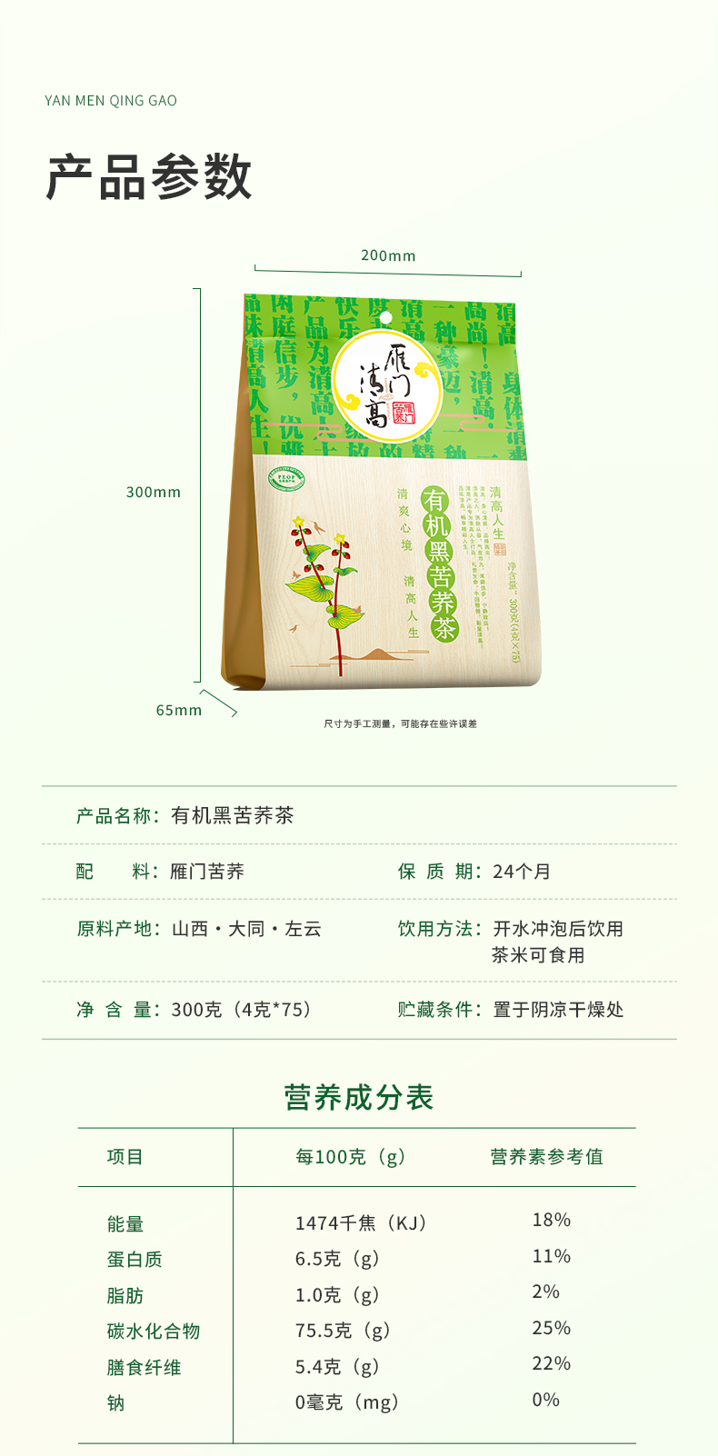 雁门清高有机黑苦荞茶300g独立装全胚芽荞麦茶