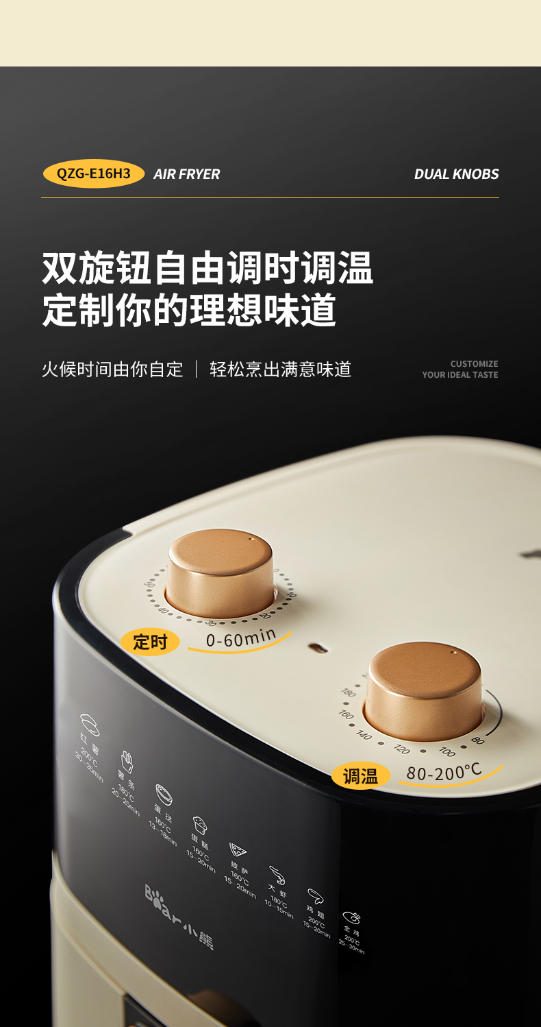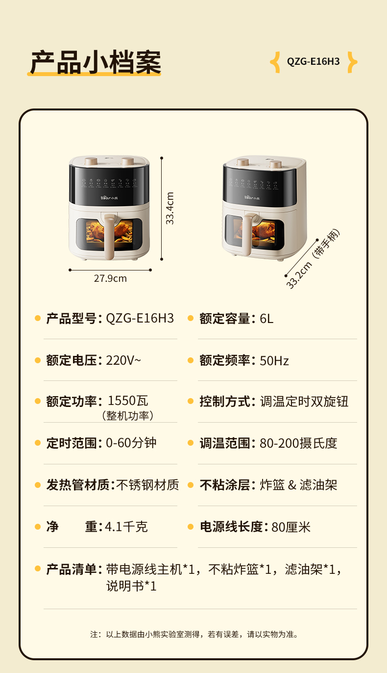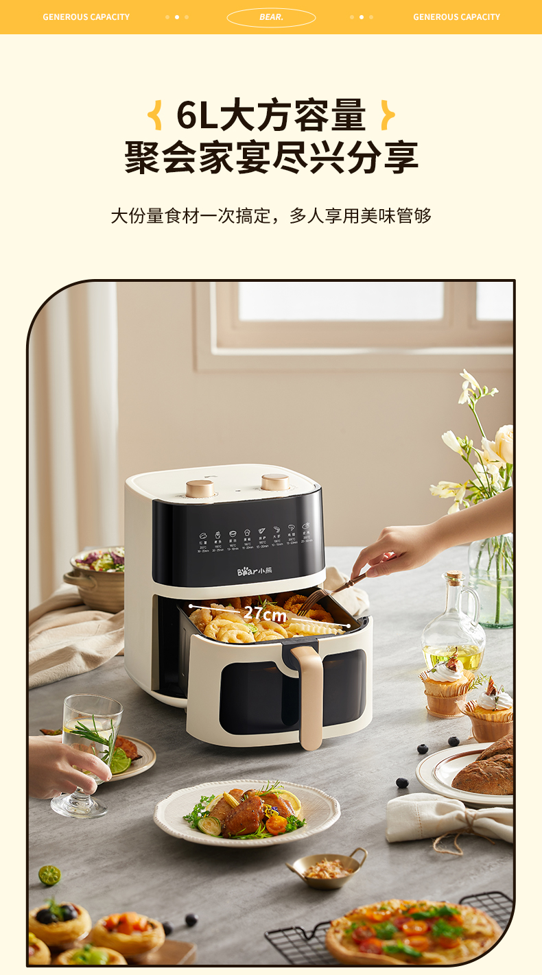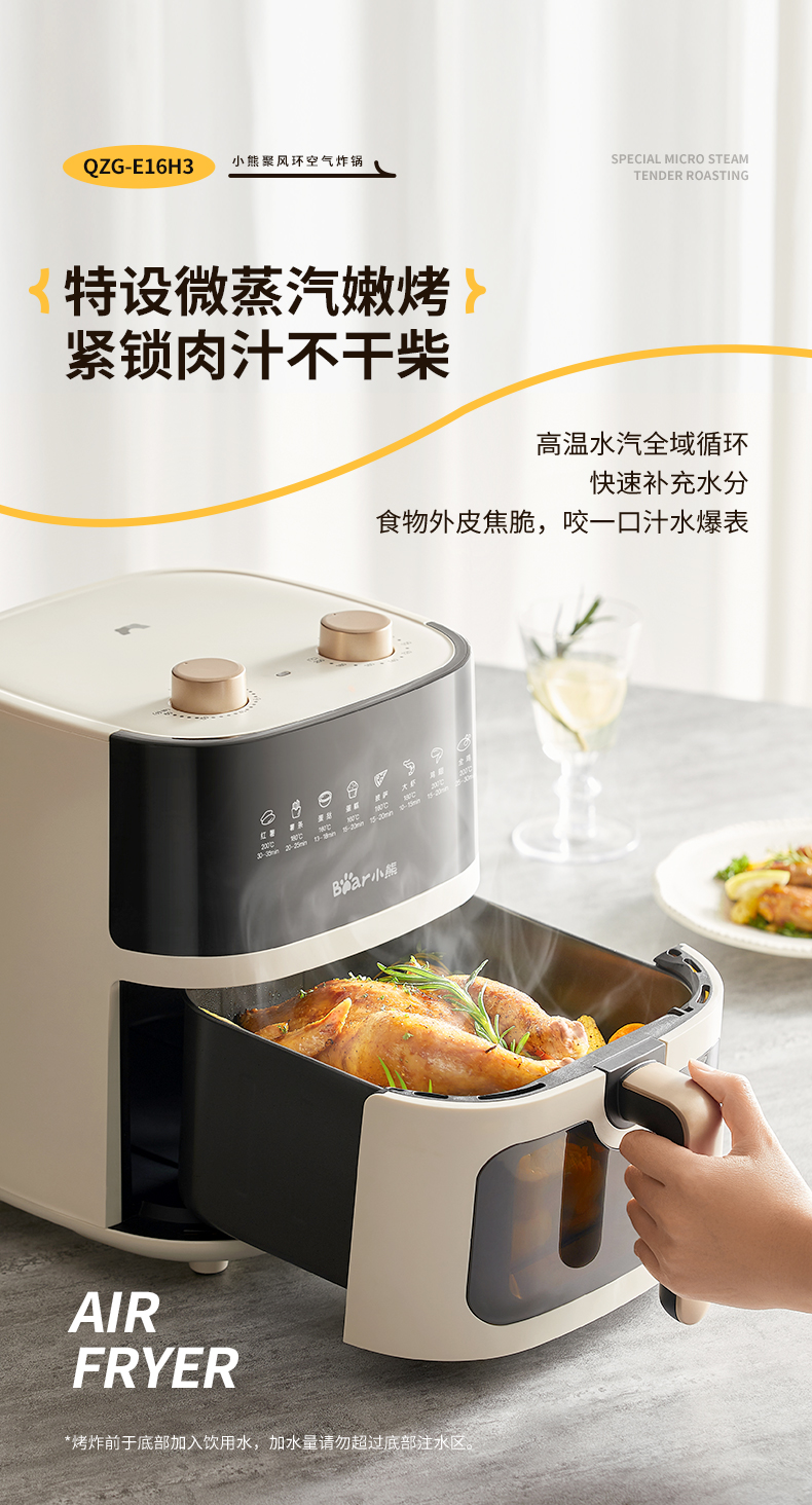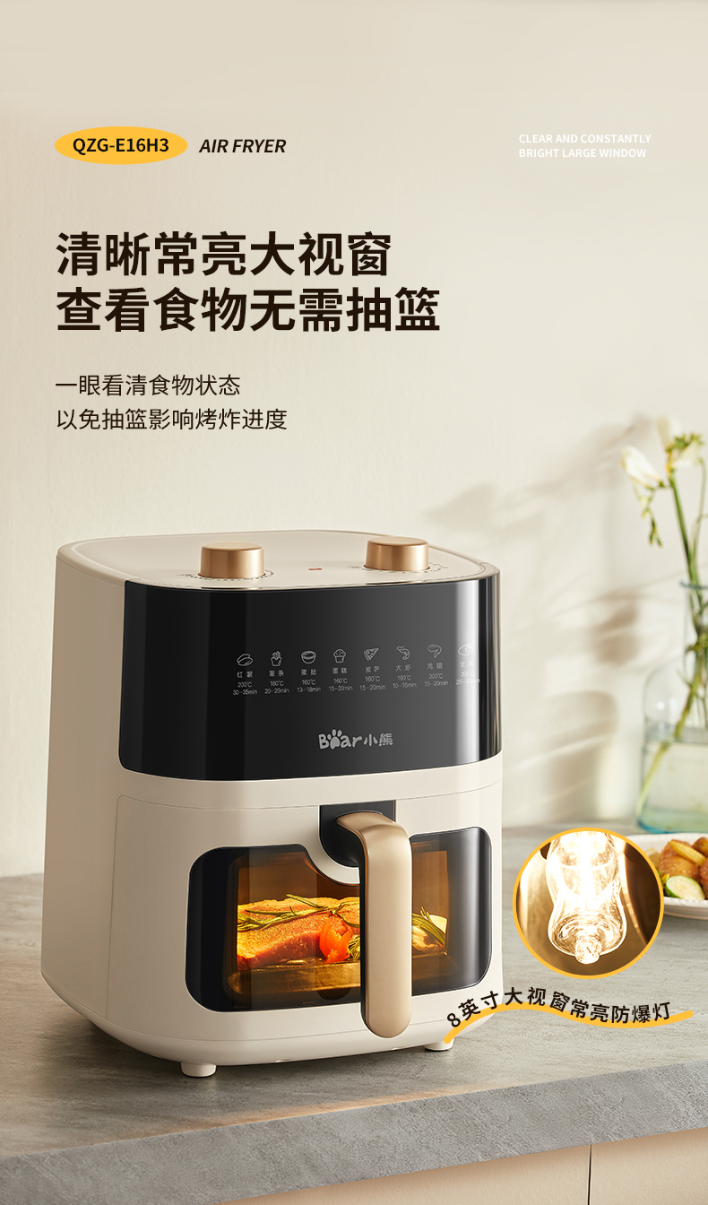【小程序】小熊(Bear)空气炸锅 不用翻面家用多功能6L大容量低脂双旋钮操控微蒸汽嫩烤可视款电炸锅 QZG-E16H3