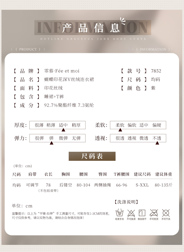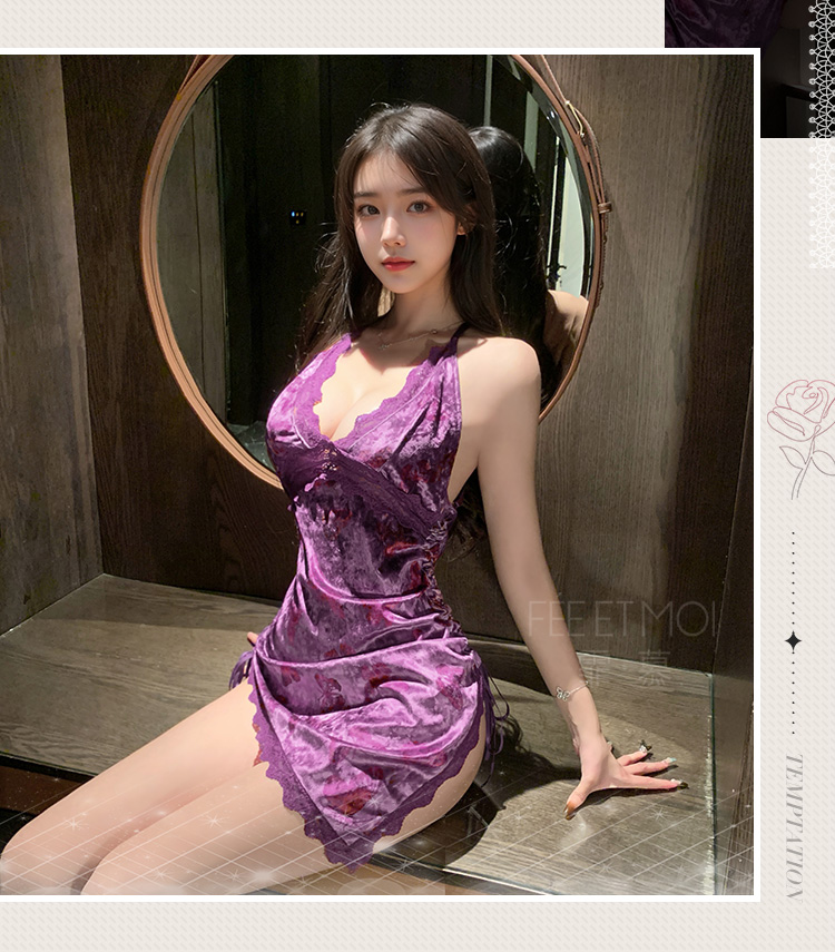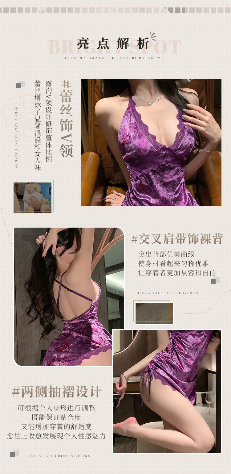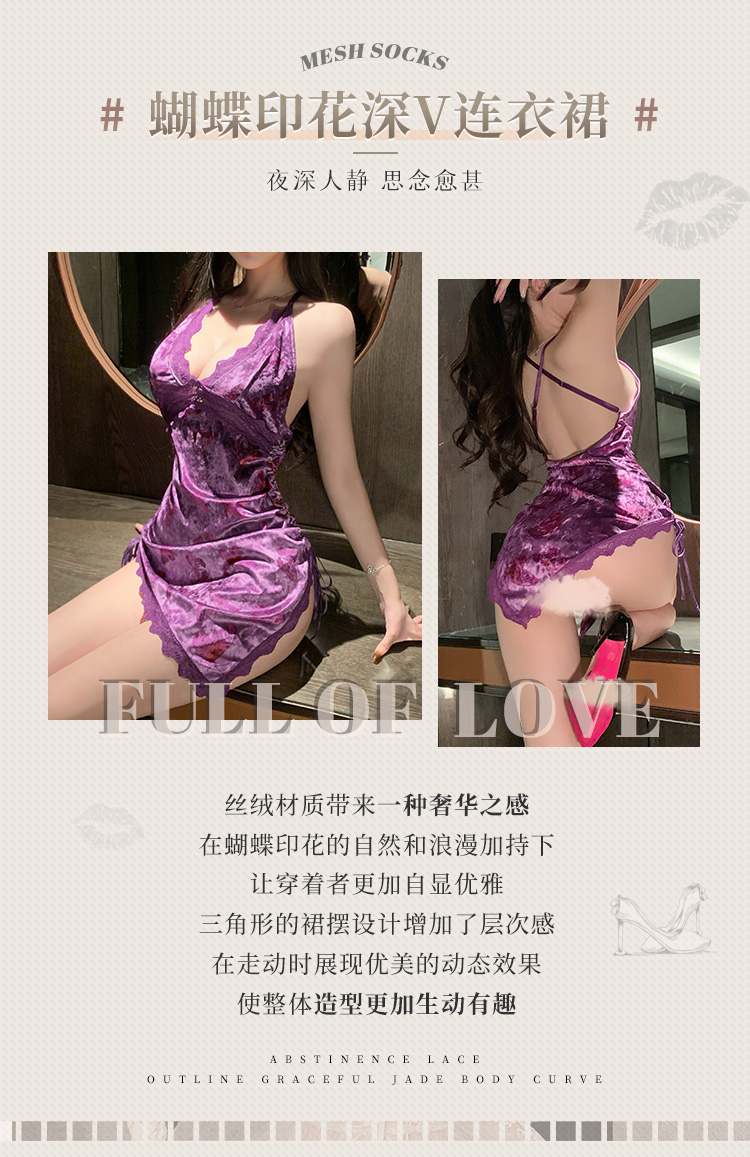 霏慕 蝴蝶印花深V丝绒连衣裙7852 情趣内衣女约会战袍床上诱惑免脱激情睡衣