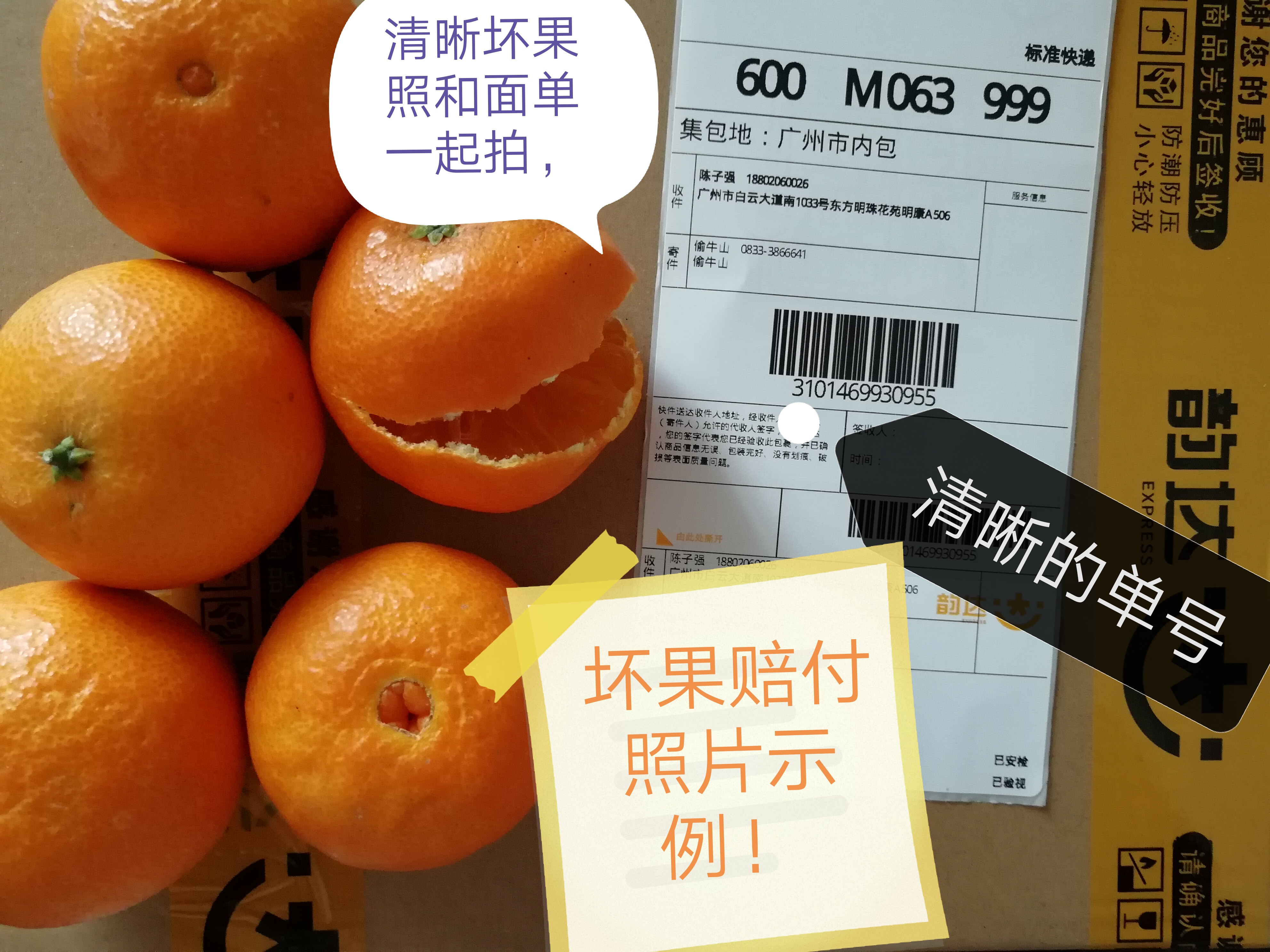 3. 签收拍照:坏果和快递单一起的照片,