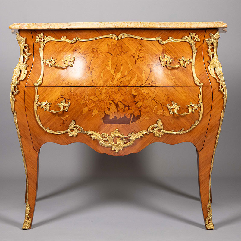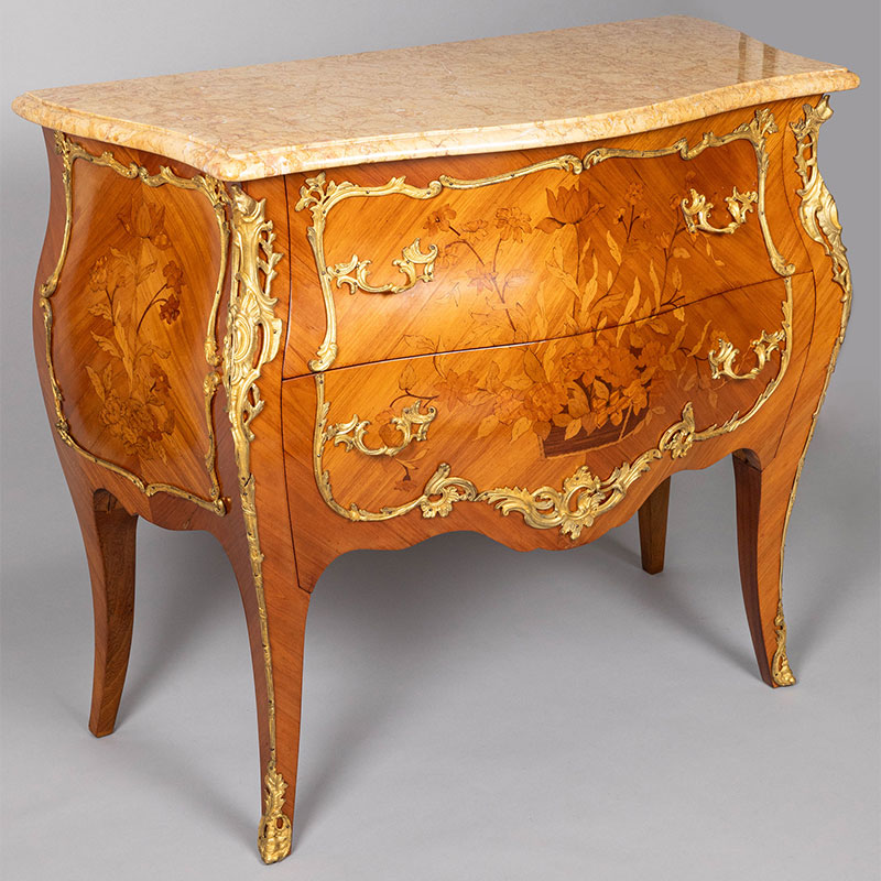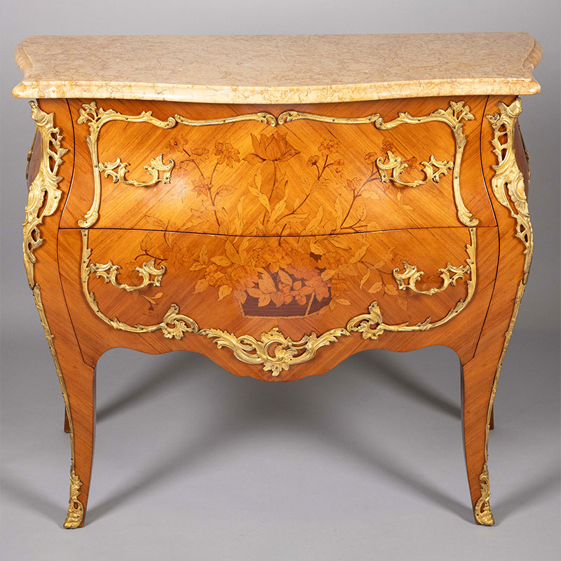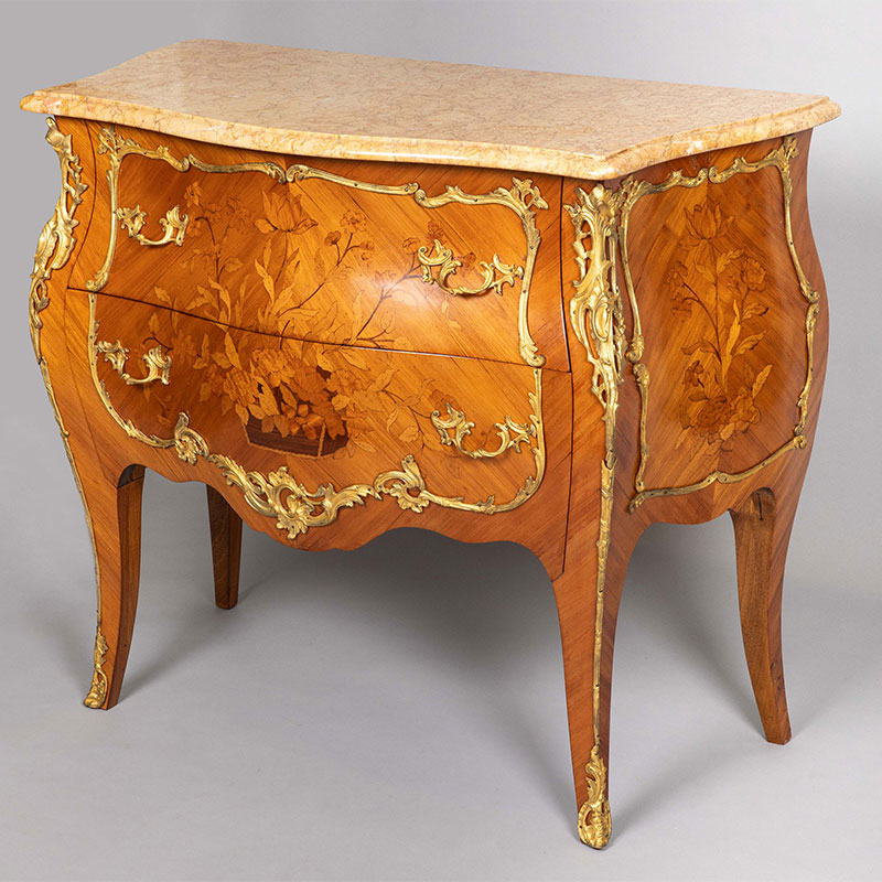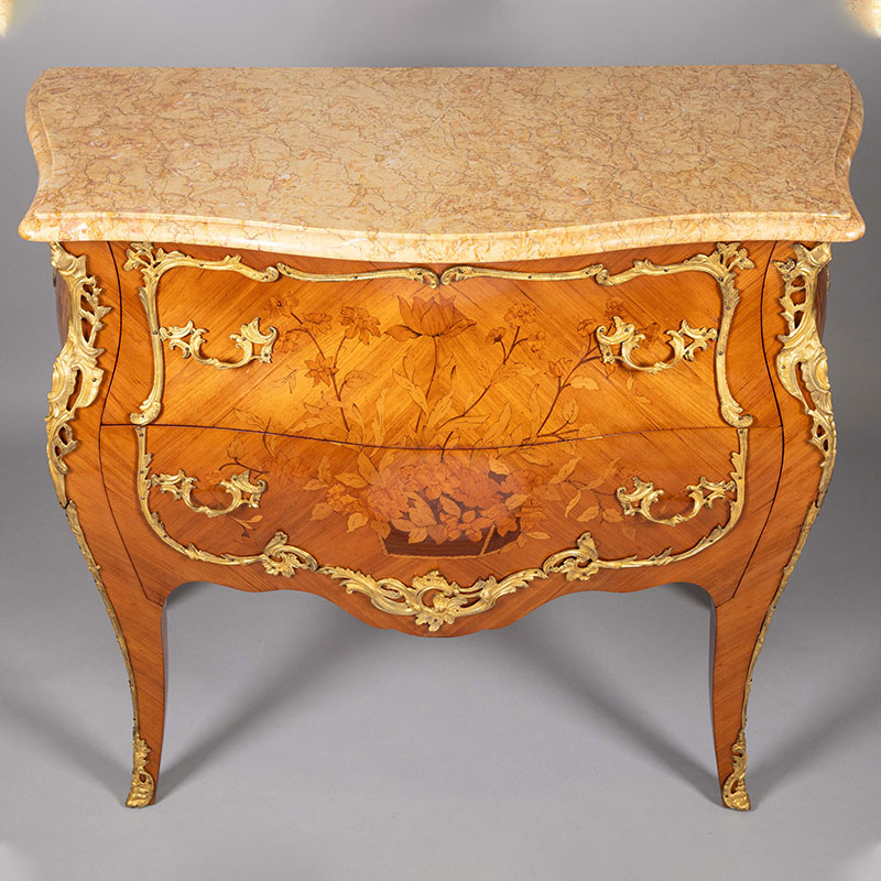 20世纪法国出品路易十五风格铜鎏金精雕镶嵌花卉主题细木镶嵌斗柜