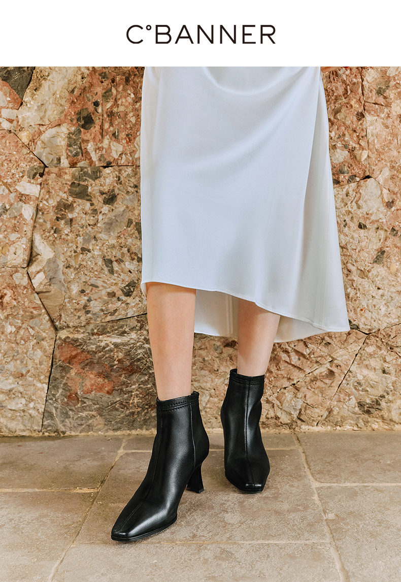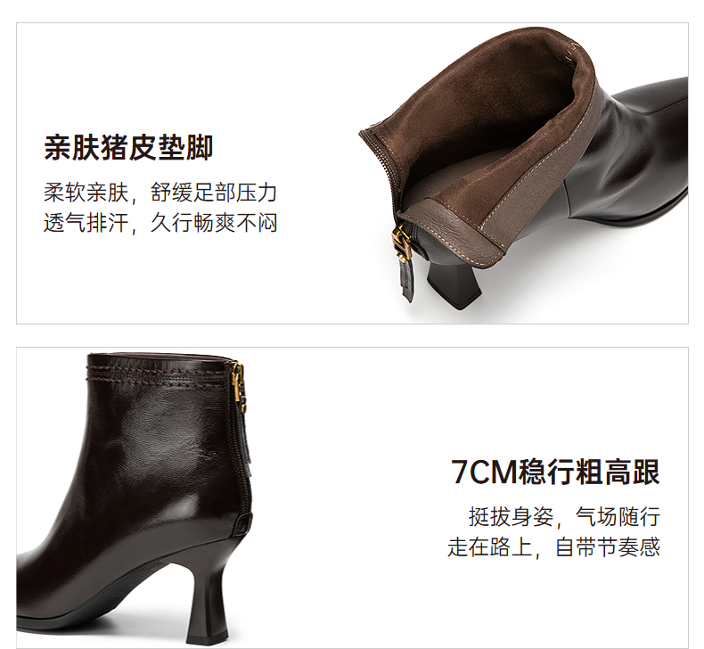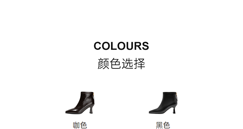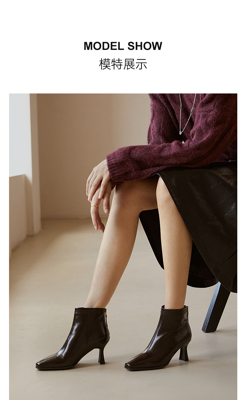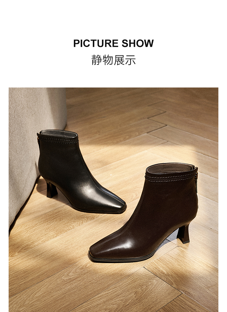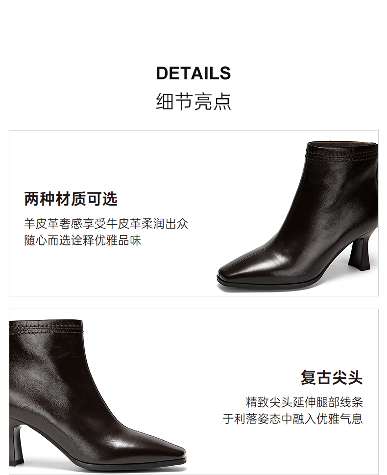 千百度粗高跟羊皮靴女秋冬新款时装靴通勤尖头短靴子A25551711