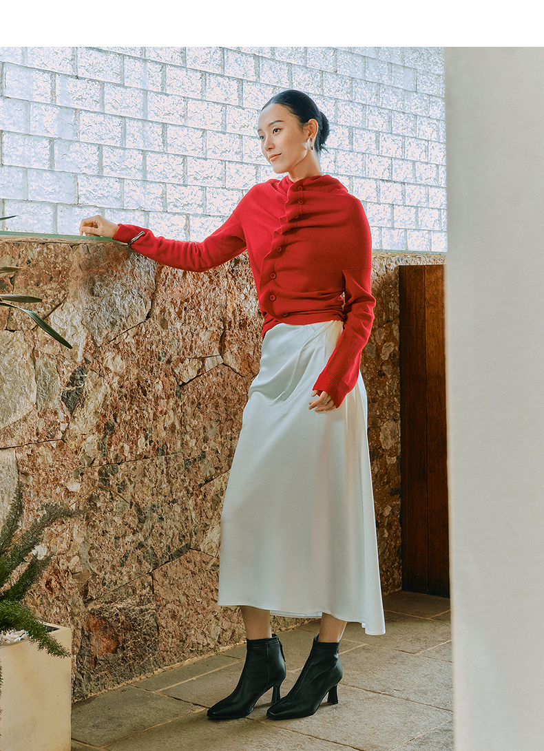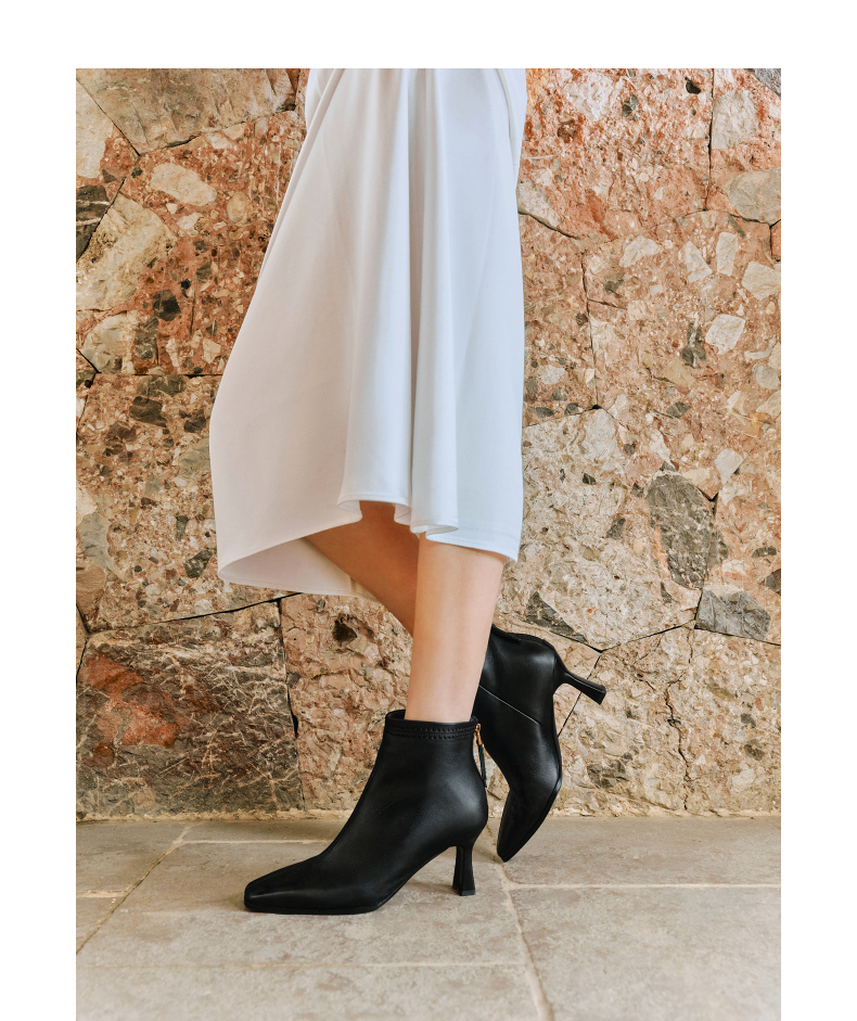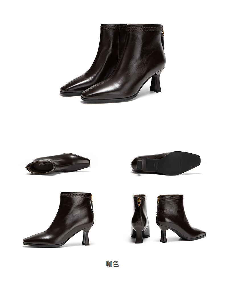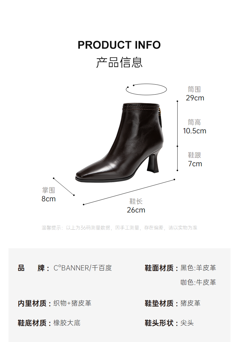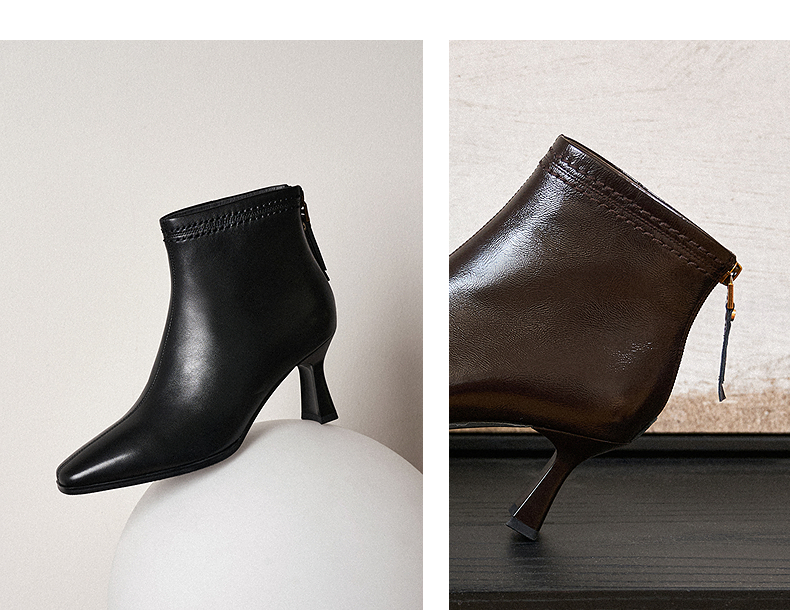千百度粗高跟羊皮靴女秋冬新款时装靴通勤尖头短靴子A25551711
