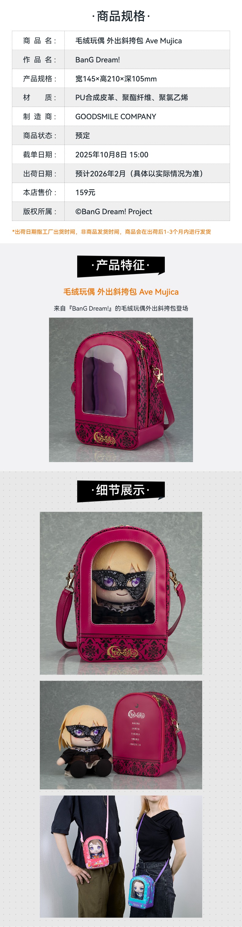【GSC补款】毛绒玩偶 外出斜挎包 Ave Mujica BanG Dream!