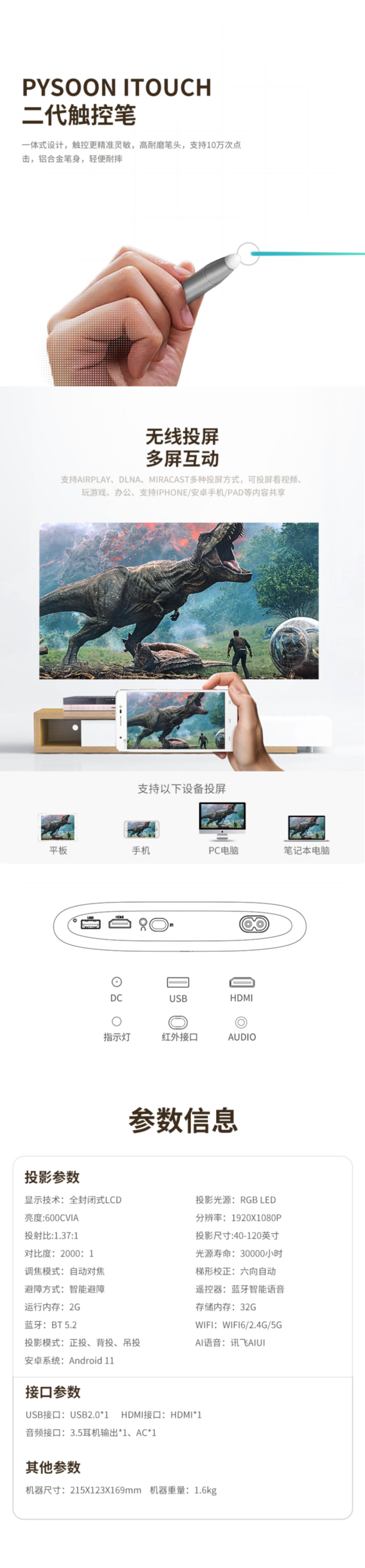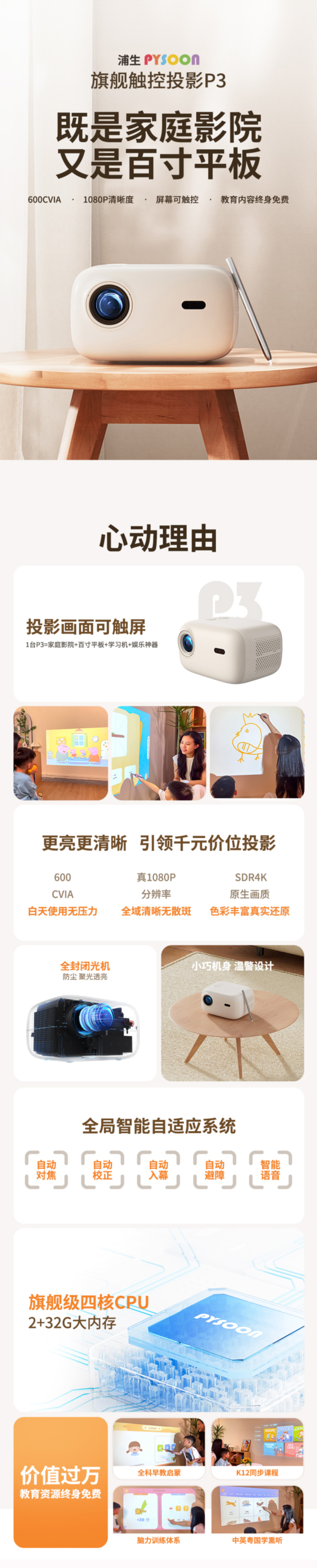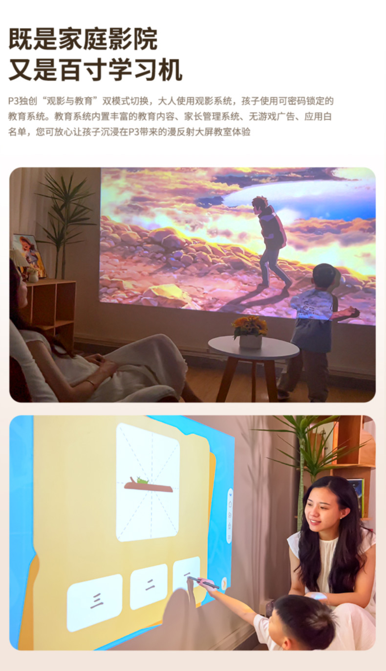 浦生P3 触控投影仪,触控互动,海量资源早教、会议、教学、娱乐兼适用