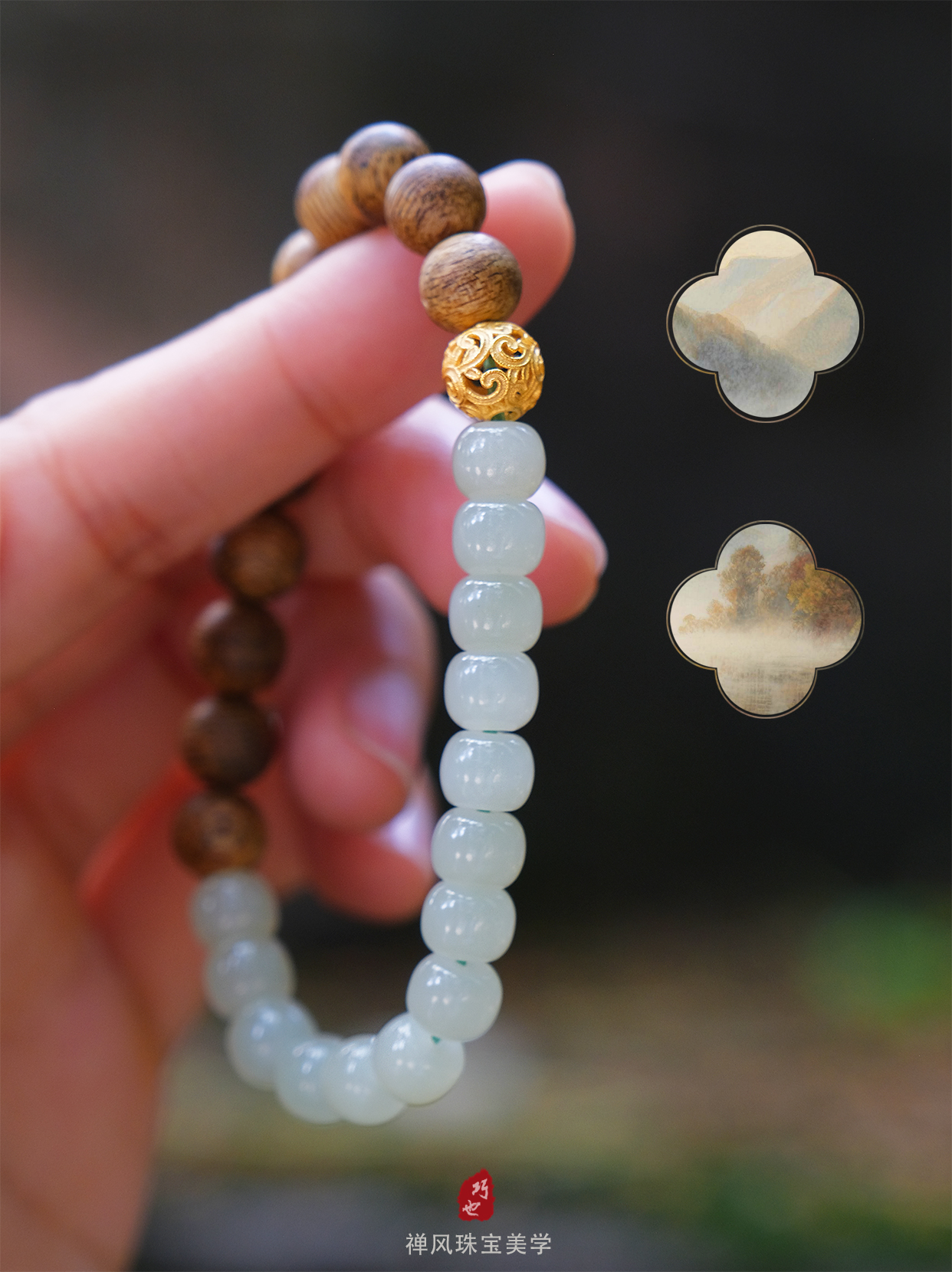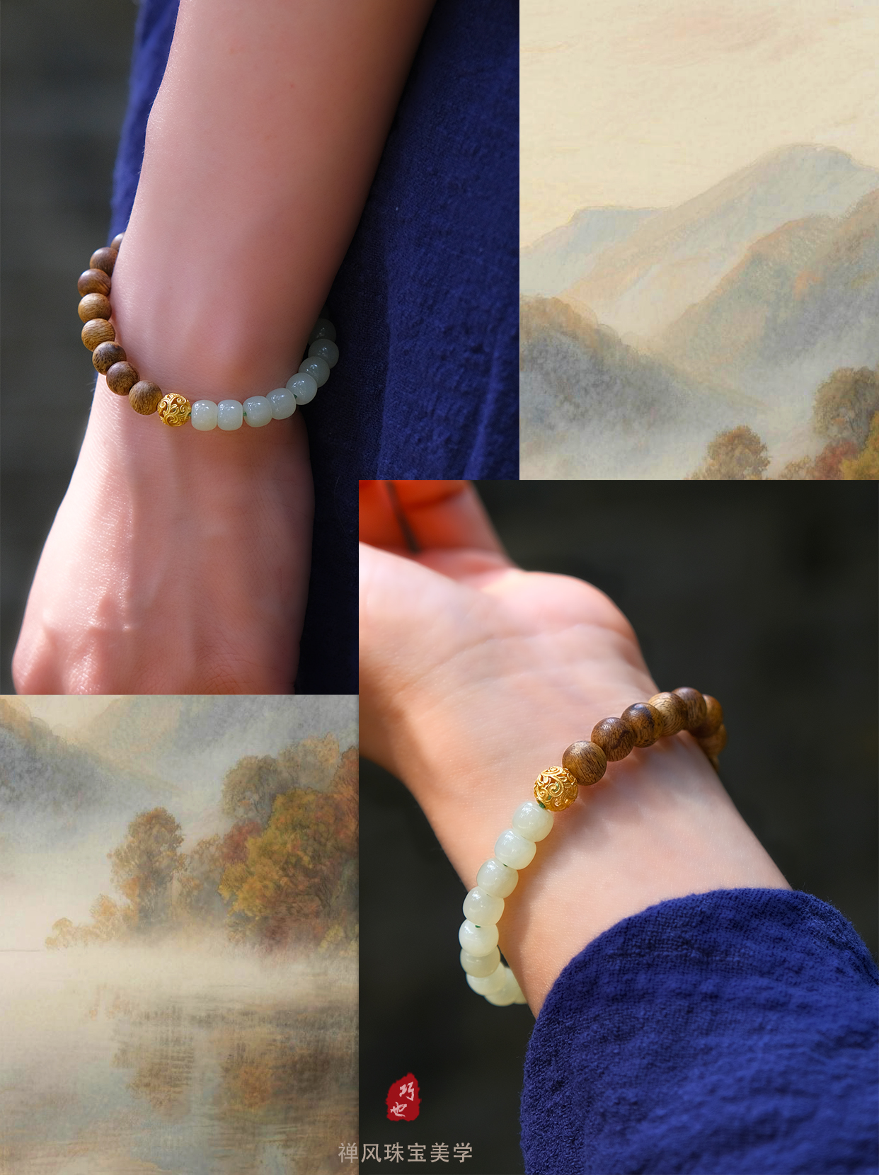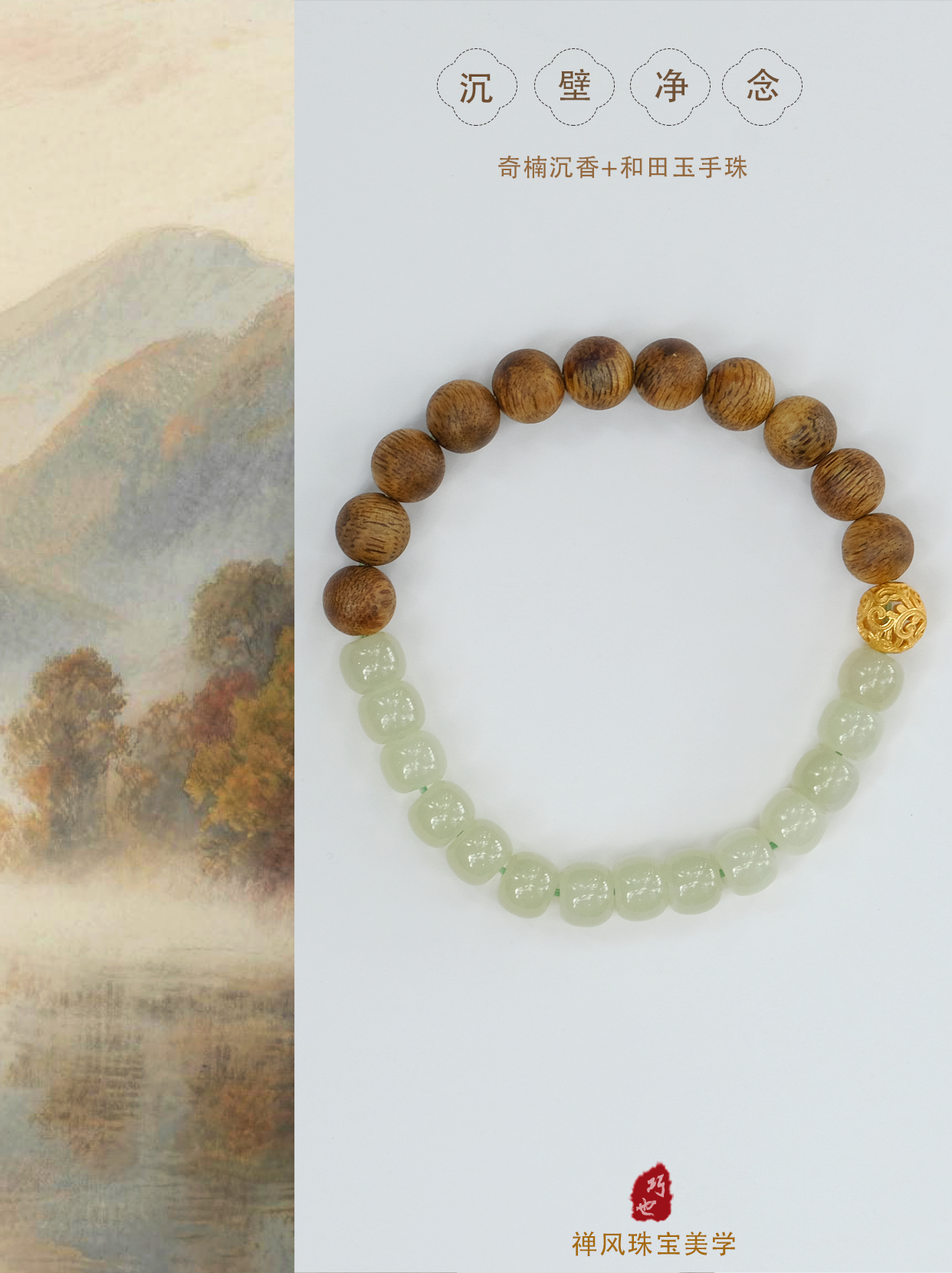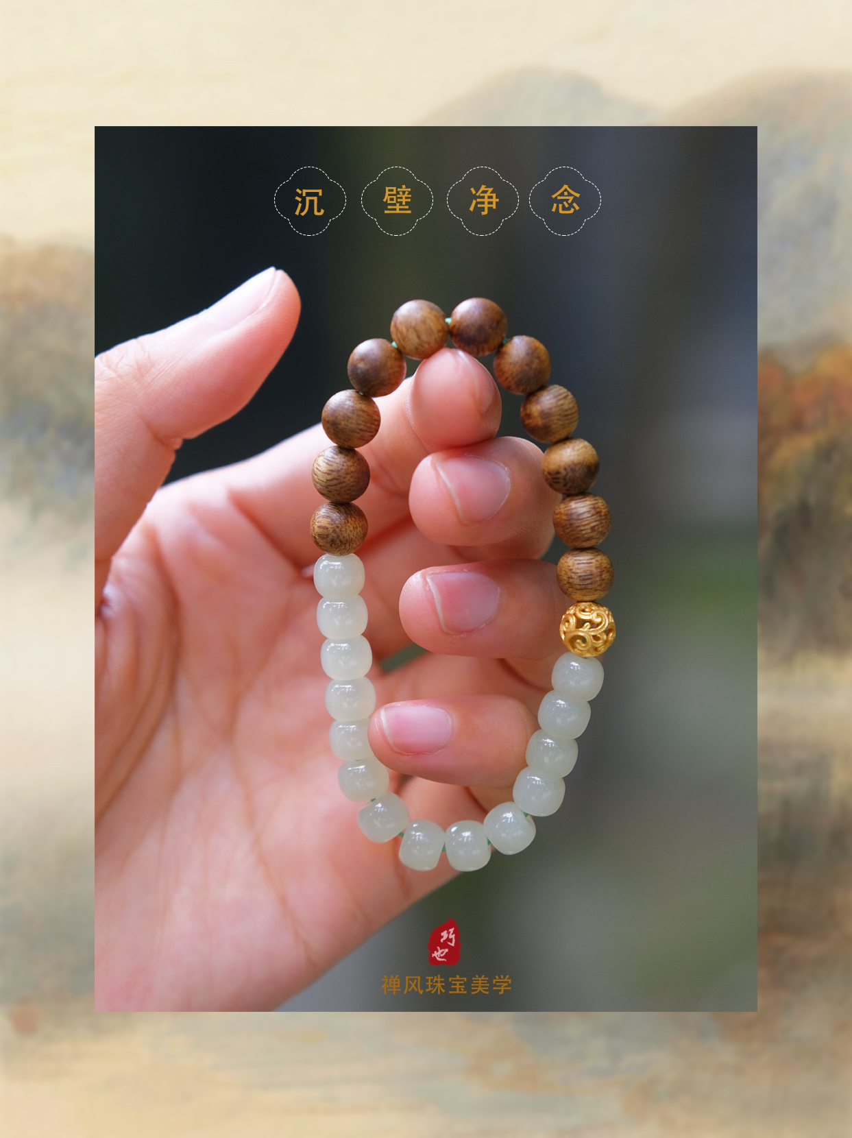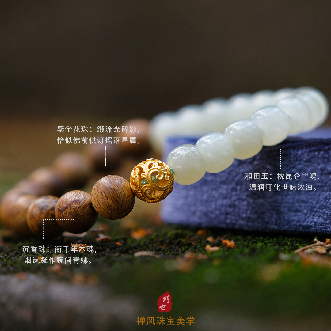 沉香衔千年木魂,烟岚凝作腕间青螺;和田玉枕昆仑雪魄,温润可化世味浓浊;金珠缀流光碎影,恰似佛前供灯摇落星屑。