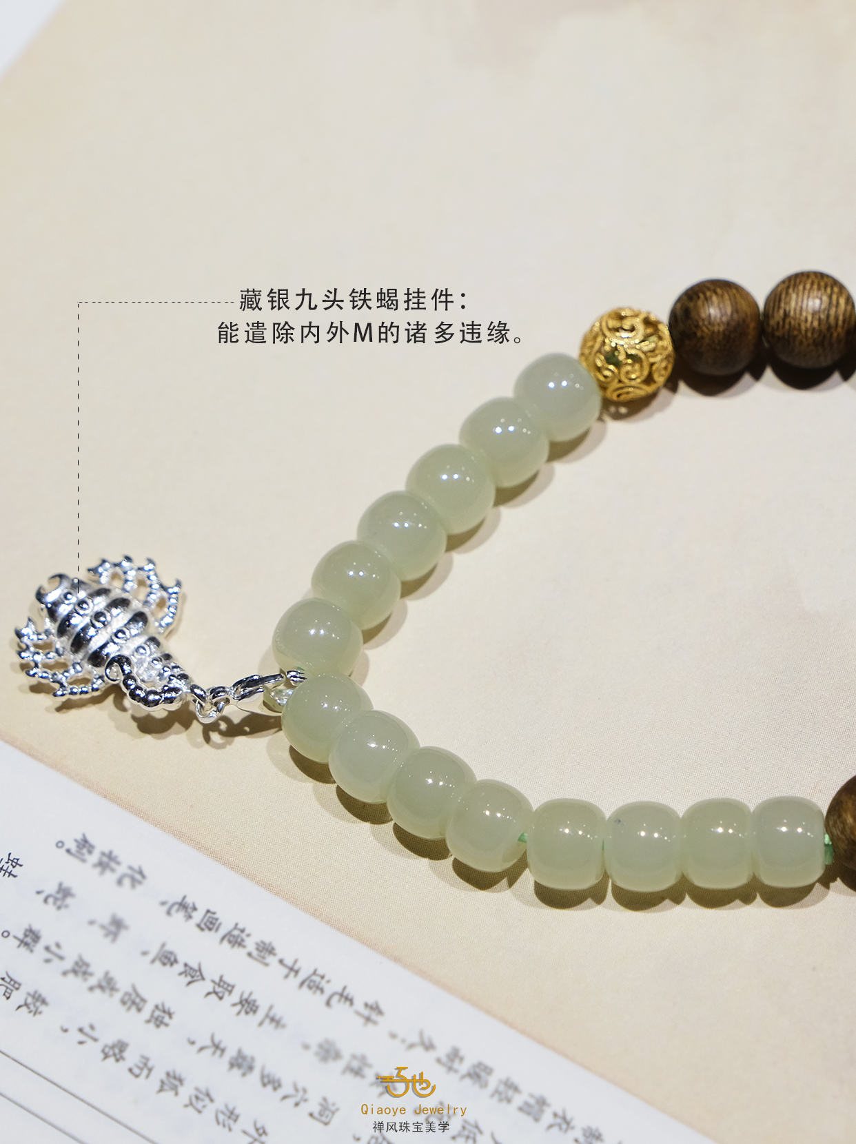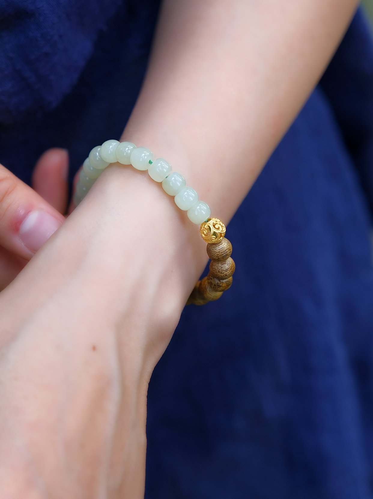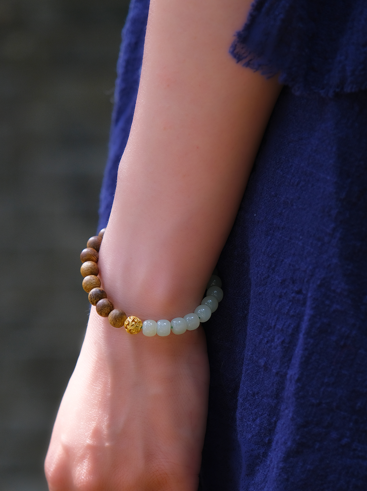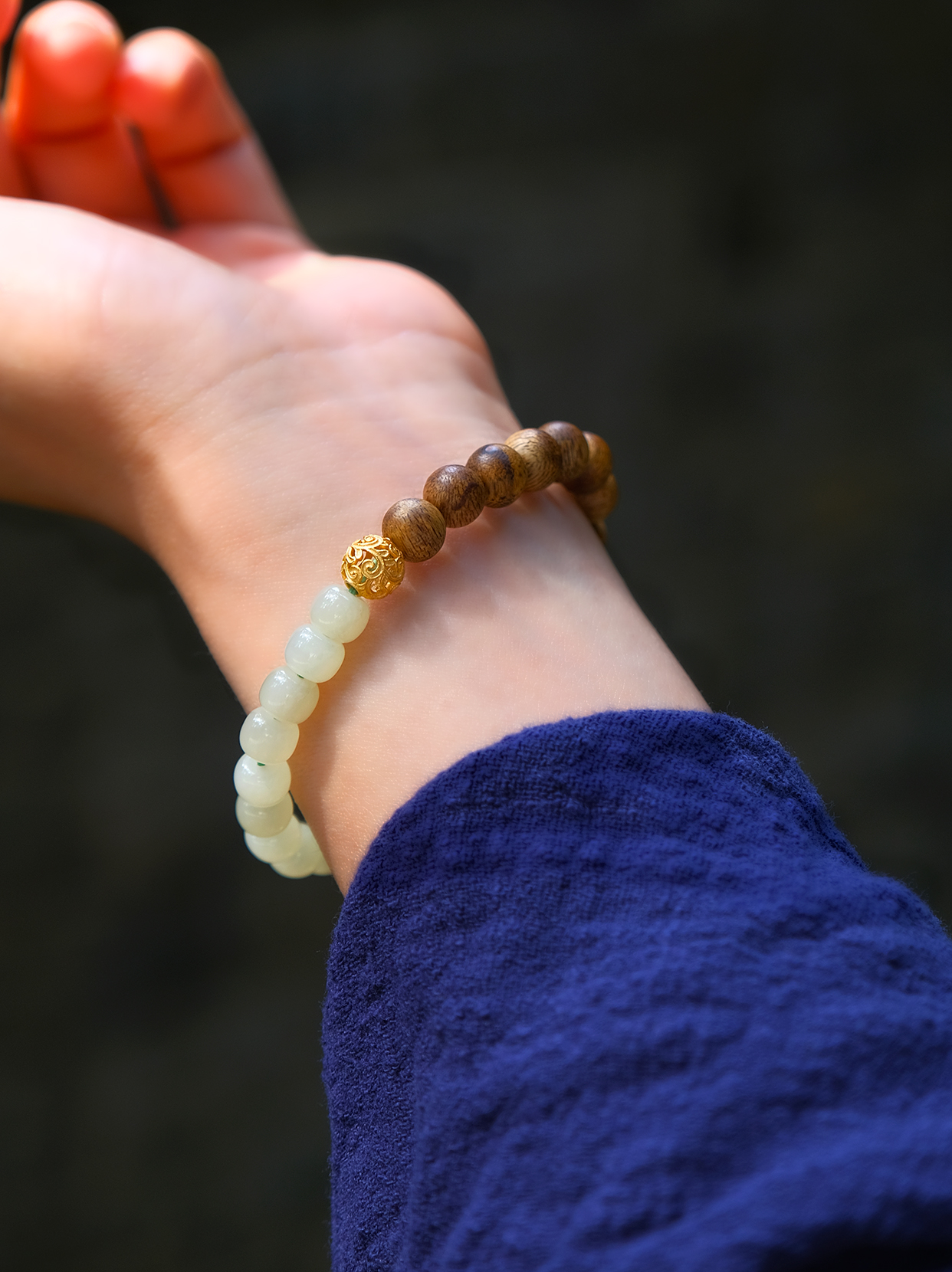 沉香衔千年木魂,烟岚凝作腕间青螺;和田玉枕昆仑雪魄,温润可化世味浓浊;金珠缀流光碎影,恰似佛前供灯摇落星屑。