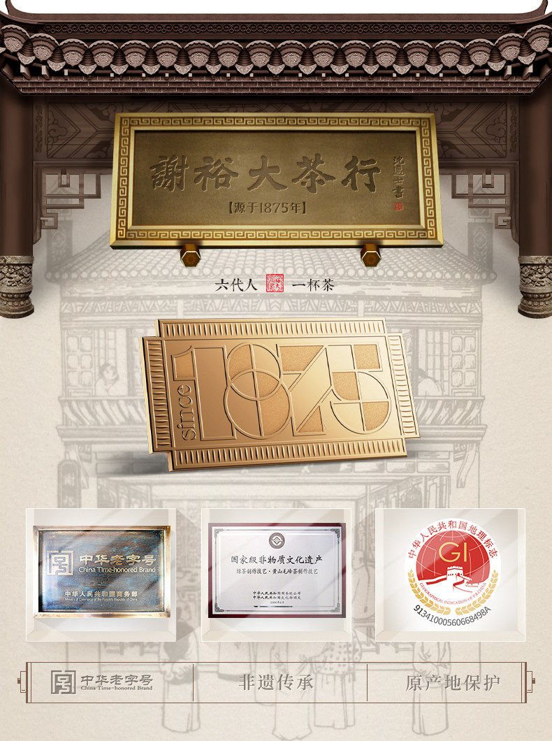- 中华老字号谢裕大茶行,始创于清光绪元年。其创办者谢正安一生业茶,创制了名动天下的黄山毛峰。谢氏后人恪守祖业,传承发扬茶叶技艺将安徽名茶悉数纳入产品系列。潜心制茶,敬奉香茗。