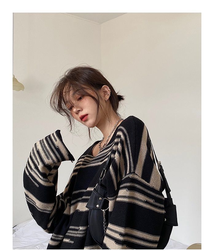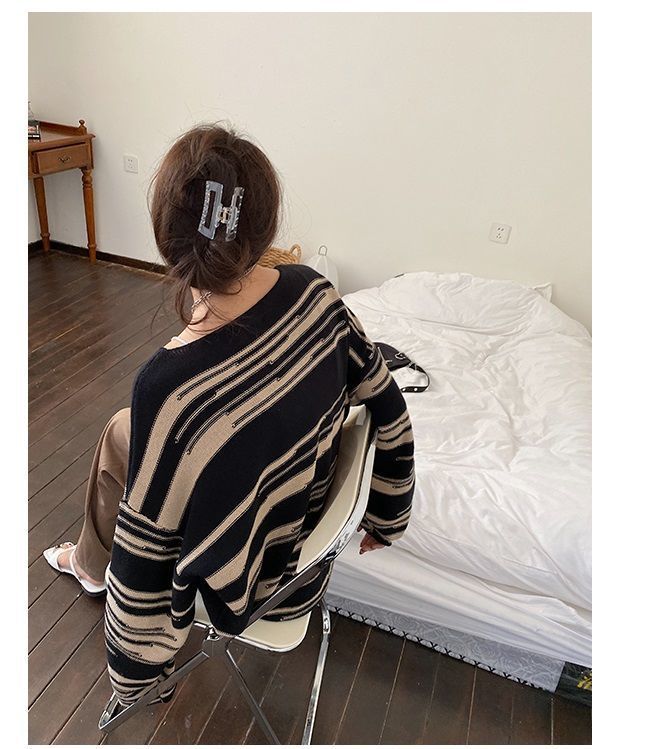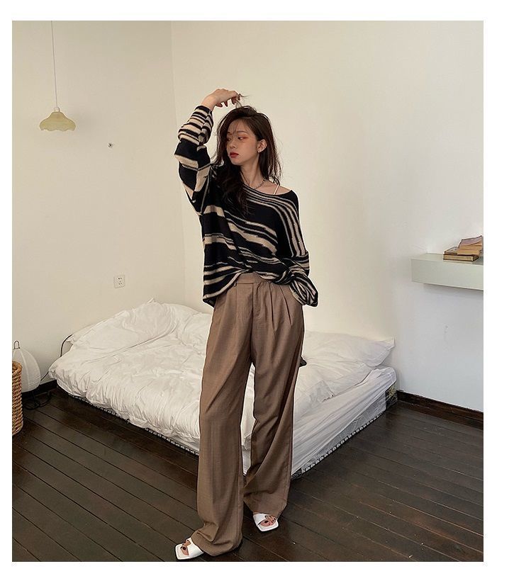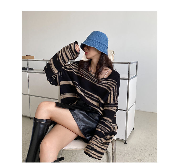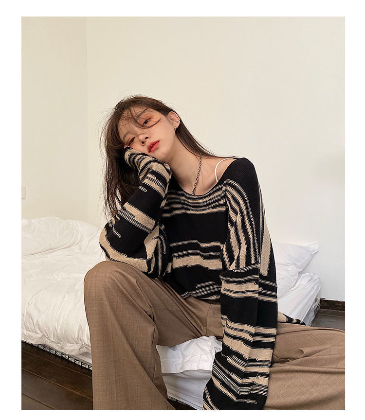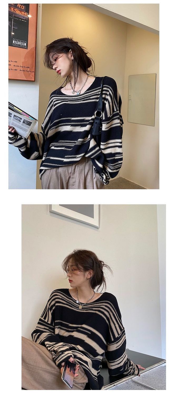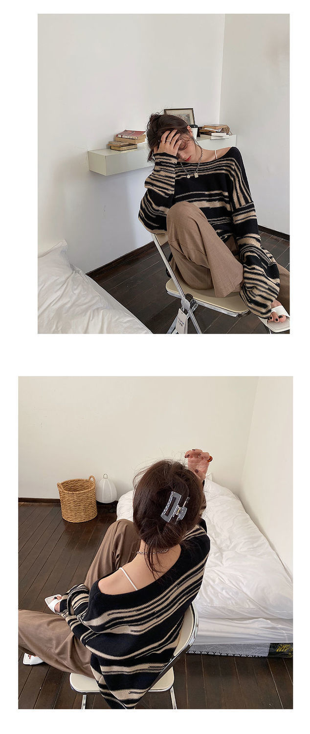 【韩系ins慵懒风条纹毛衣】2023秋冬新款 圆领宽松薄款针织套头衫 宽松版型休闲舒服