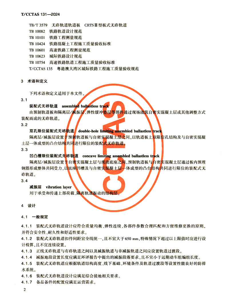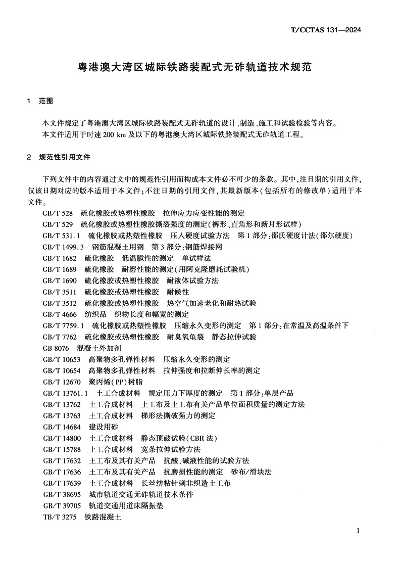 书名:粤港澳大湾区城际铁路装配式无砟轨道技术规范T/CCTAS 131—2024