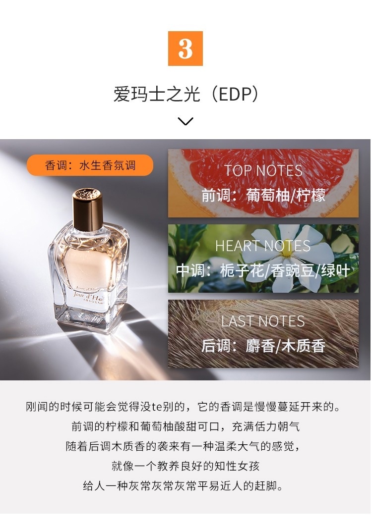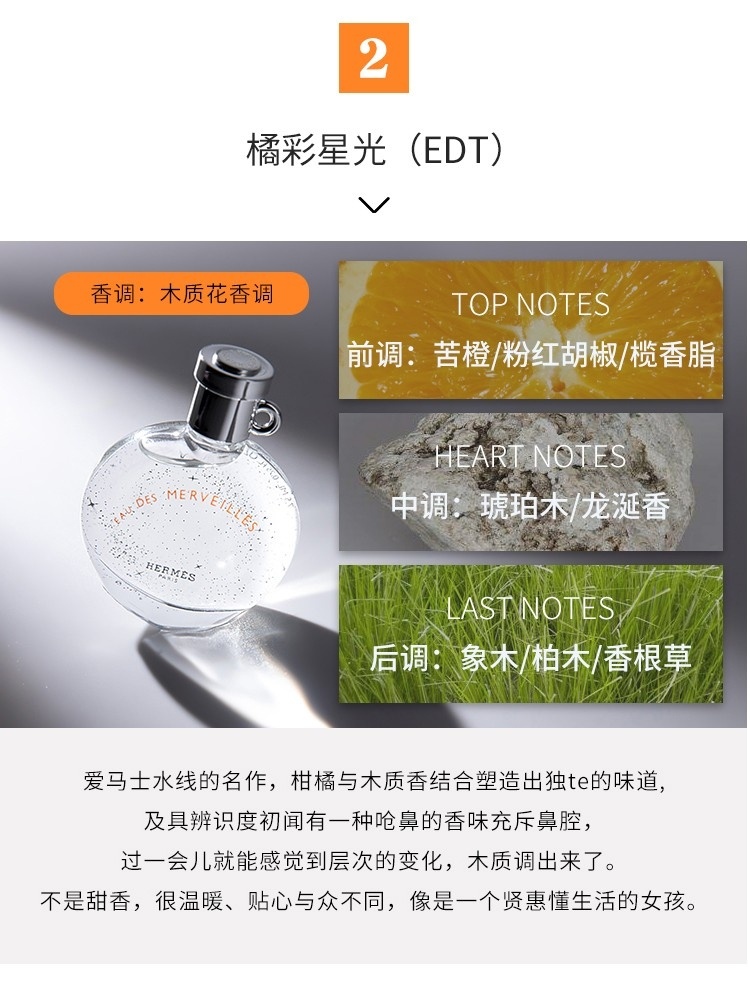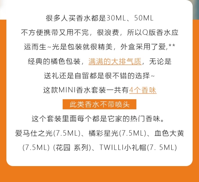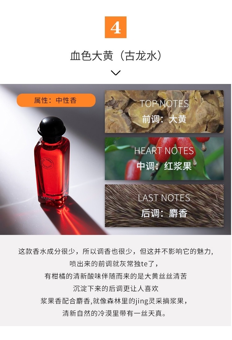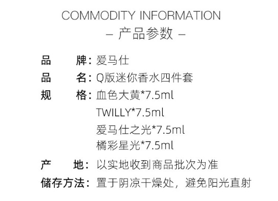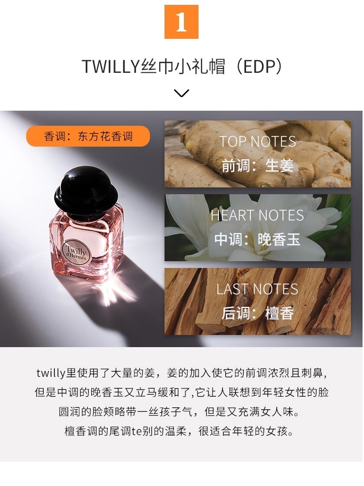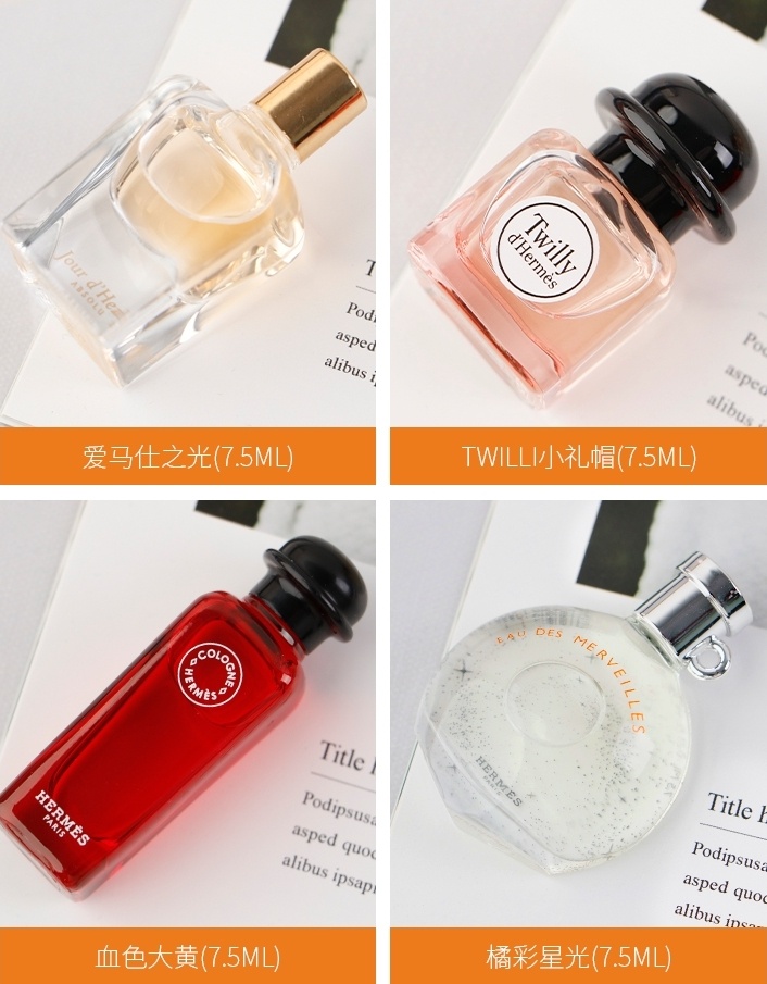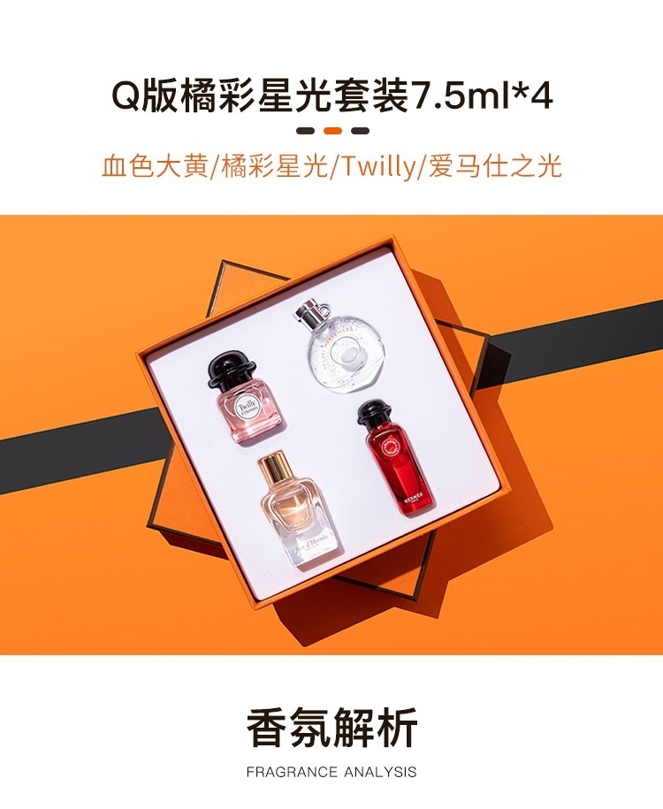 【香型】TWILLY(花果香)/血色大黄(绿色清新调)/橘彩星光(木质香调)/爱马仕之光(花香调)