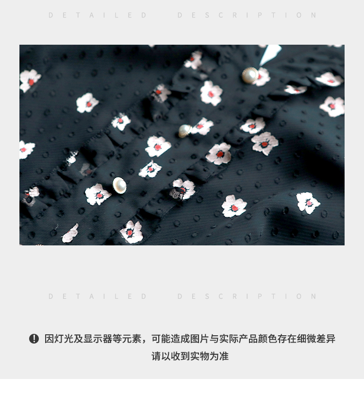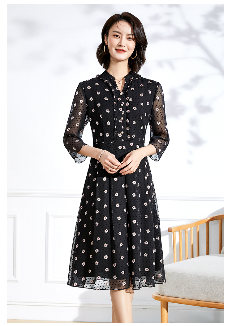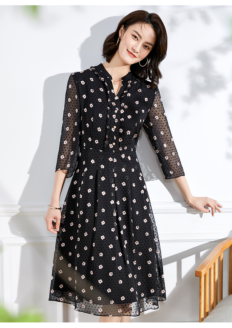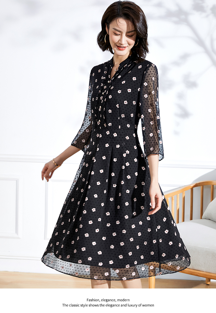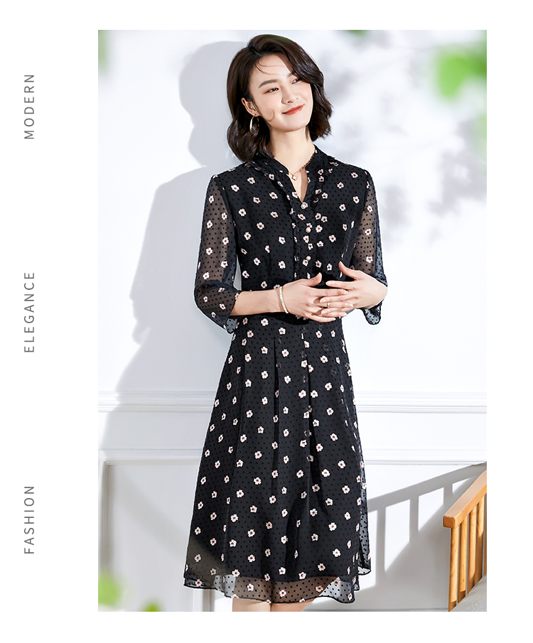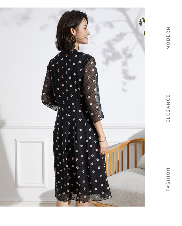 佐尔美春夏新款 V领网纱9分袖收腰小碎花中长连衣裙女E11LL29