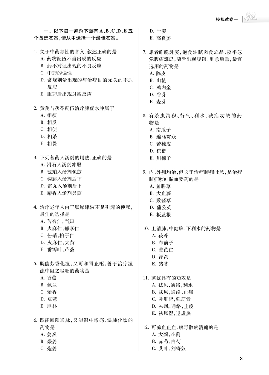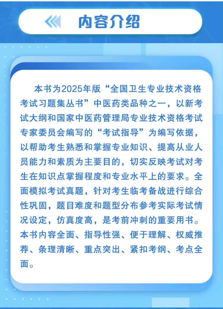 本书为2025年版“全国卫生专业技术资格考试习题集丛书”中医药类品种之一,以最新考试大纲和国家中医药管理局专业技术资格考试专家委员会编写的“考试指导”为编写依据,以帮助考生熟悉和掌握专业知识、提高从业人员能力和素质为主要目的,切实反映考试对考生在知识点掌握程度和专业水平上的要求。全面模拟考试真题,针对考生临考备战进行综合性巩固,题目难度和题型分布参考实际考试情况设定,仿真度高,是考前冲刺的重要用书。
