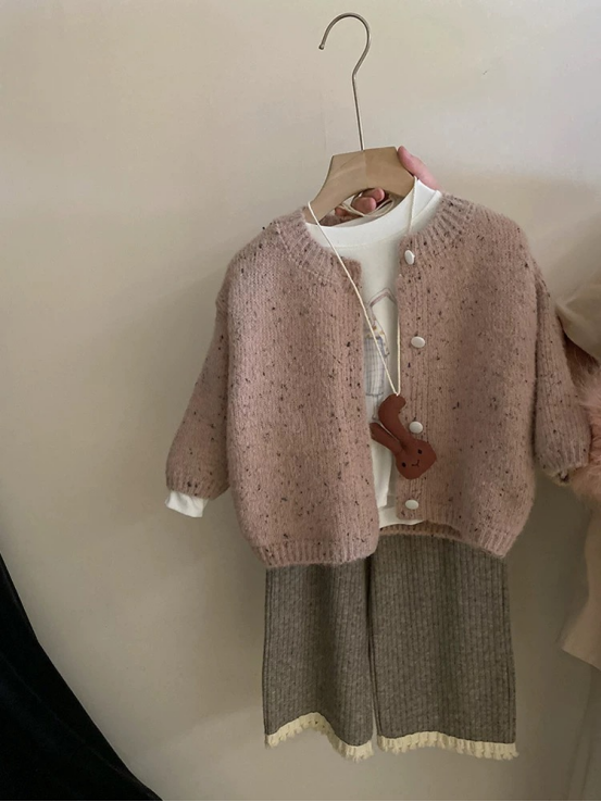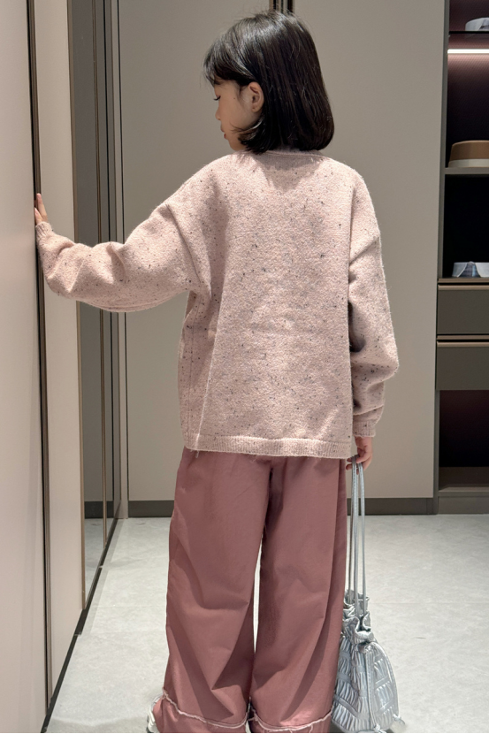 这颜色巨温柔~||挖到一件奶呼呼的毛衣~ 软软糯糯的质地搭配上彩色的点点杂花, 像极了散了彩虹碎糖粒的奶油蛋糕,可爱又温馨 搭配同色系粉粉阔腿裤,