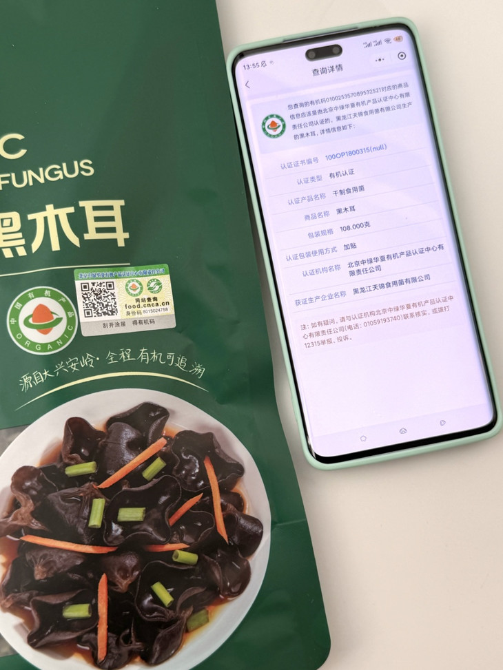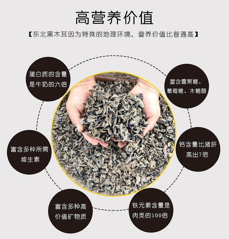不管是老妈的家常小炒 还是餐桌上的爽口凉拌菜 随处都能看到木耳的身影~ 市面上卖木耳的地方很多,但要买到容易泡发, 肉质肥厚的干木耳还真不容易。 ✔4A景区伊春10年龄以上野生椴木为原料 全程有机培植,野外生长,生长周期长 产量少,人工采摘后无硫磺不烘干 每一朵都是自然晾晒而成,严控品质 ✔有机认证齐全,都是当季新收 每一颗都是精心挑选 色泽光亮 朵型完整 精品木耳品质