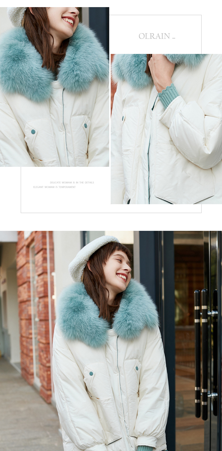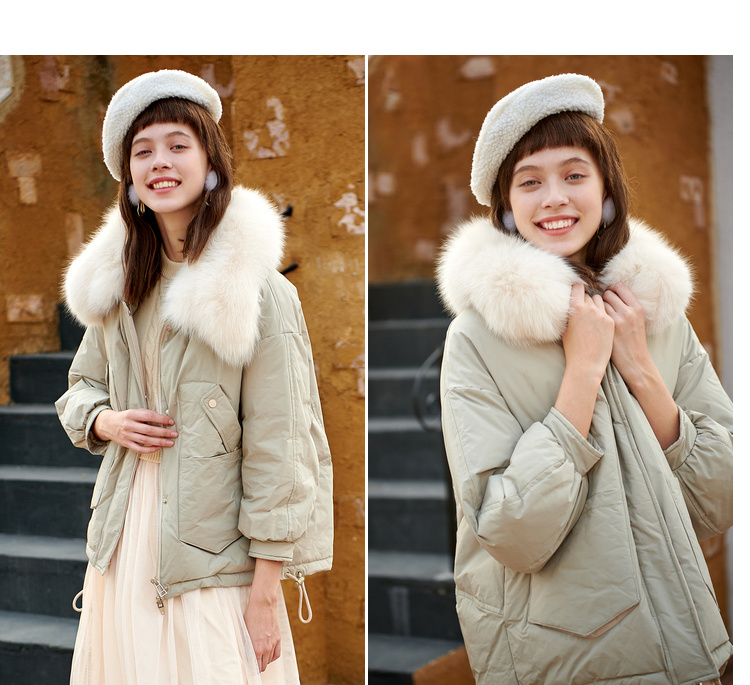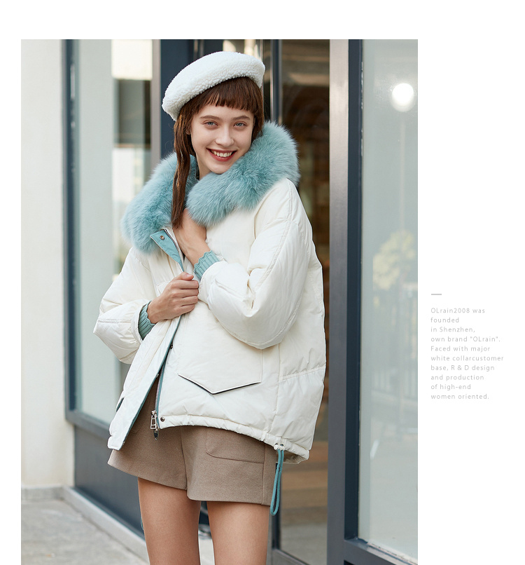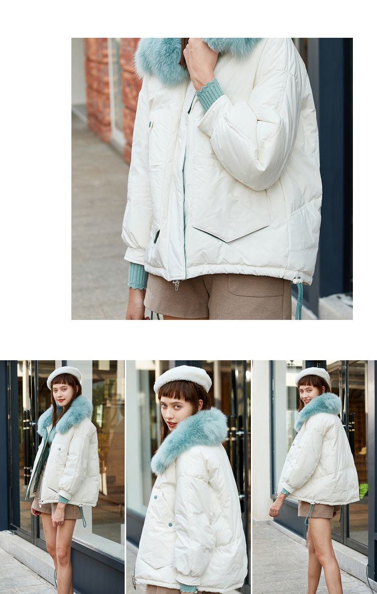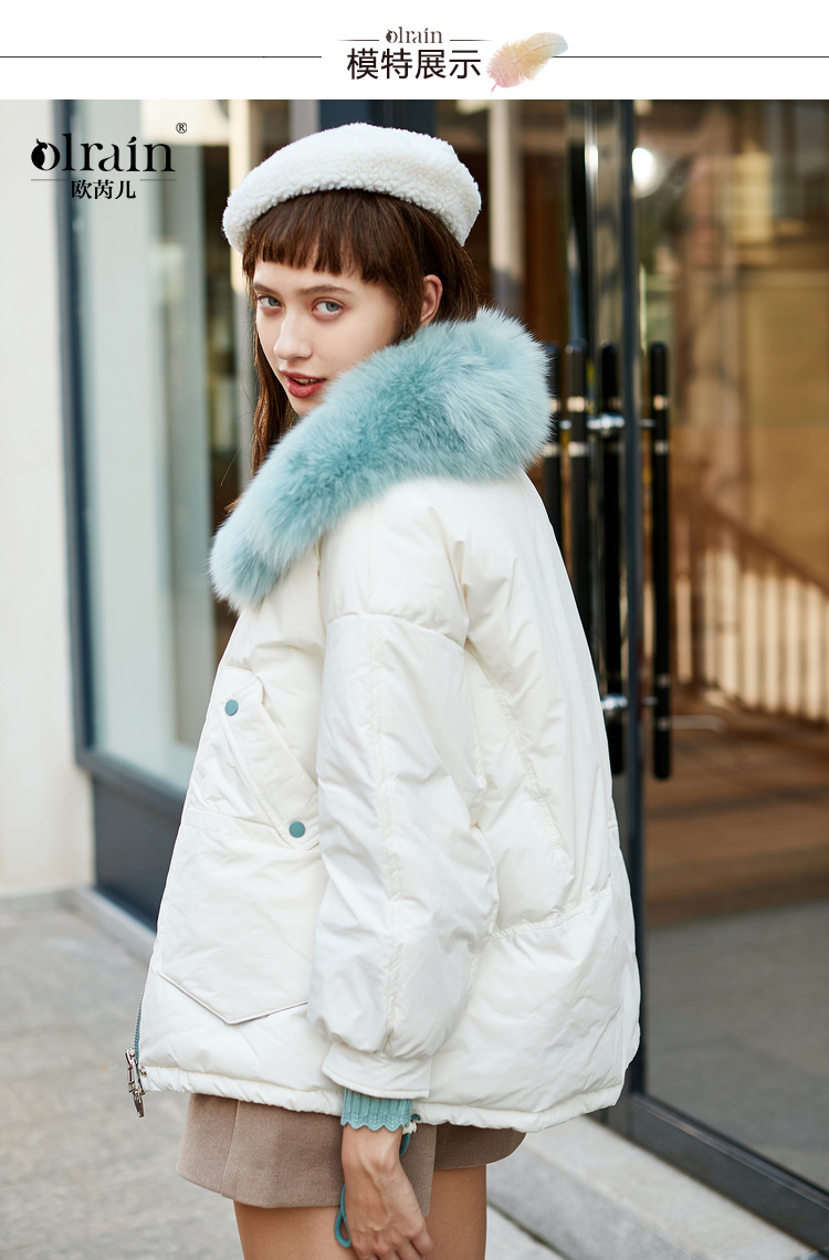 @欧芮儿2019冬季羽绒服女短款连帽带毛领米白色白鸭绒