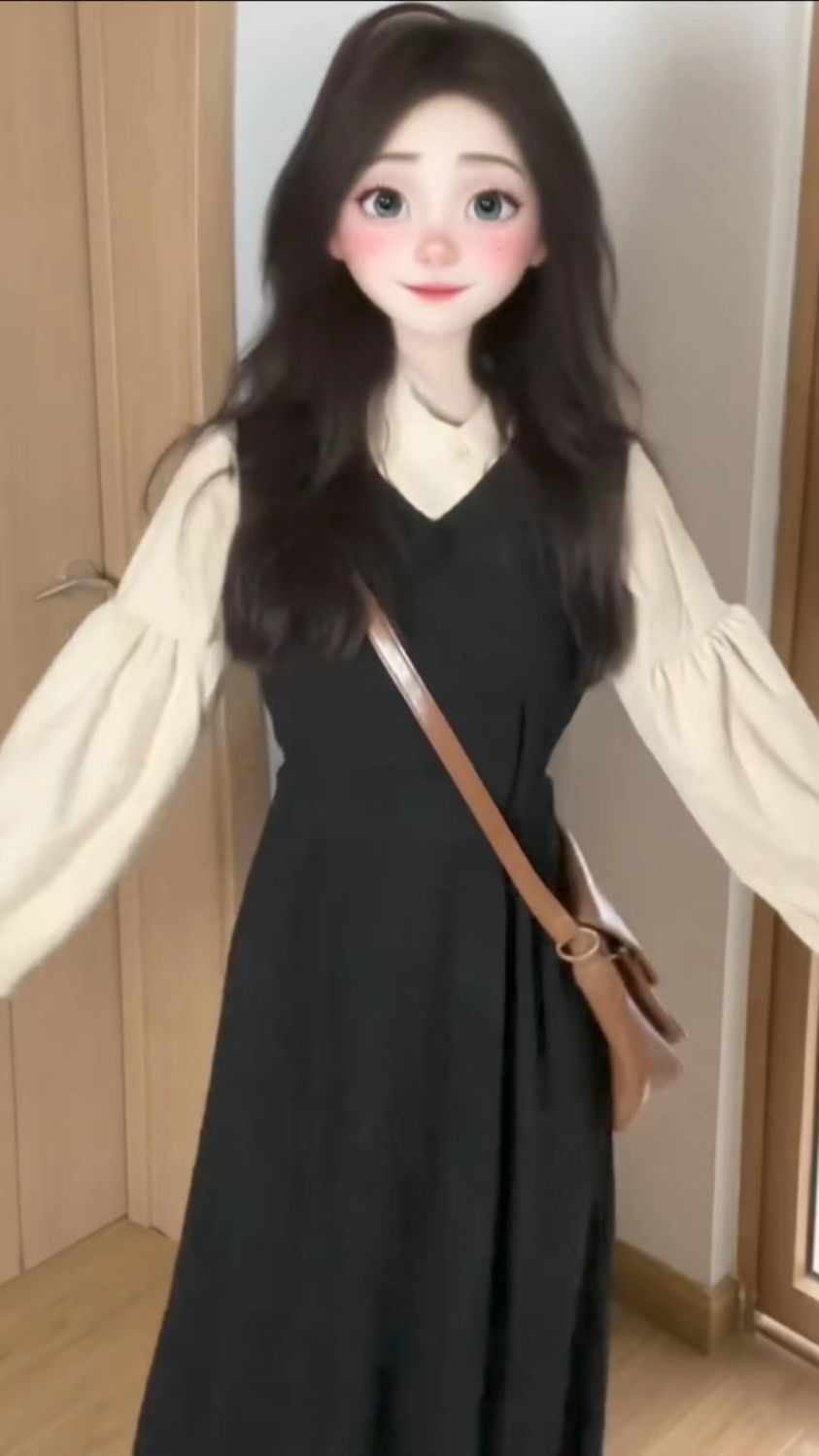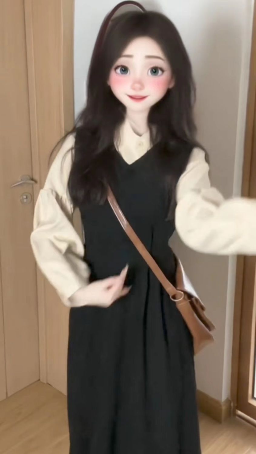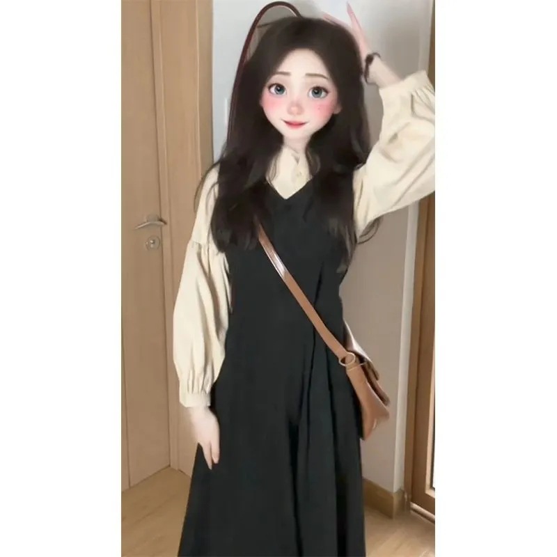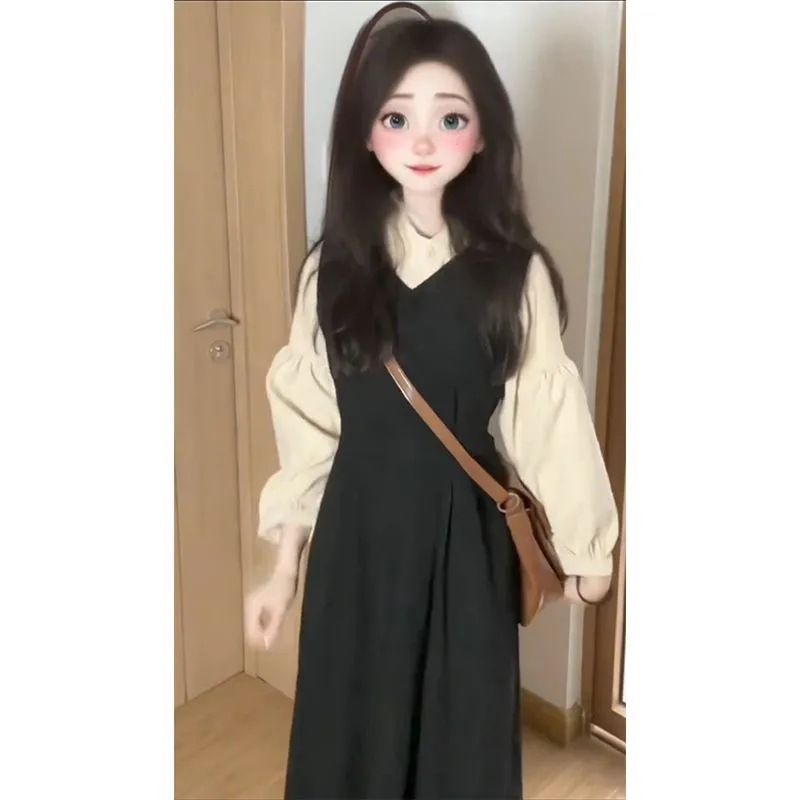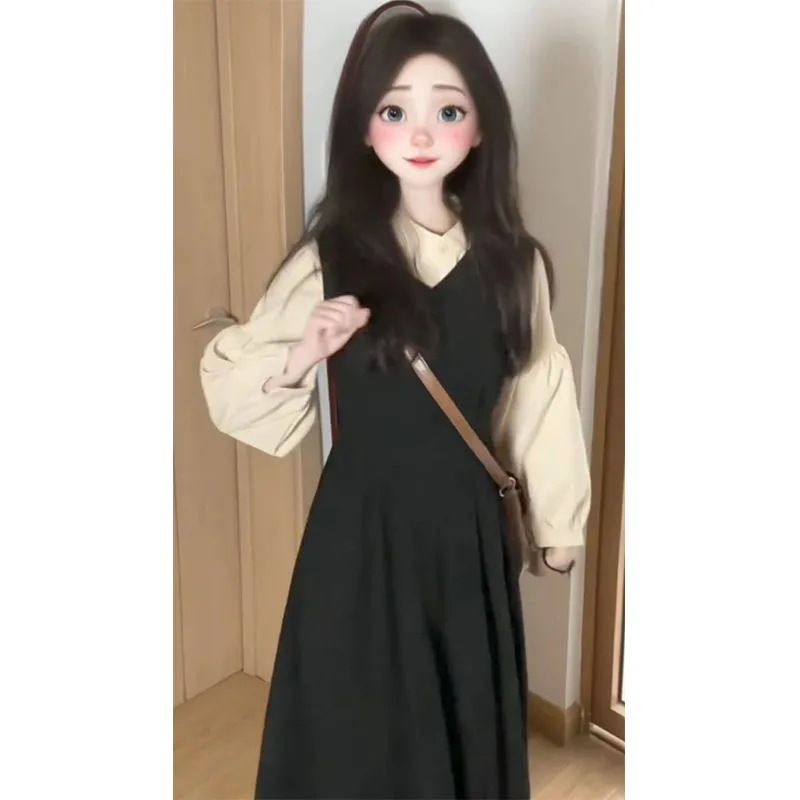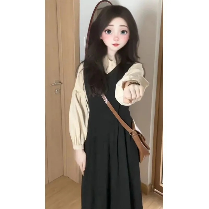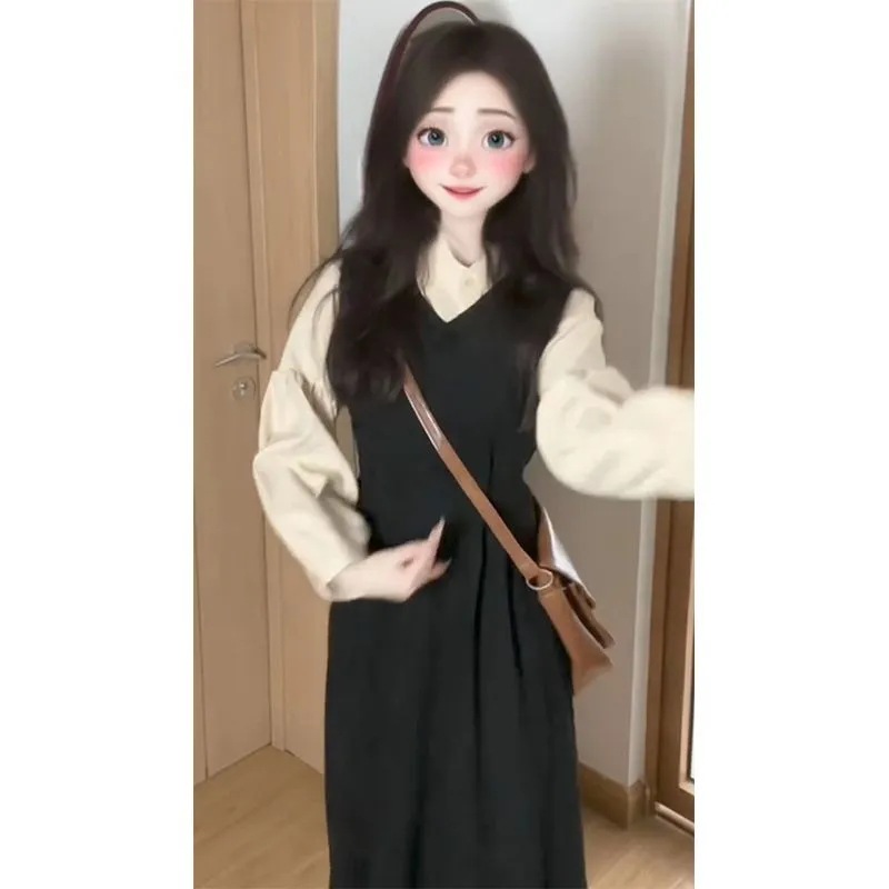 春秋季2025【新款黑色背心 连衣裙子女装】新年长裙 小个子穿搭 一整套装