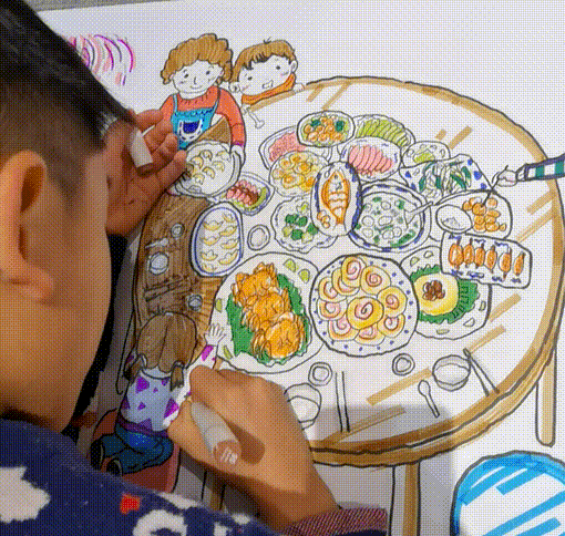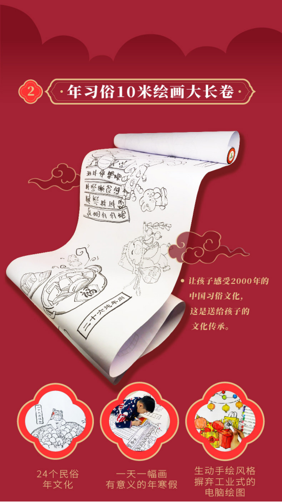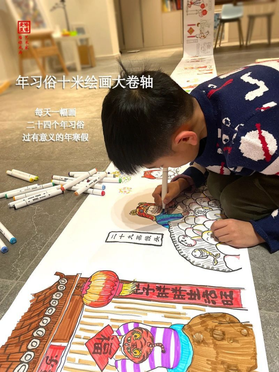 自西汉以来,过年的习俗一直延续到今天,在民间传统意义上的过年从腊八一直到正月十五,共有二十四个年习俗 从腊八到正月十五,24个年习俗,都绘制到10米长卷上,缓缓展开,一幅幅生动鲜活的习俗画面映入眼帘 孩子可以在画面上进行涂色、涂鸦、想象力创作,让孩子切身感受到丰富多彩的节日文化底蕴