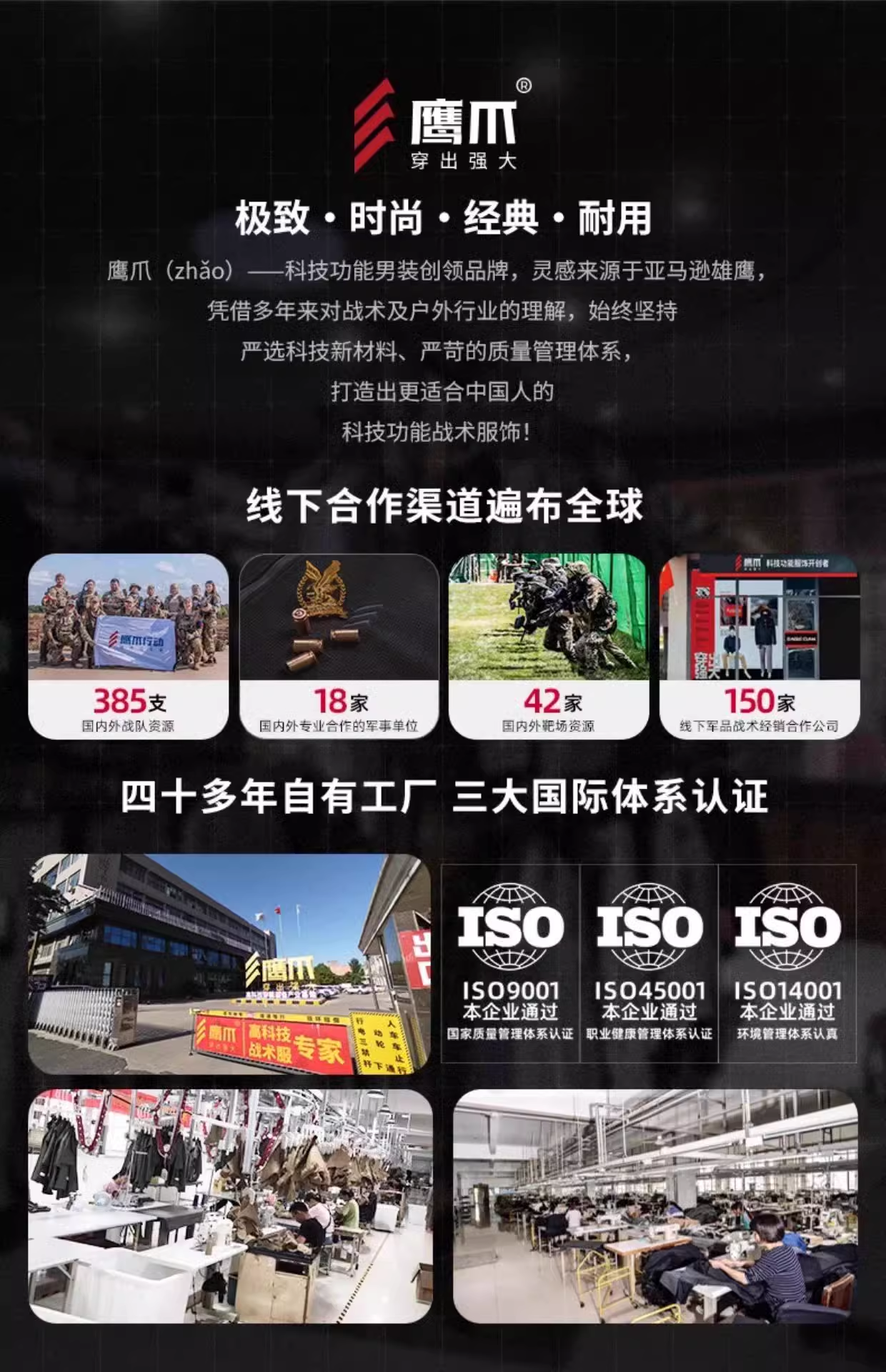 - 鹰爪,中国功能男装创领品牌,致力于服务中国3亿新中产阶级,着力打造全场景穿着体验创新平台,三十年产业深耕的积淀,以用户的痛点为己任,开创兼具军品与户外装备的功能动态穿着系统。
