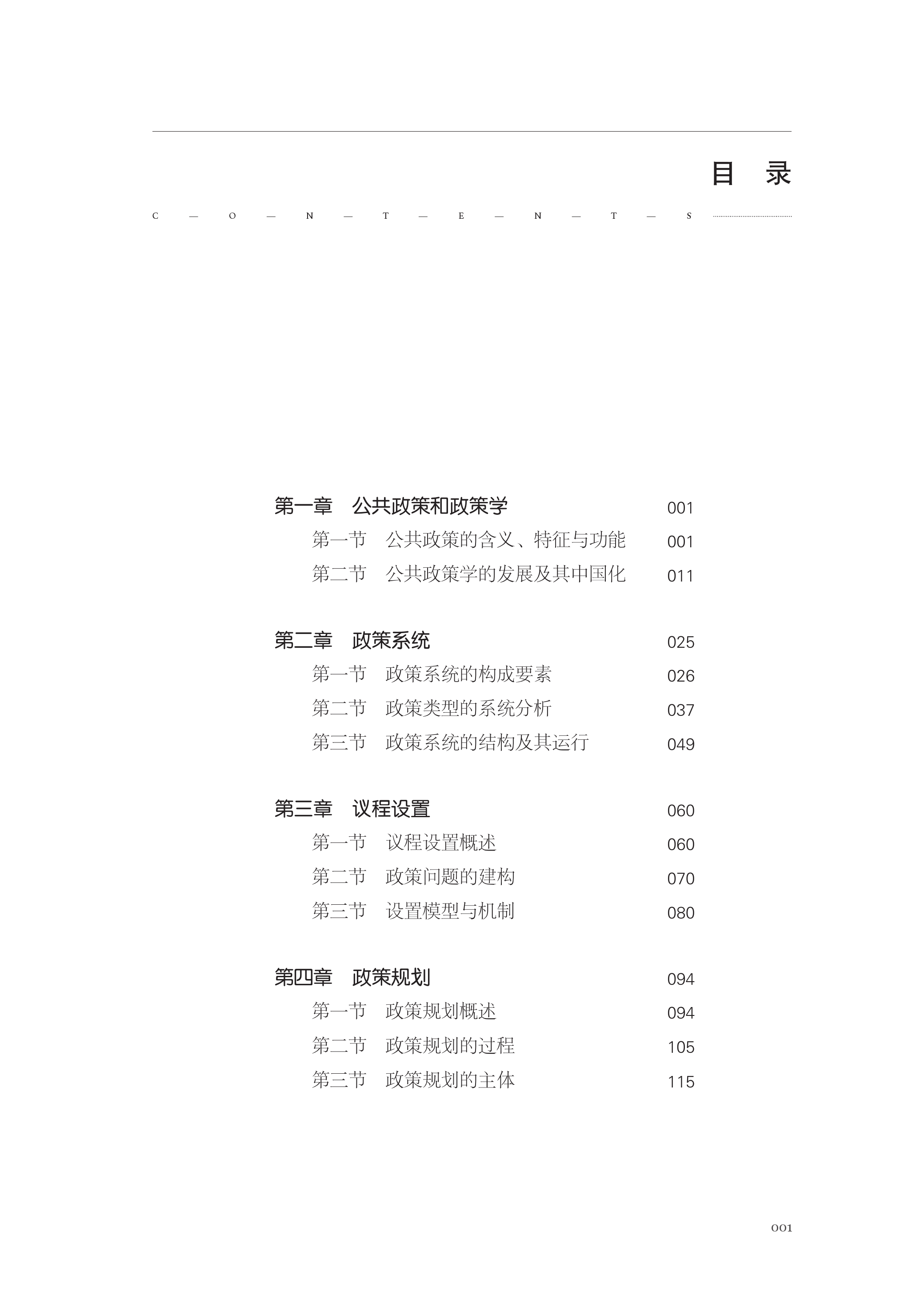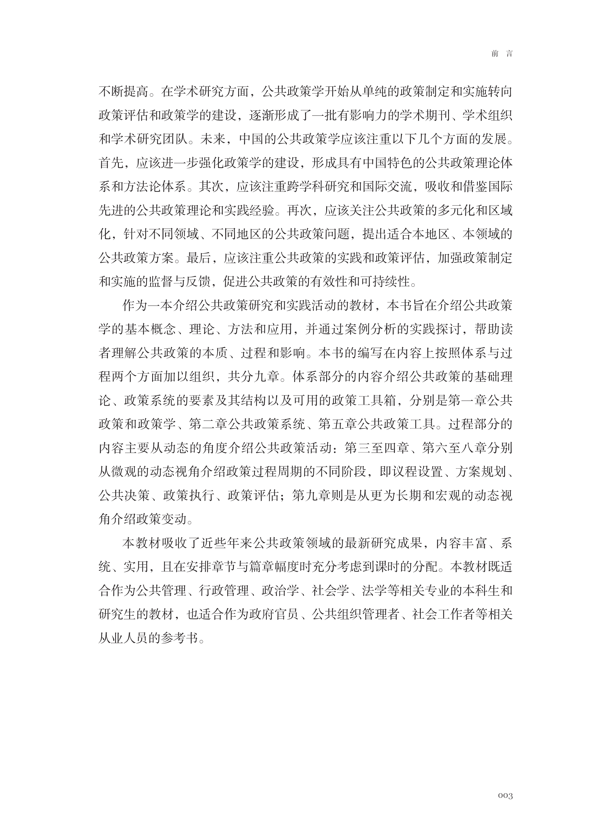 全书内容前沿,吸收了近年来公共政策领域的最新研究成果,同时兼顾理论的系统性与表述的可读性,其特征是按照体系与过程来组织内容,共分9章。体系部分介绍公共政策的基础理论、政策系统的要素及其结构以及可用的政策工具,分别为第1章导论、第2章公共政策系统、第3章公共政策工具;过程部分主要从动态的角度介绍公共政策活动,第4-8章分别从微观的动态视角介绍政策周期的不同阶段:议程设置、方案规划、公共决策、政策执行、政策评估;第9章是从更为长期和宏观的动态视角介绍政策变迁。