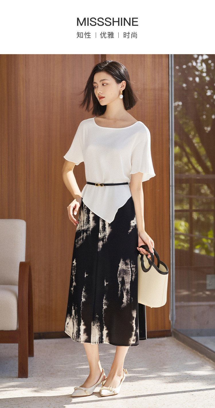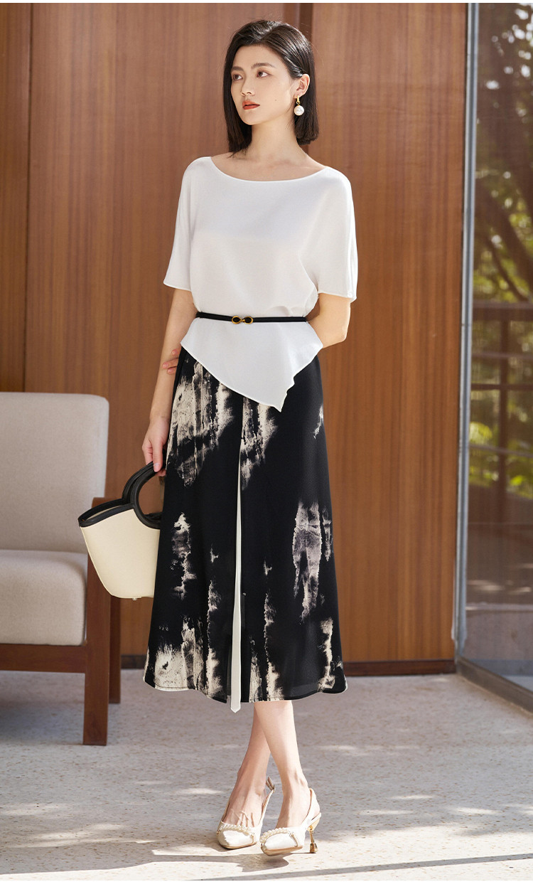 剩M 【休闲套装】2025夏季时尚桑蚕纯色T恤水墨印花A字半裙3742