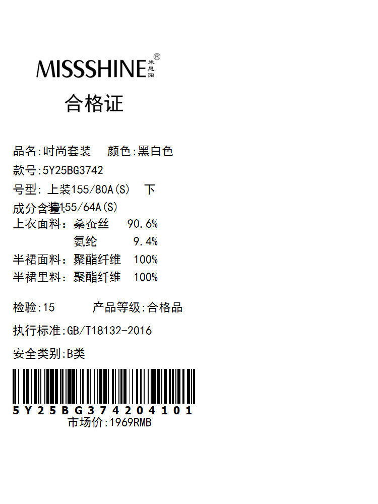 上衣面料:桑蚕丝90.6%氨纶9.4%