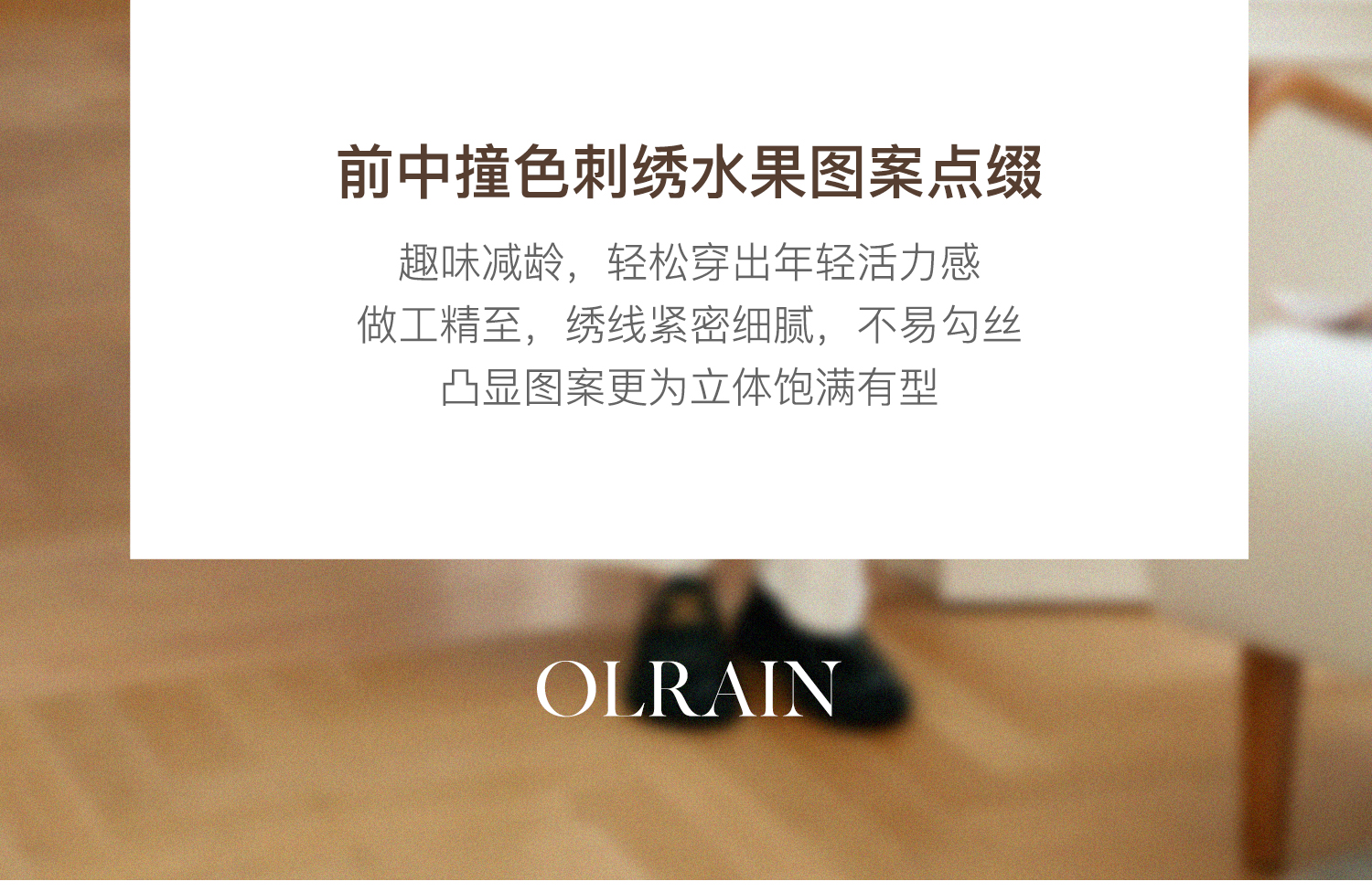 - “精致”是欧芮儿olrain品牌文化的核心,欧芮儿认为,精致的女人,不但要外在动人,更要内在迷人,内外兼修,有魅力、有气质、有内涵,自信而不自傲,优雅而不矫揉,自有万种风情而不轻浮,更不故作矜持。