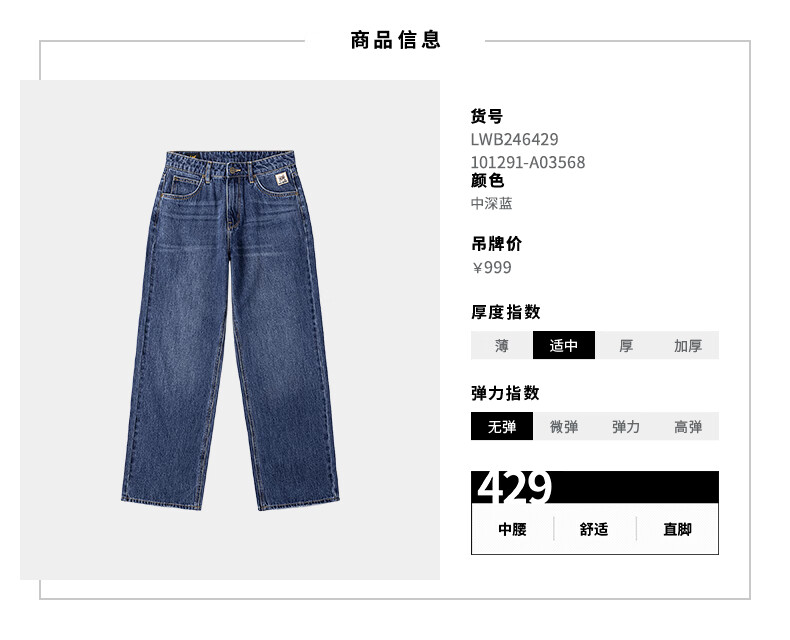 LEE新品429舒适直脚中深蓝女牛仔裤潮LWB246429101291