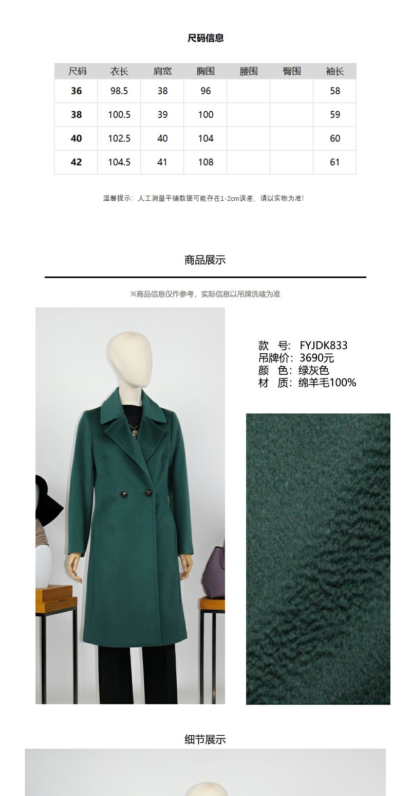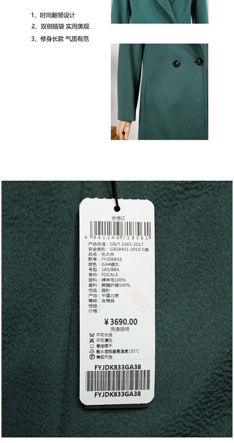 FOCALS福柯斯冬季长袖修身中长款纯色羊毛大衣外套FYJDK833GA