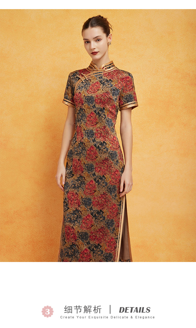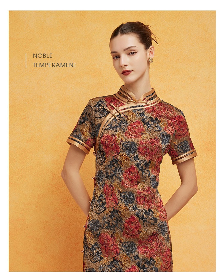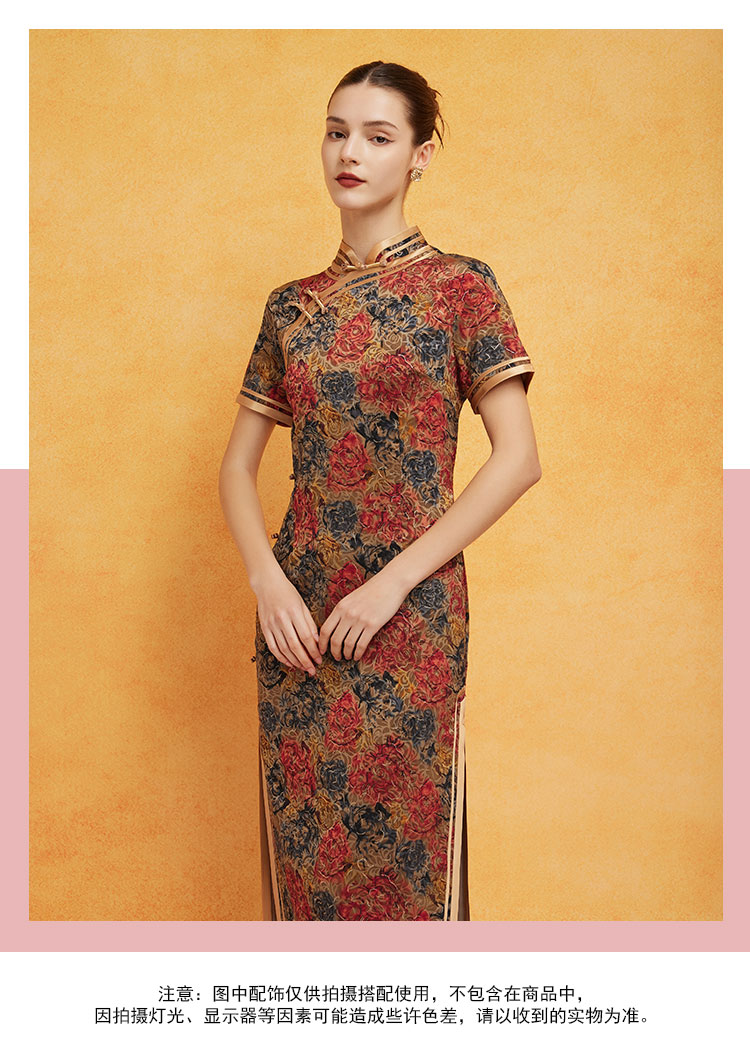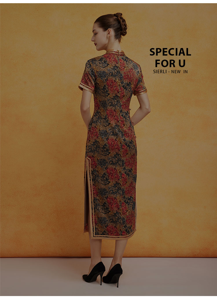 PF8G9斯尔丽2024新款花开富贵旗开得胜短袖改良旗袍中长修身显瘦连衣裙