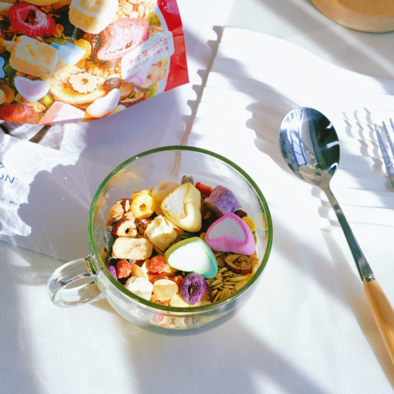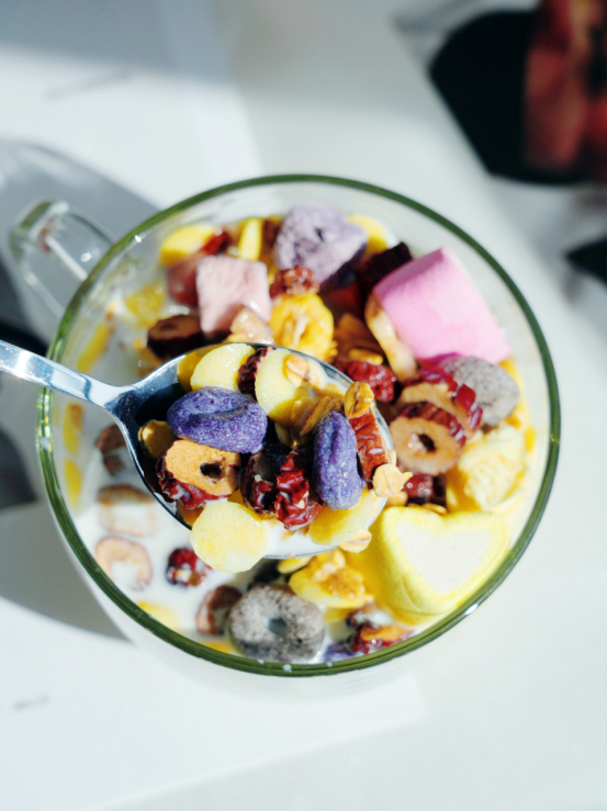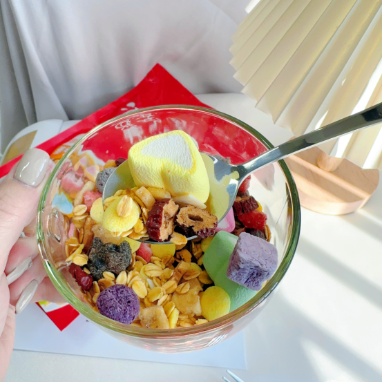 一日之计在于晨 作为一个懒人,早餐当然是越简单越好 传统燕麦片早就打破单一的印象了! 干吃、泡牛奶、拌酸奶!! 只要你喜欢,它都可以! 营养满满、口感满满、颜值满满 大块的果干、冻干酸奶块,吃着超过瘾