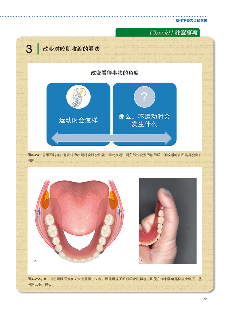 (3)下颌义齿的策略讨论了下颌印模的常见误区和正确方法,如何确保义齿的固位力和稳定性。通过临床案例展示了下颌舌骨嵴区域、颊棚等关键部位的设计要点,以及如何避免常见错误。
