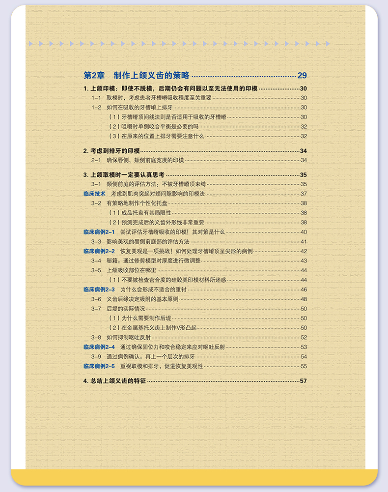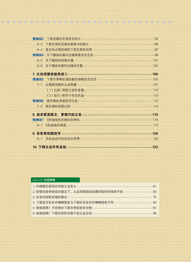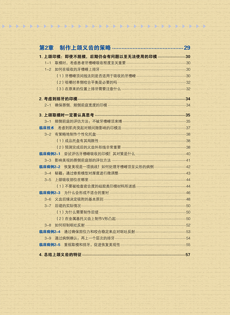 (2)上颌义齿的策略详细介绍了上颌印模的取样技巧、排牙方法,以及如何根据牙槽嵴吸收情况调整义齿设计。强调了上颌义齿后缘的设计原则和后堤的重要性,提供了实用的操作建议。