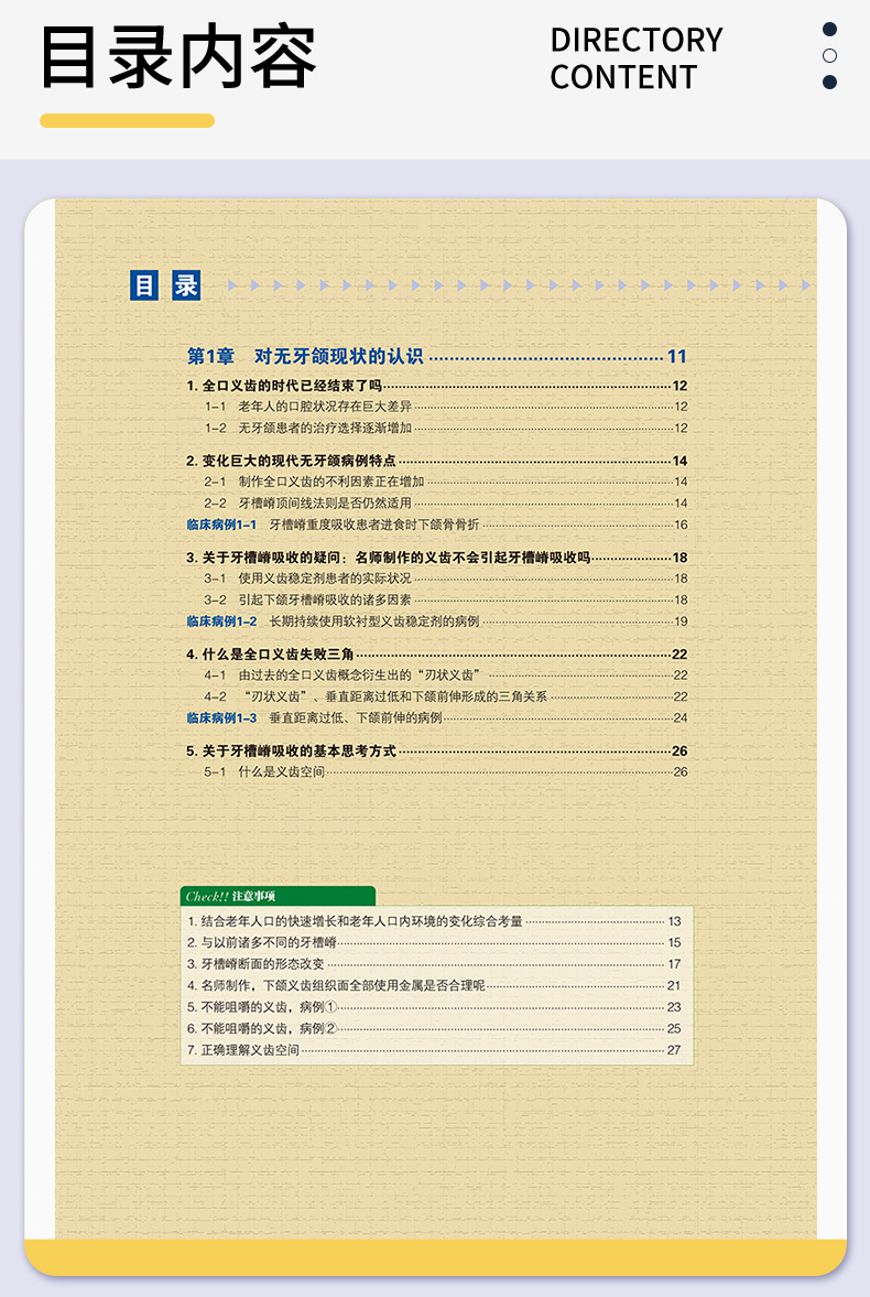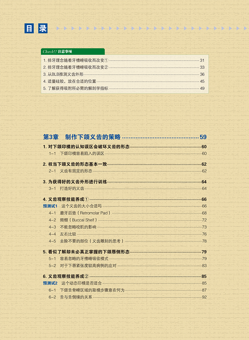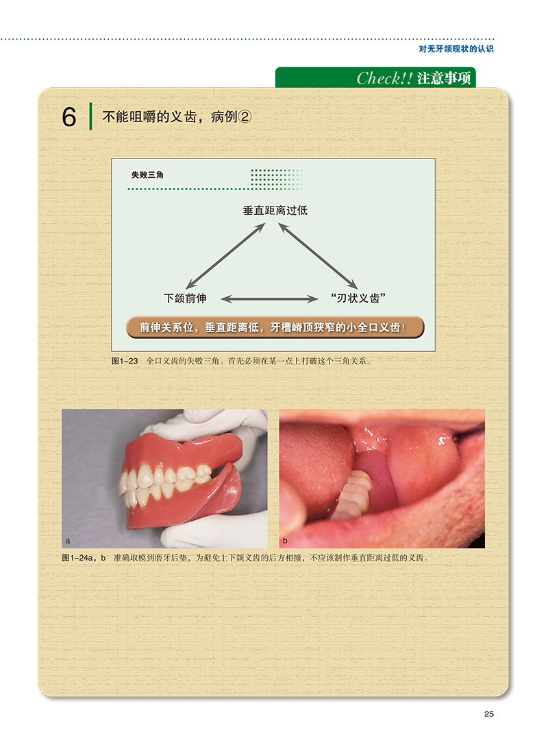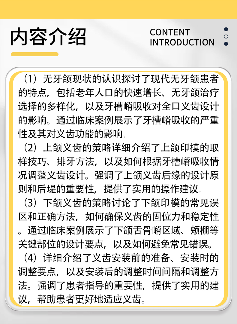 (4)详细介绍了义齿安装前的准备、安装时的调整要点,以及安装后的调整时间间隔和调整方法。强调了患者指导的重要性,提供了实用的建议,帮助患者更好地适应义齿。