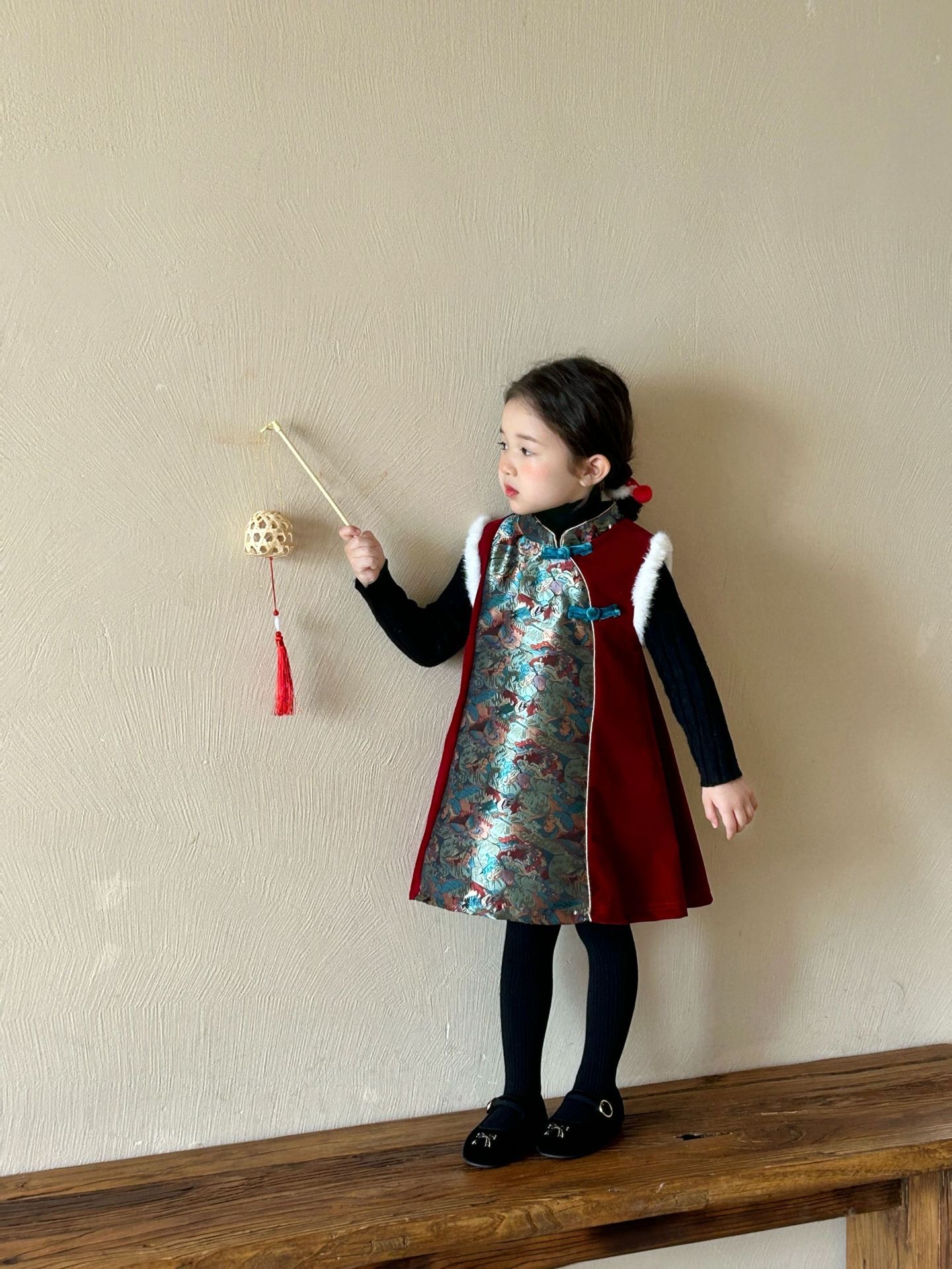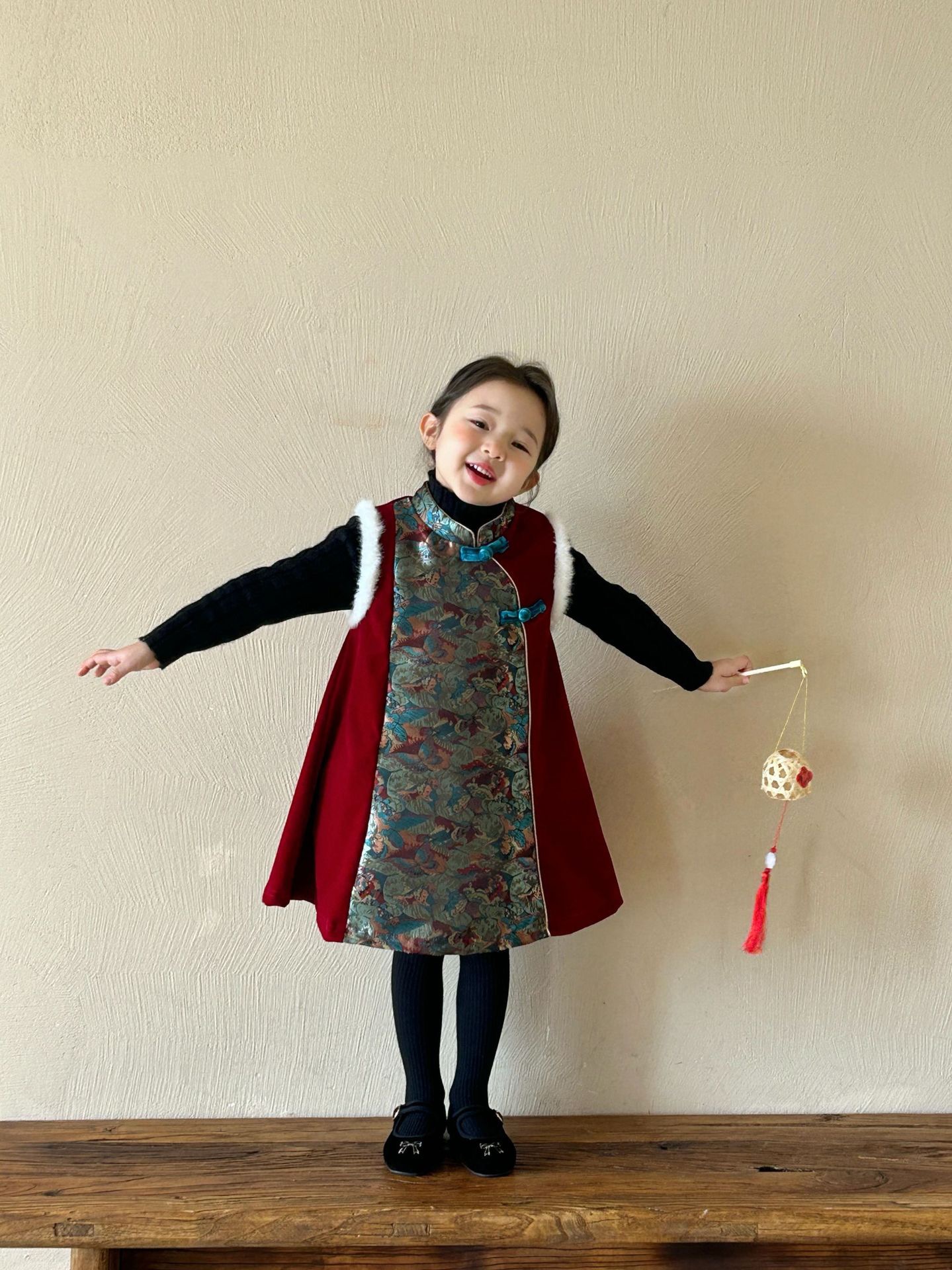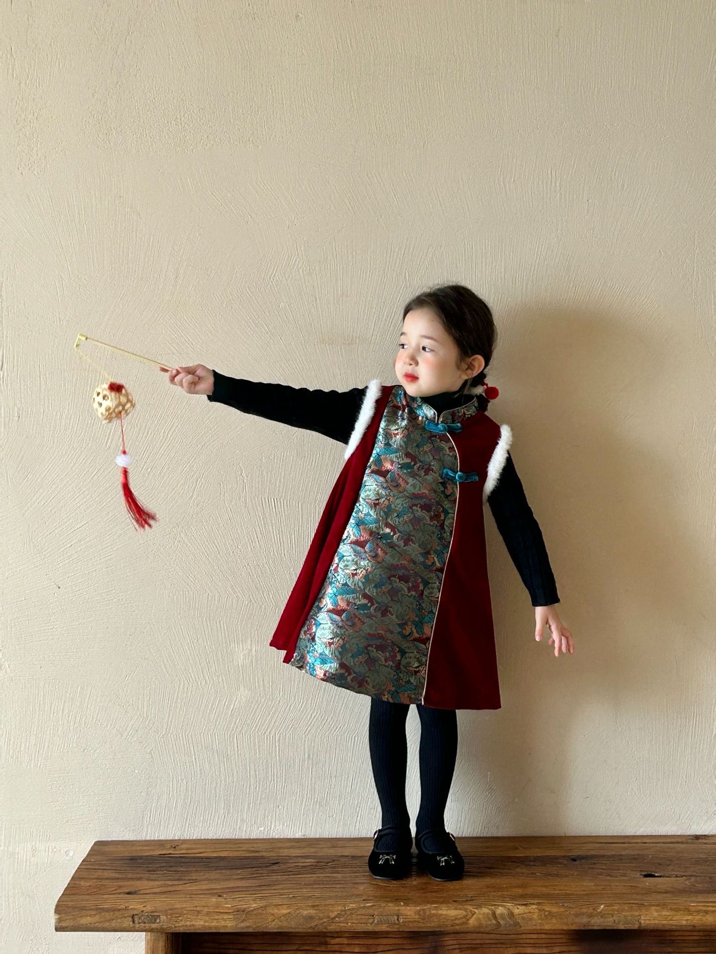 【YW】无忧购国风新中式童装镶毛拼色旗袍裙年服QZ386(截单后7天发货)