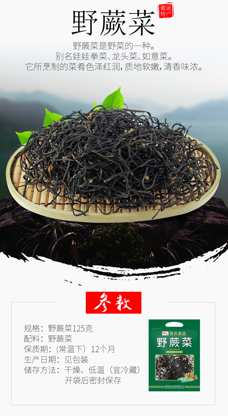 詹氏 山珍系列 野蕨菜125g*2袋 质地软嫩 清香味浓 48小时发货