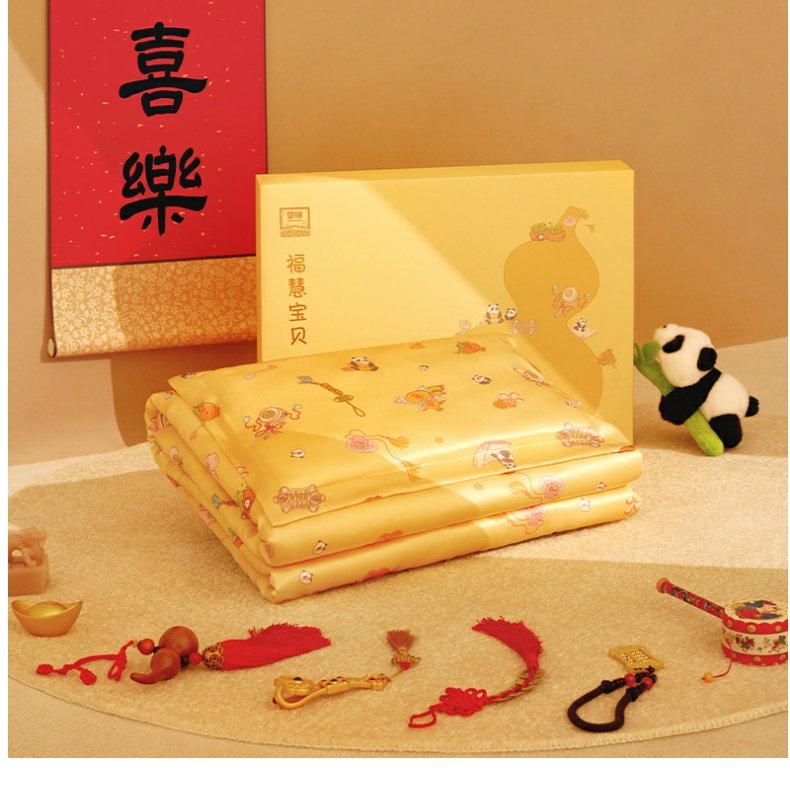 【皇锦】真丝印花婴童蚕丝小被抓周被枕头礼盒套装-福慧宝贝HJ11743
