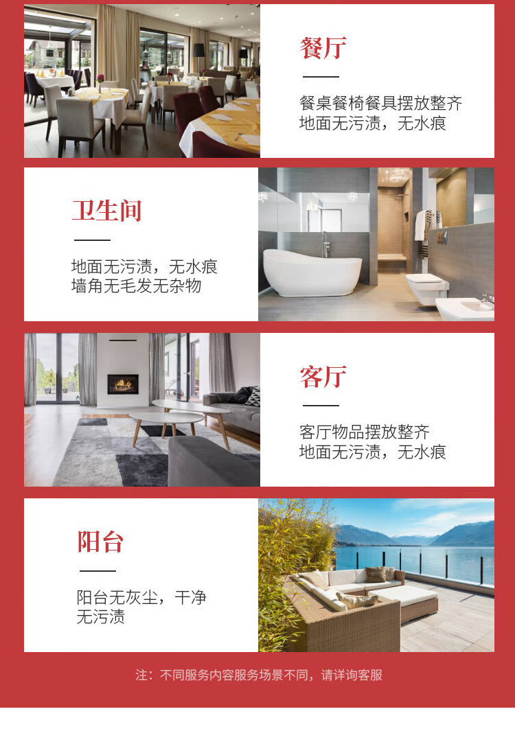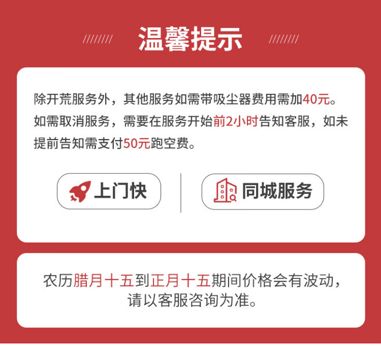 服务说明:临近春节期间库存较满,请提前安排您的保洁服务,若因库存问题导致无法服务,请您谅解!