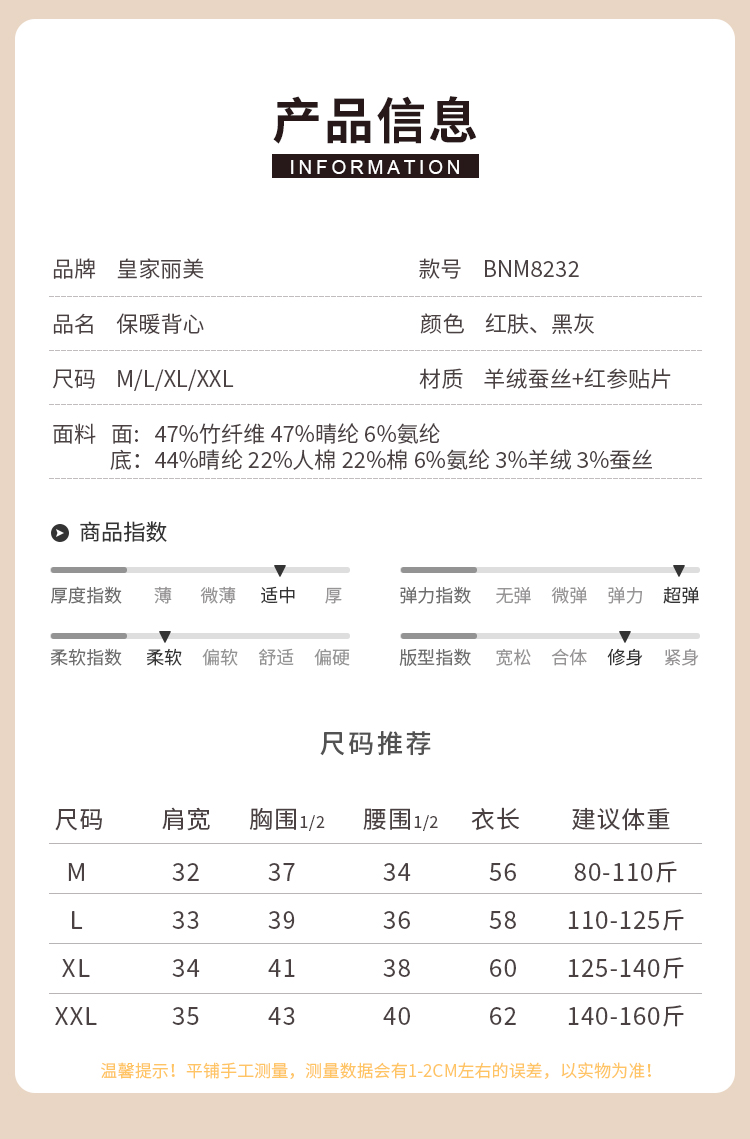 皇家丽美保暖背心内衣女士羊绒蚕丝无痕背心BNM8232