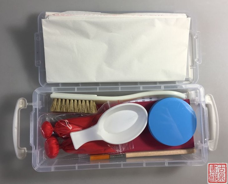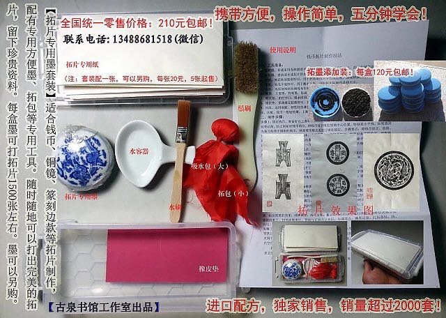 套装包含:拓包1个、打包1个、打刷1个、垫子1个、拓片专用纸1大张、水笔1支,使用技法1份。