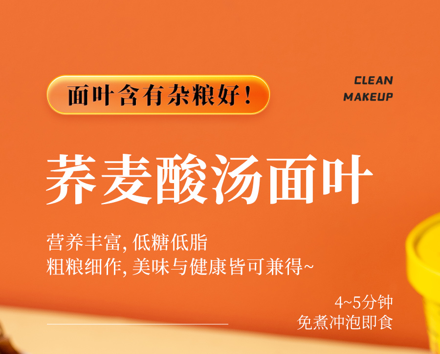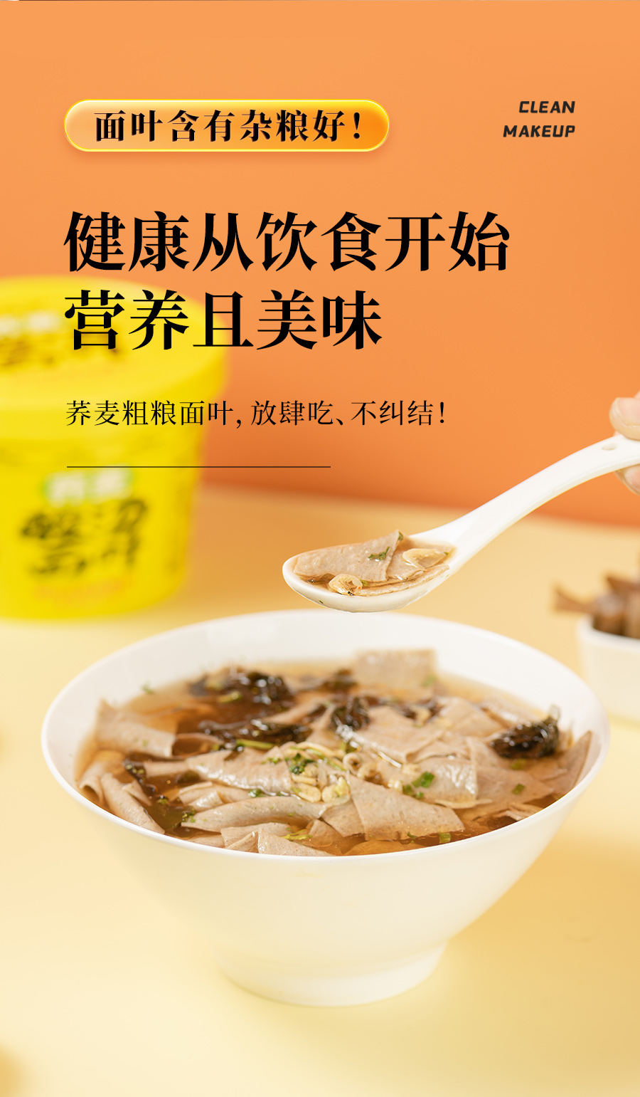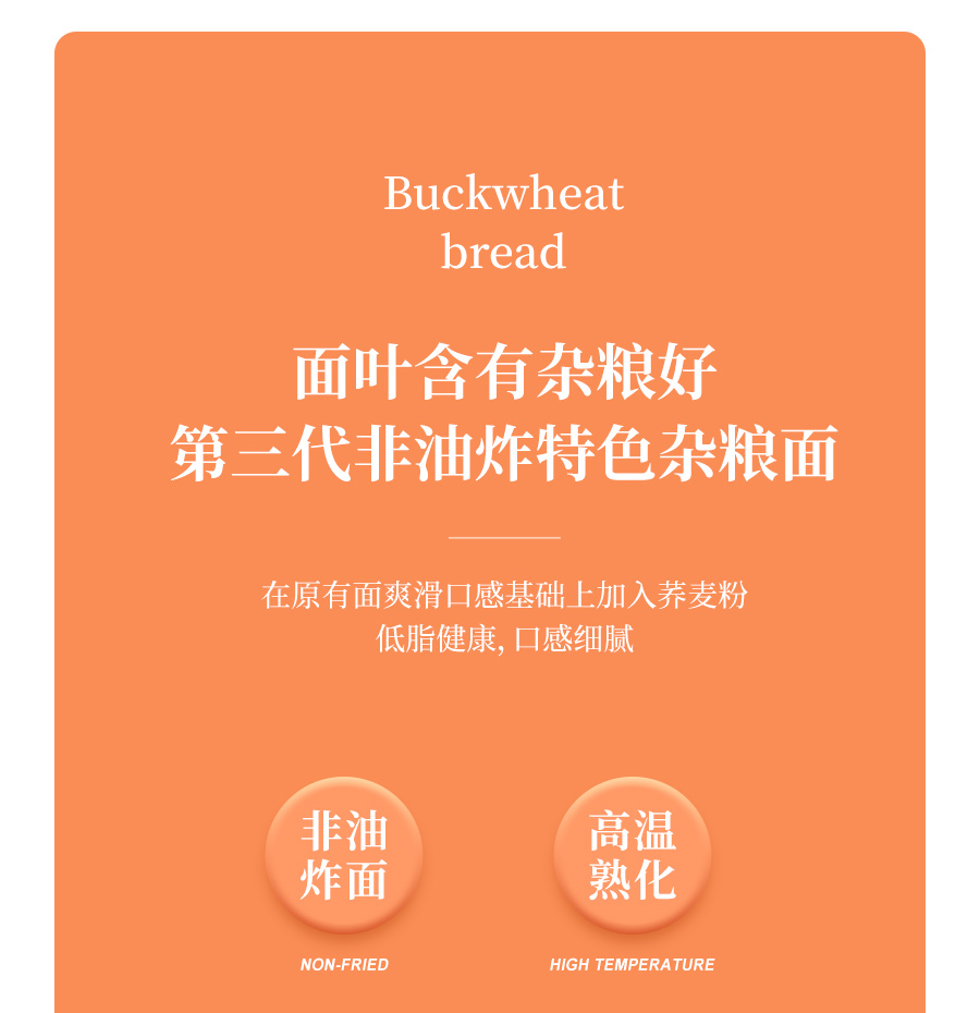 2.采用三道和面技术,面体爽滑劲道有弹性、面叶含有杂粮,非油炸低糖低脂美味和健康兼得。