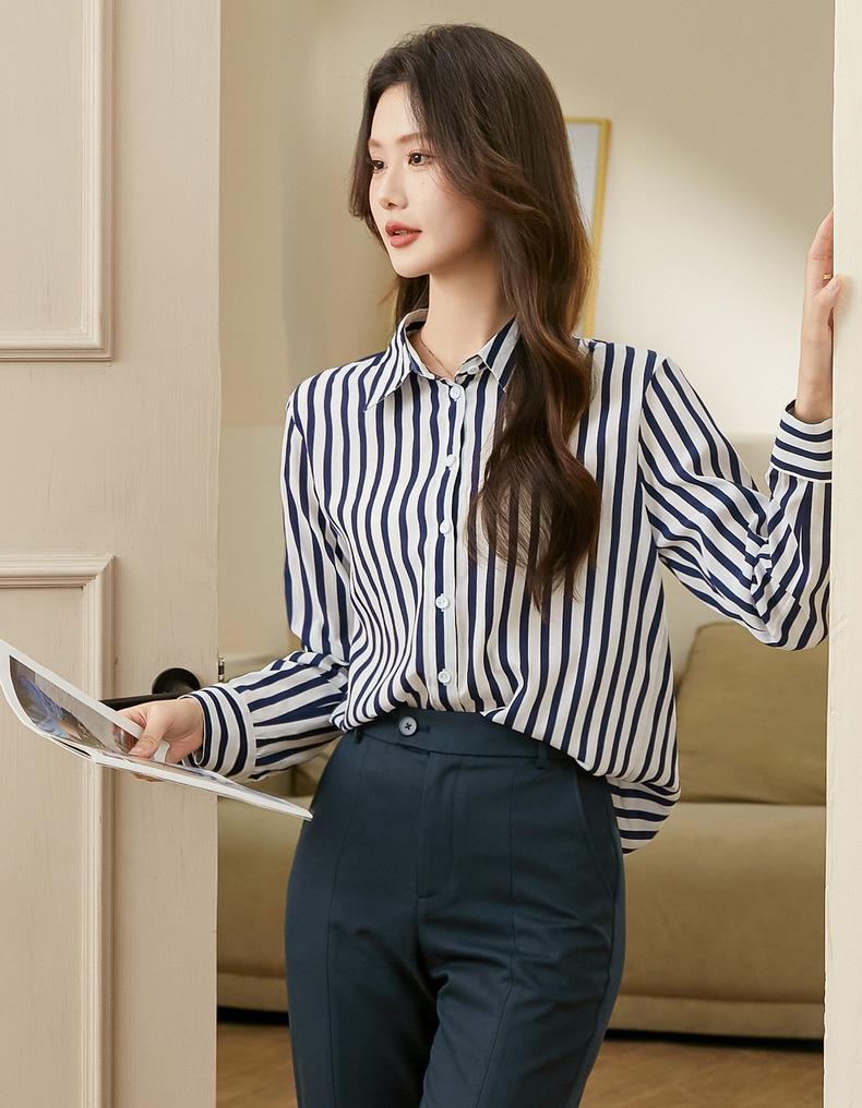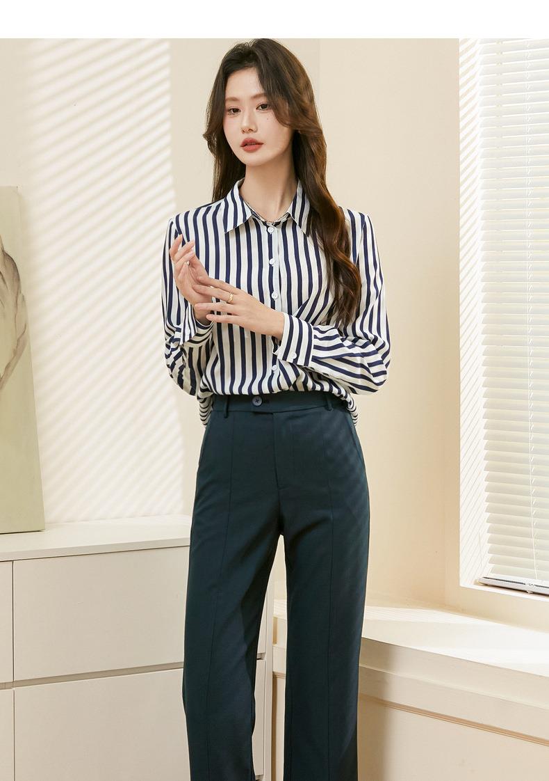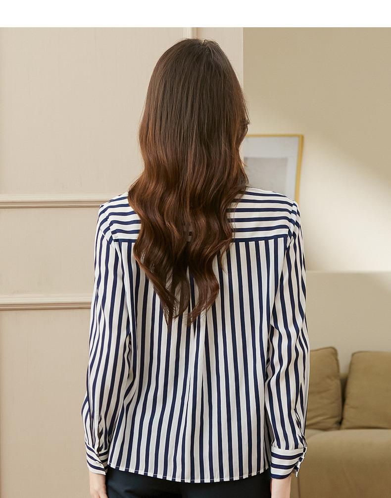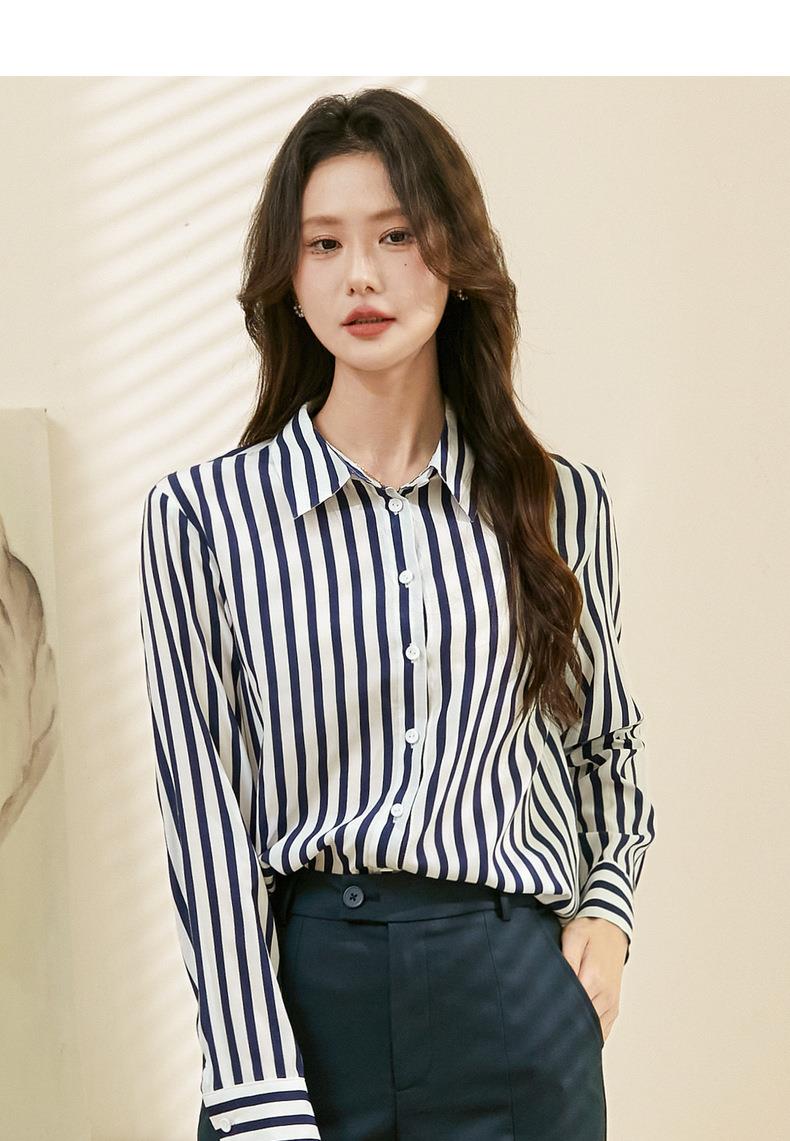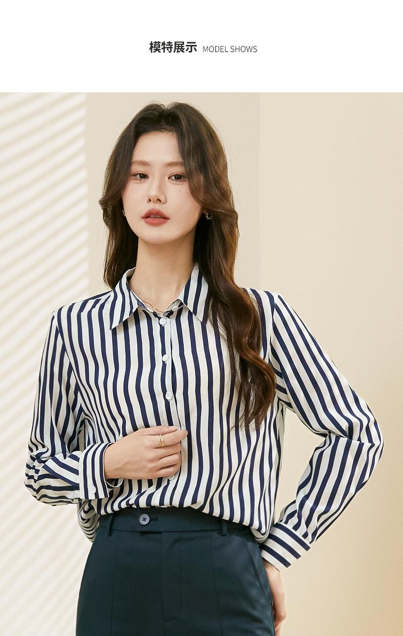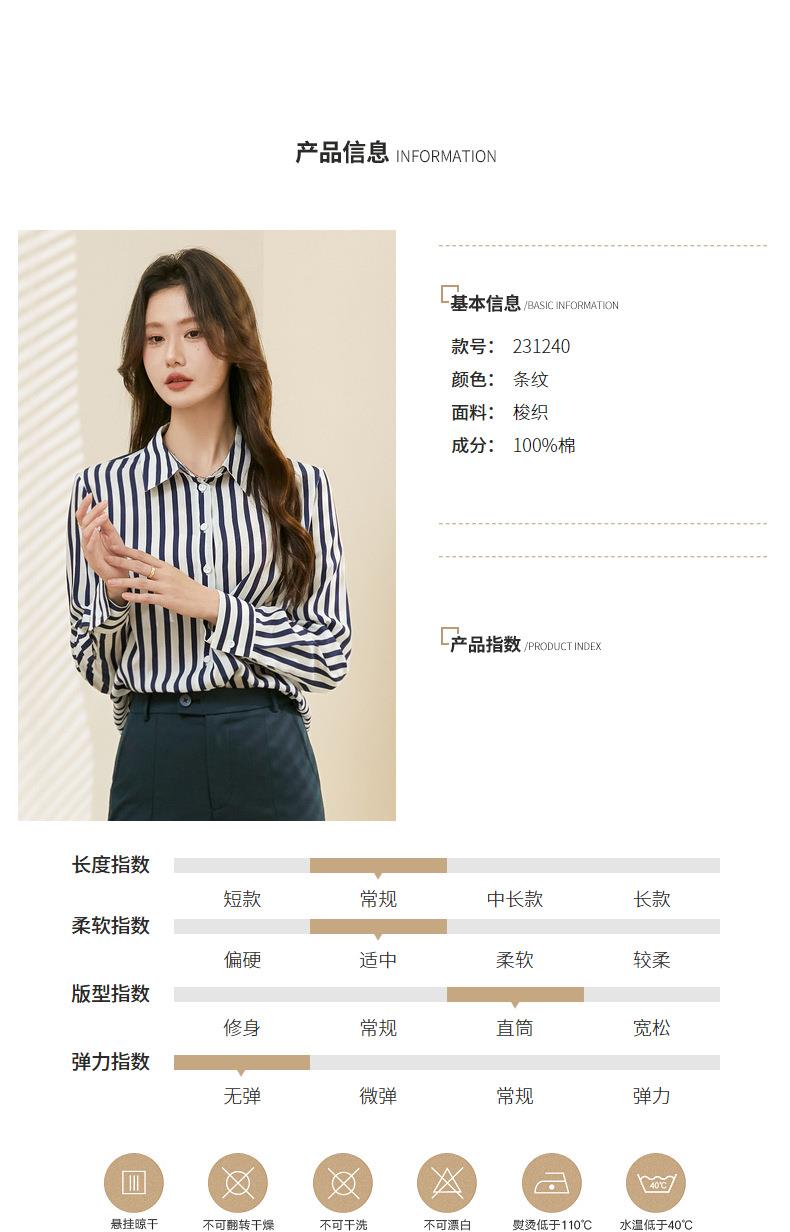 百姿 条纹自留款翻领衬衣2023早秋新款长袖气质OL衬衫女231240