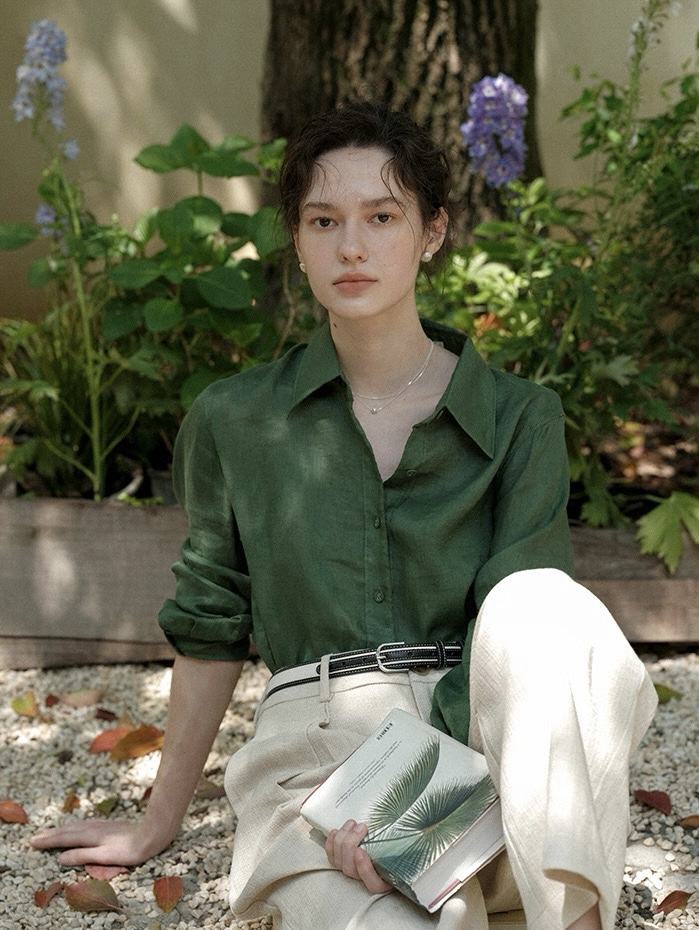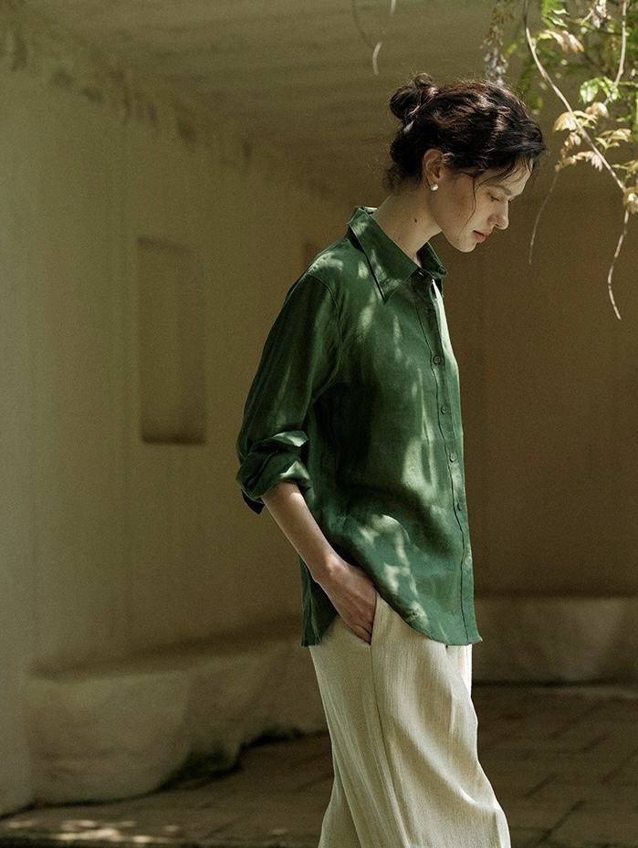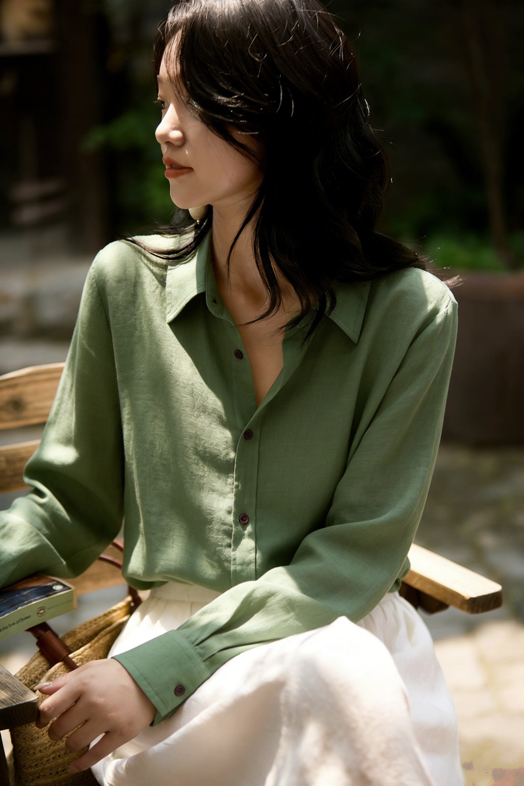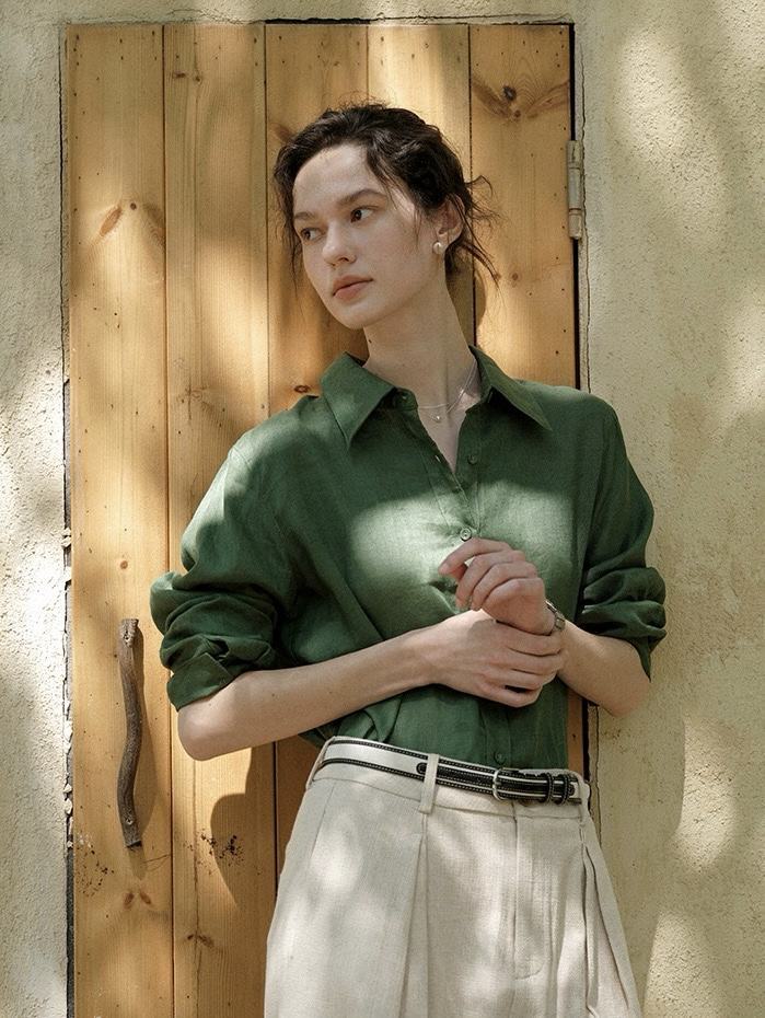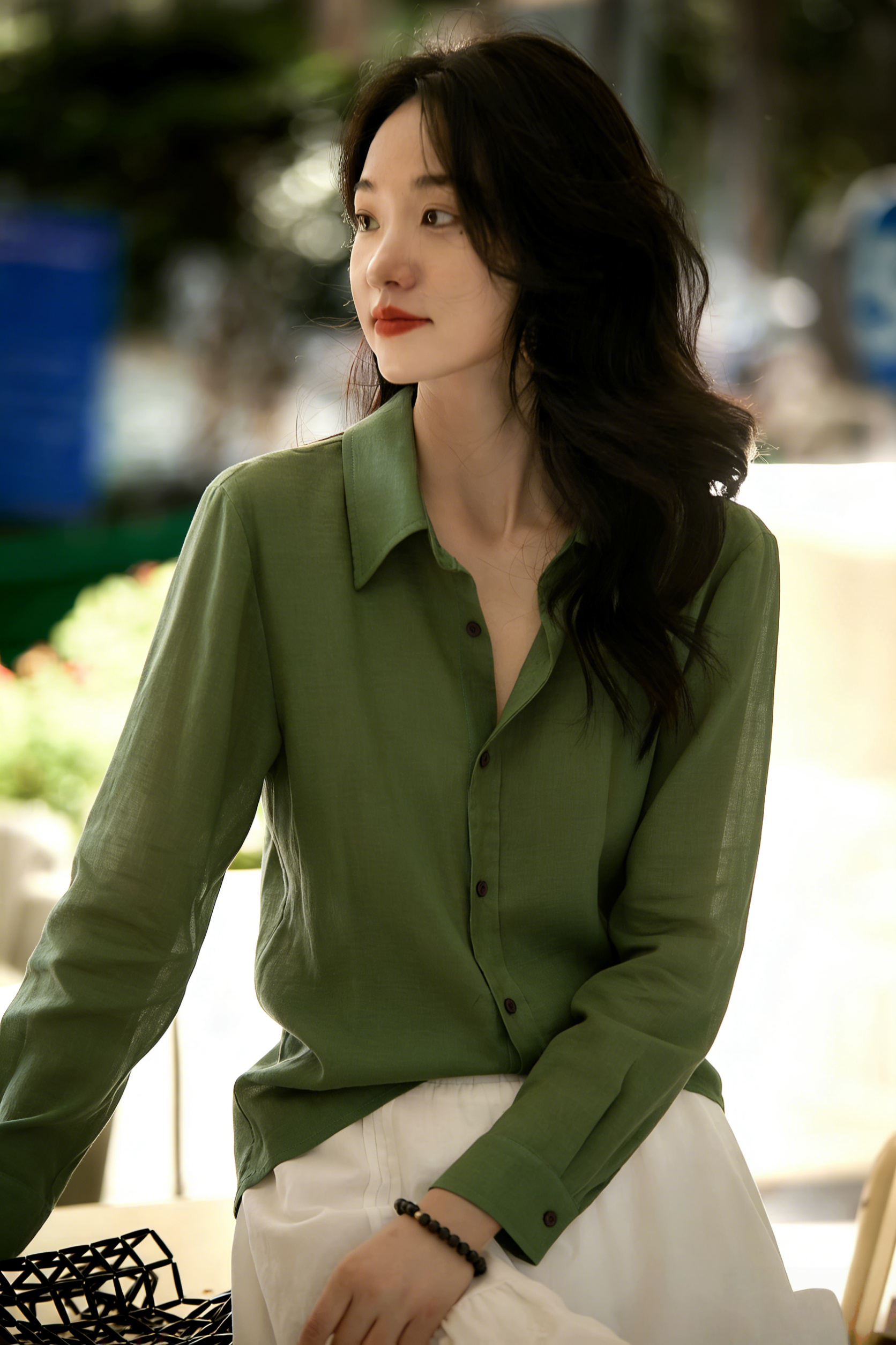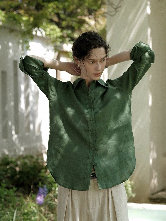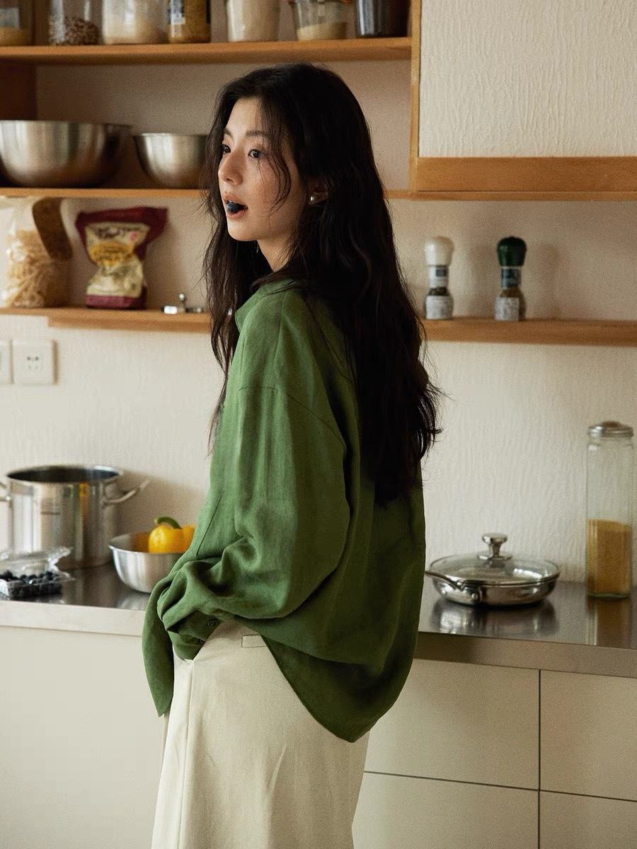 【下单3-7天发货】ORIGNAL&CO松绿色苎麻长袖衬衫,面料轻薄透气,夏天穿也可以保持干爽,宽松版型 不限制任何身材,遮肉显瘦!