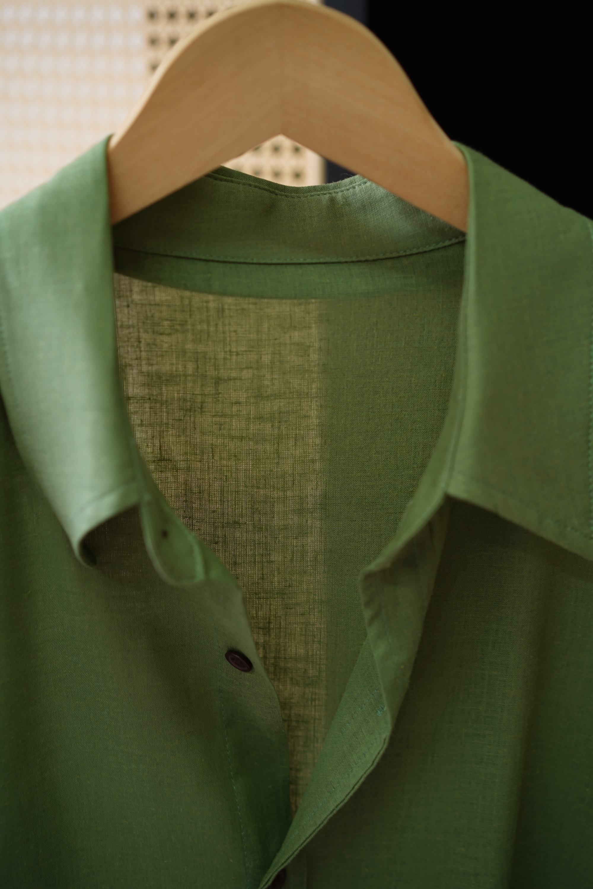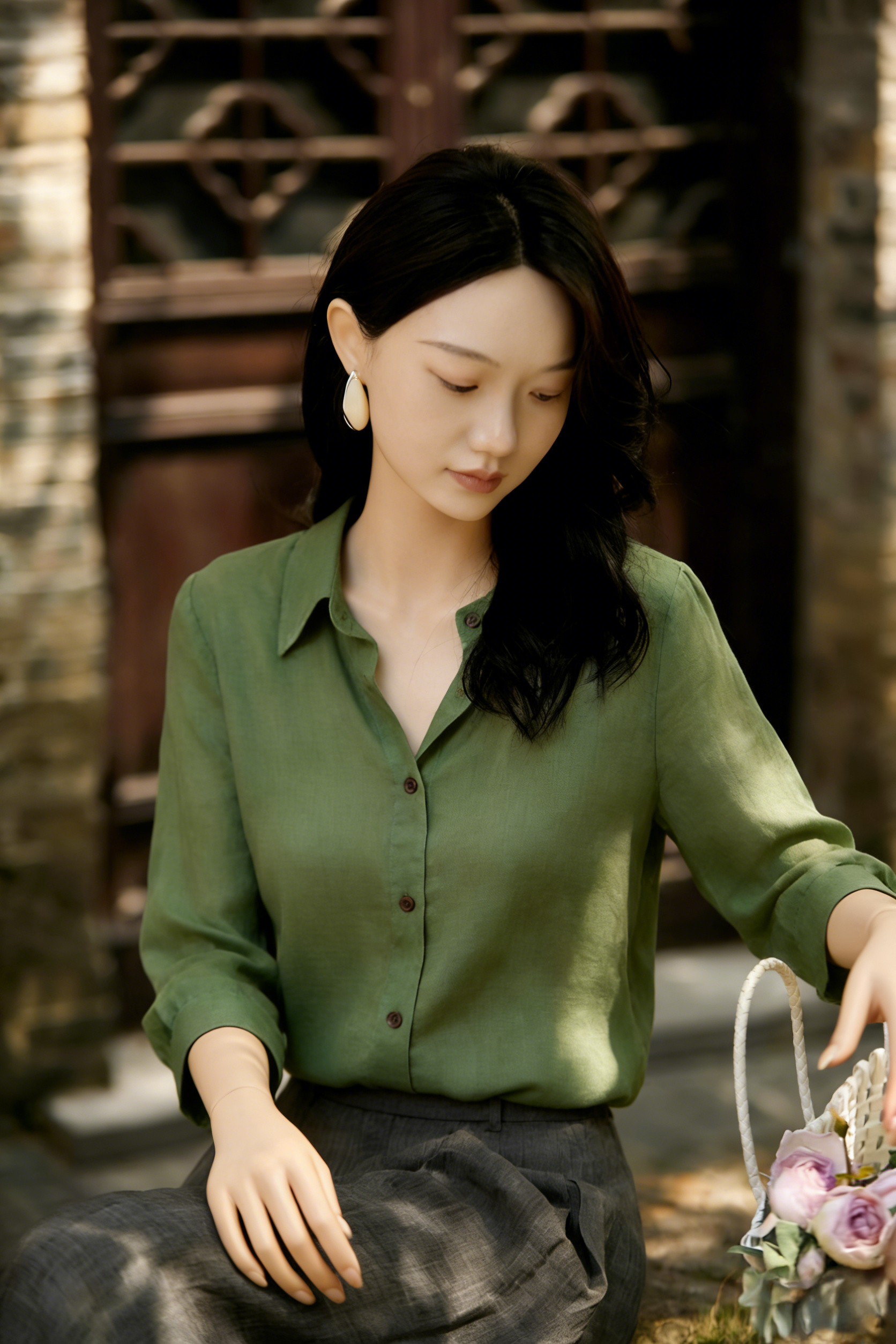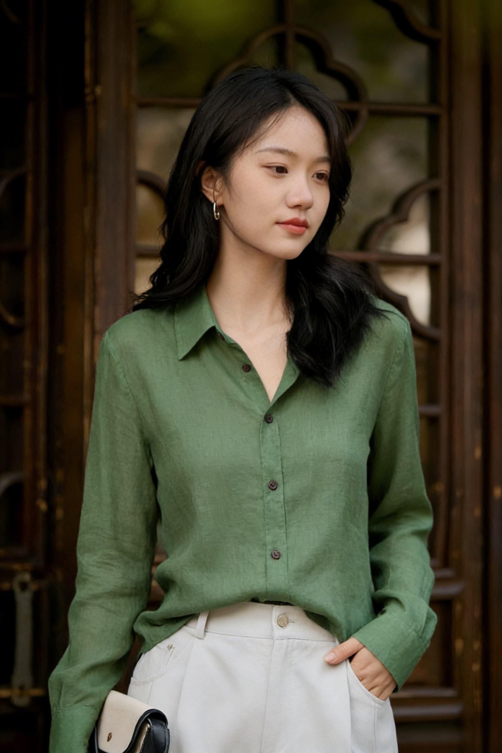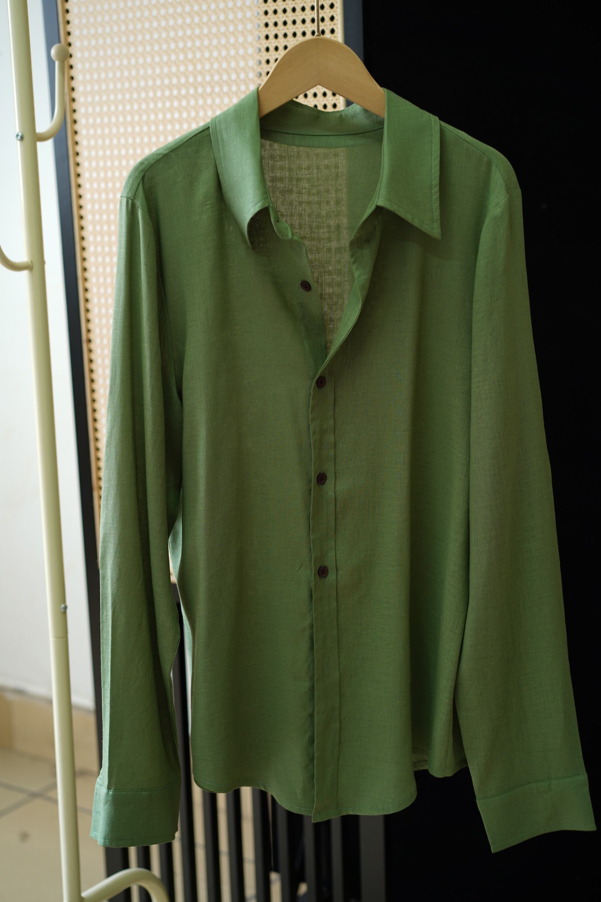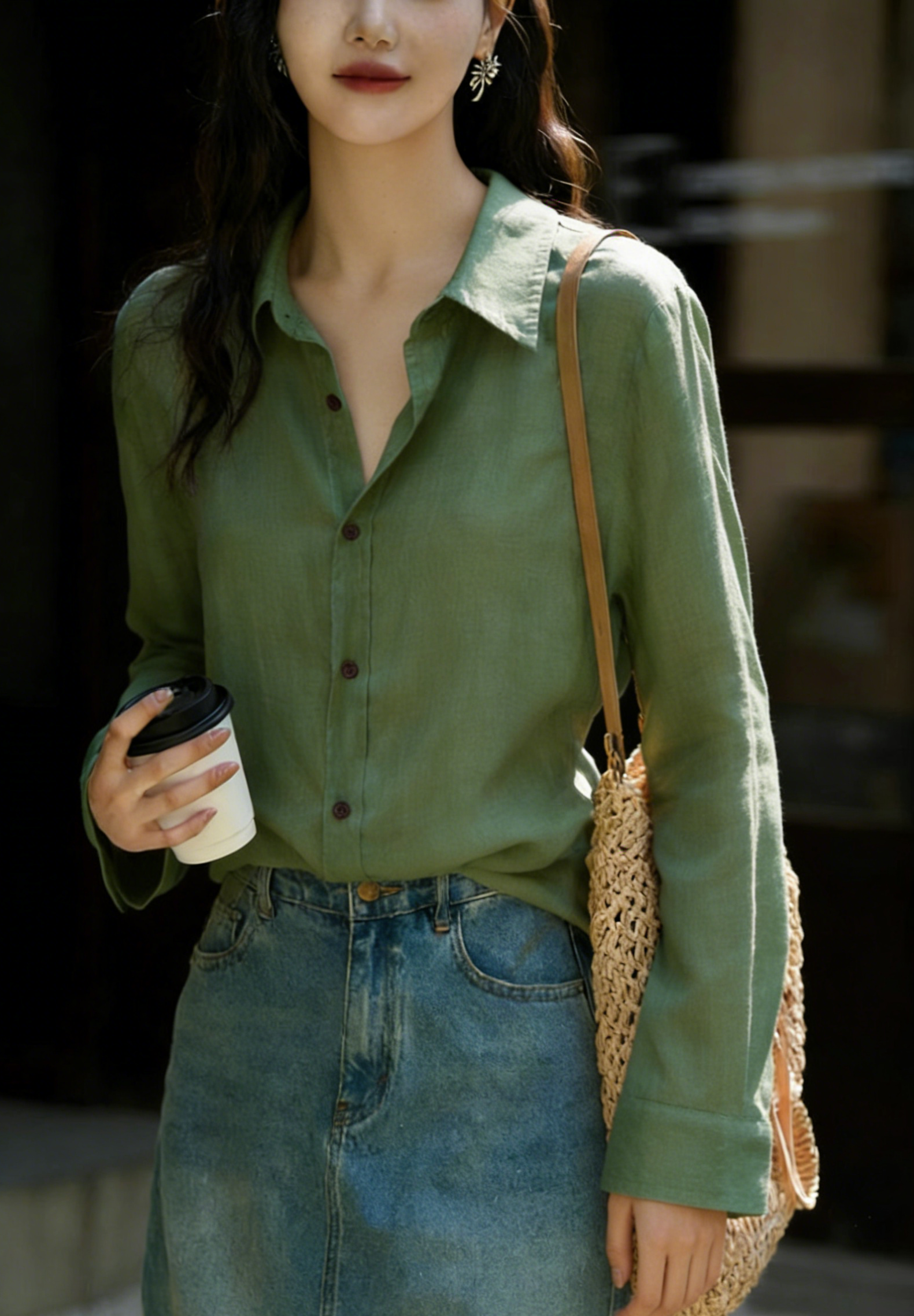 【下单3-7天发货】ORIGNAL&CO松绿色苎麻长袖衬衫,面料轻薄透气,夏天穿也可以保持干爽,宽松版型 不限制任何身材,遮肉显瘦!