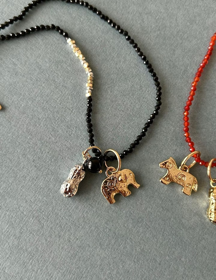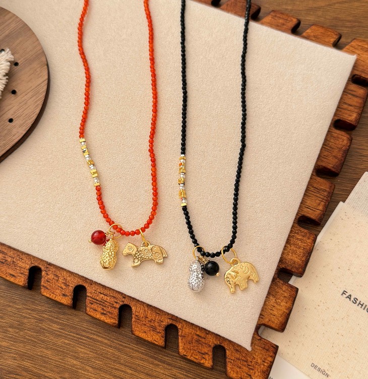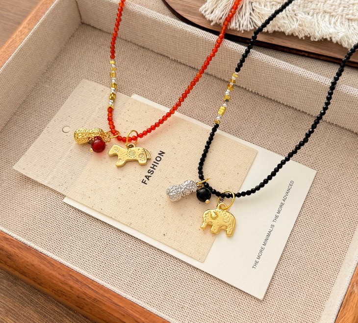 第一款【花生小象 小马项链】 ✅两种颜色可选🔥中间点缀零星的珍珠与小碎金、碎银✨层次感满满 ✅后侧搭配金色可调节延长链🌟能根据穿搭需求调整长度👏佩戴更方便 ✅寓意谐音"好事发生""马到成功"的美好祝愿🧧