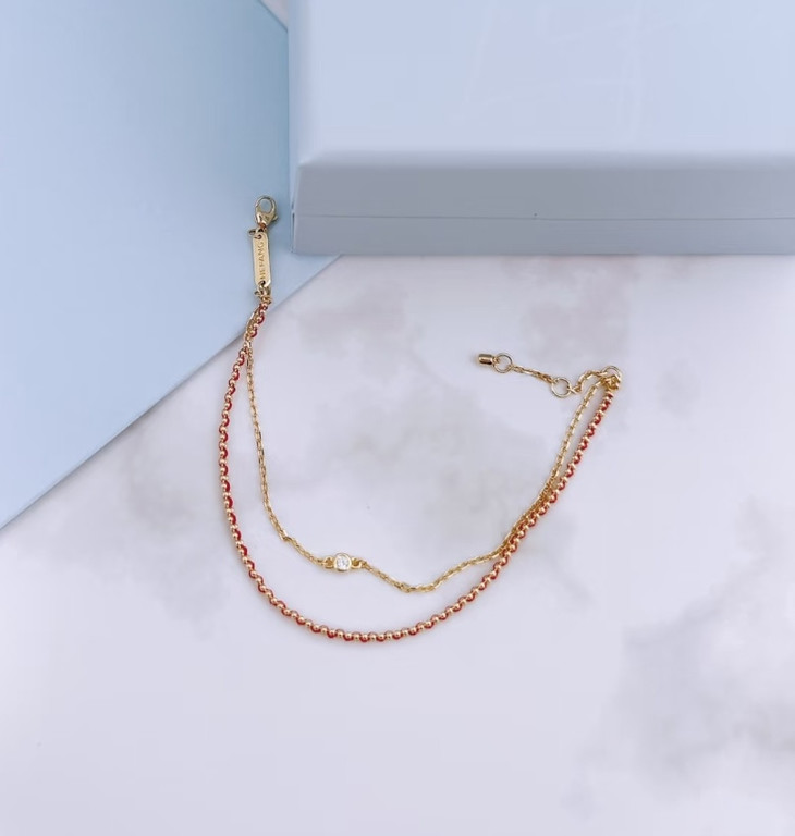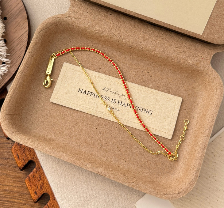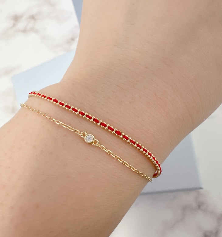 ✅采用编织缠绕式设计 寓意福气加身带来幸福与好运 🍀 假两件设计 红绳以双排玻珠链穿行素链以璀璨包镶锆石点缀 注入时髦巧思~