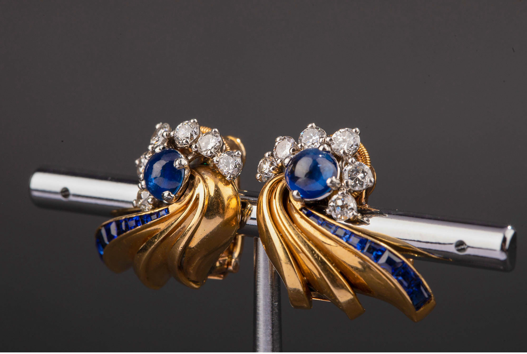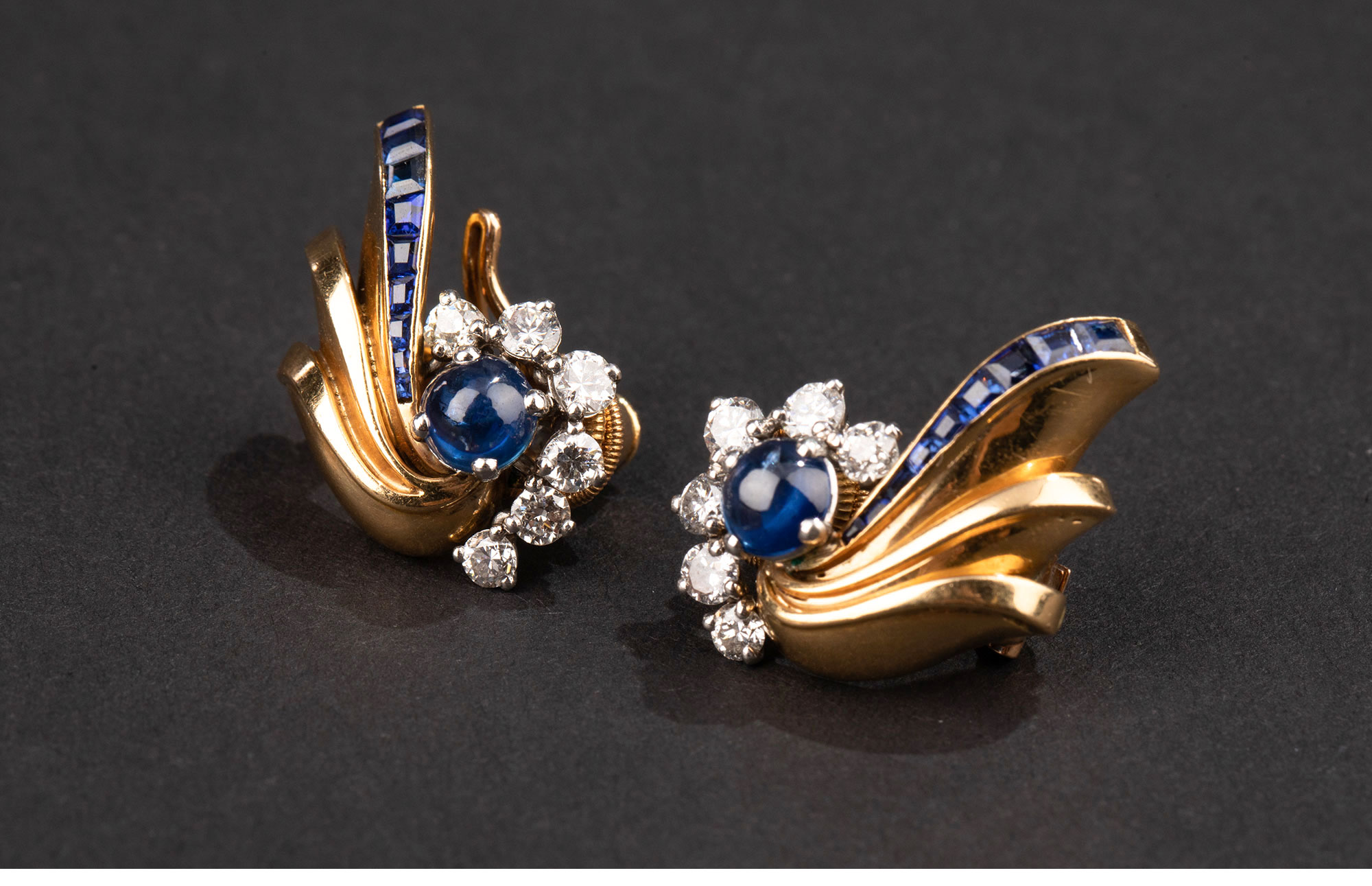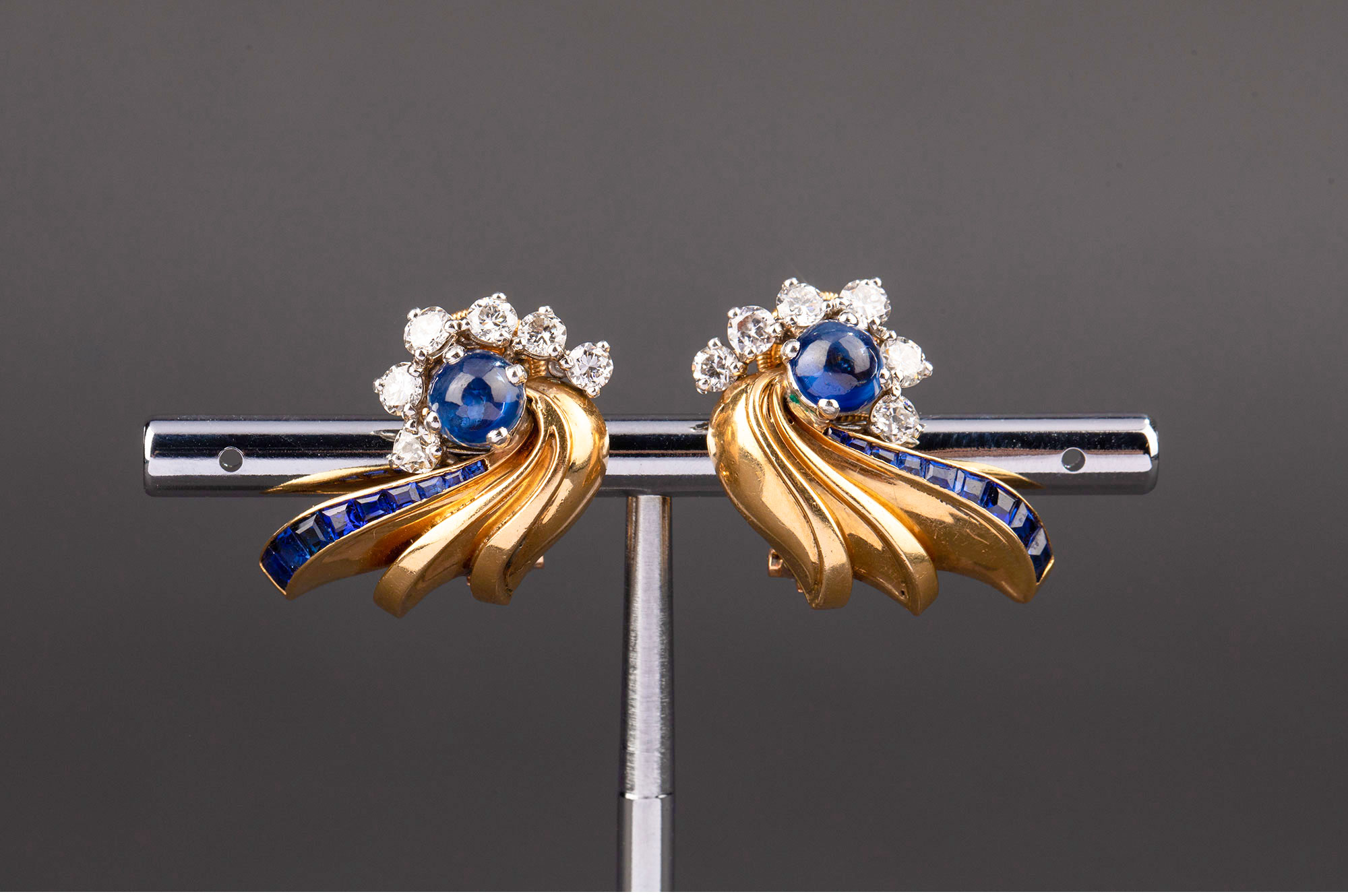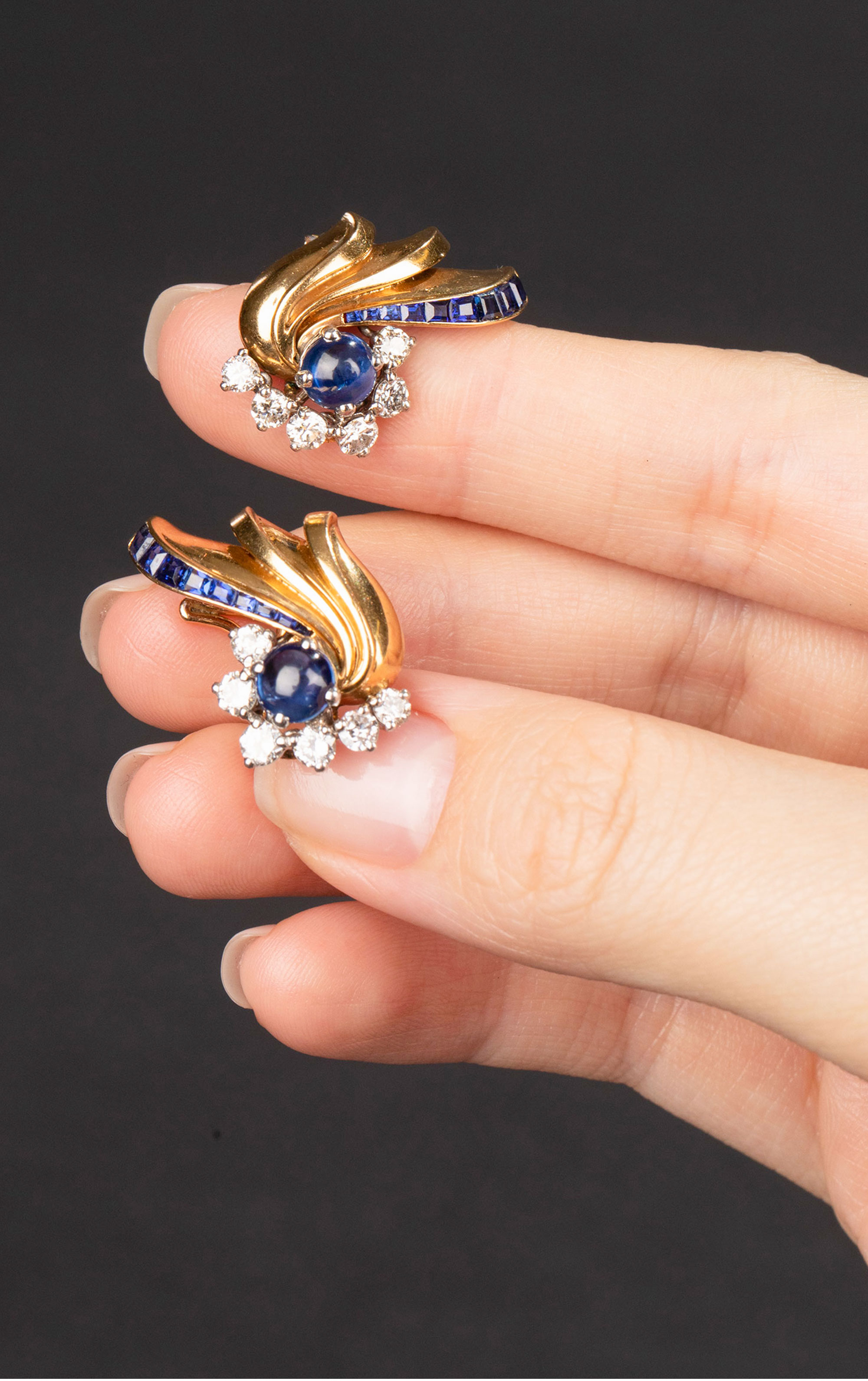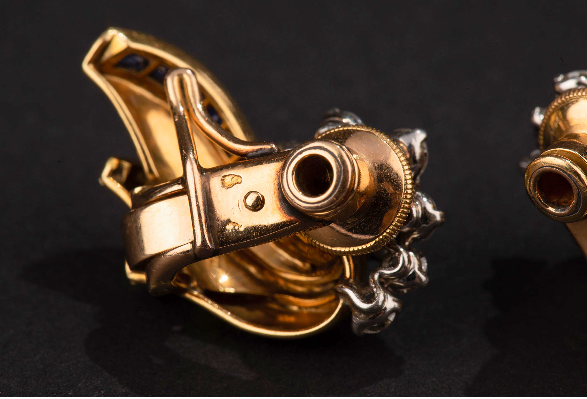 1940年代法国出品18K黄金铂金镶嵌钻石及蓝宝石耳夹一对