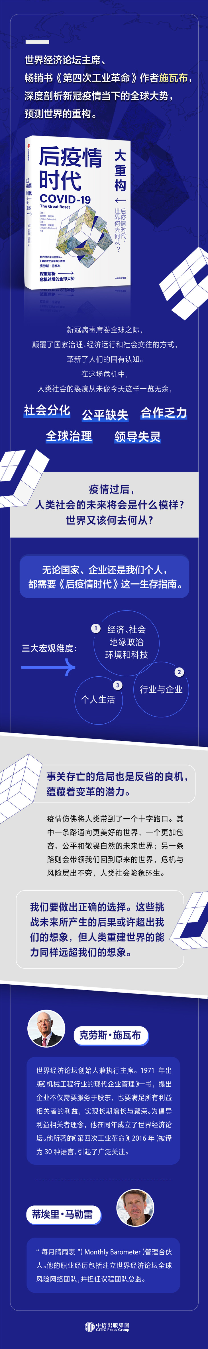 新冠病毒席卷全球之际,颠覆了国家治理、经济运行和社会交往的方式,革新了人们的固有认知。在这场空前危机中,人类社会的裂痕从未像今天这样一览无余,社会分化、公平缺失、合作乏力、全球治理与领导失灵等问题尤为明显,甚有人以“新冠纪元”作为新的纪年方式来凸显新冠疫情的决定性影响。在未知与恐惧中,人们不禁会问:疫情过后,人类社会的未来将会是什么模样?世界又该何去何从?鉴于此,世界经济论坛创始人克劳斯?施瓦布携手“每月晴雨表”管理合伙人蒂埃里?马勒雷适时地带来了《后疫情时代:大重构》一书,旨在为国家、社会、企业与个人在后疫情时代的发展道路指引方向。